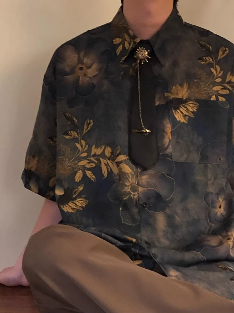 Summer American Trendy Casual Tops New Chinese Style Vintage Hong Kong Style Printed Short-sleeved Shirt Men's Loose Tops Chic