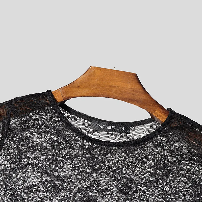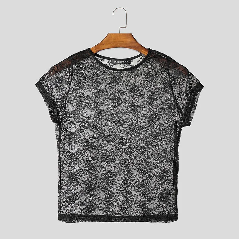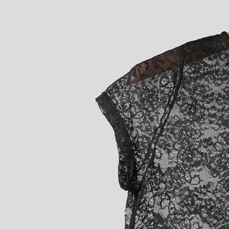 Summer Men T Shirt Lace Transparent O-neck Sleeveless Sexy Crop Tops Men Tees Streetwear 2025 Fashion Men Clothing S-5XL