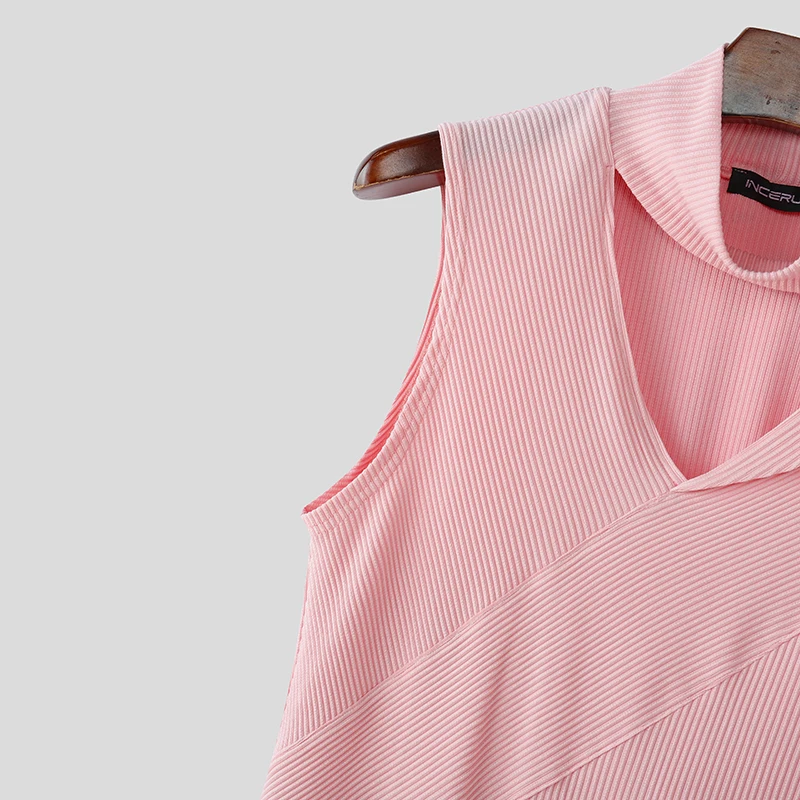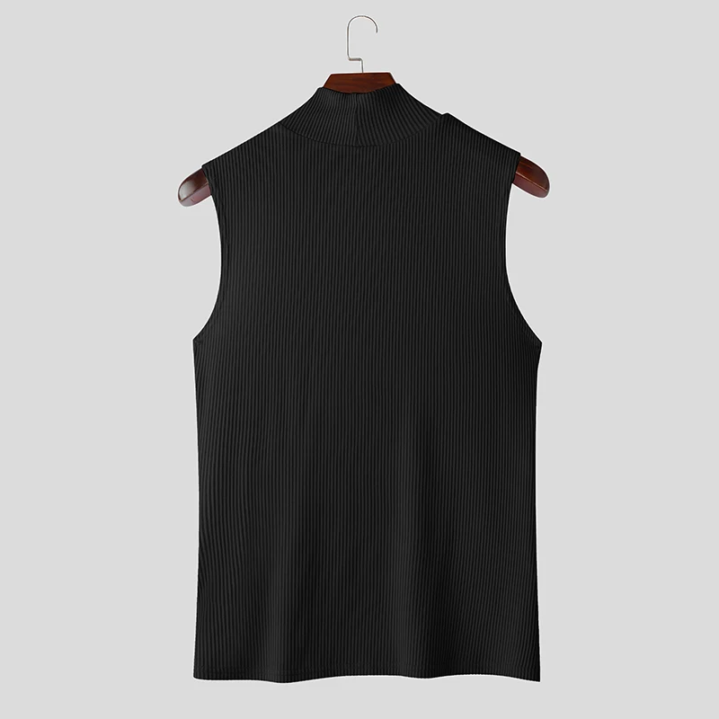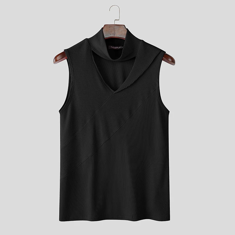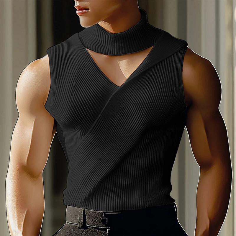 Summer Men Tank Tops Solid Color Knitted Turtleneck Sleeveless Male Vests Tops Hollow Out Sexy Men Clothing Streetwear