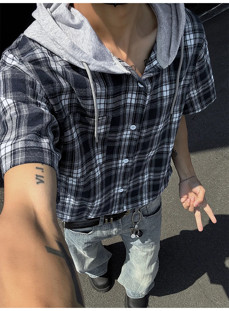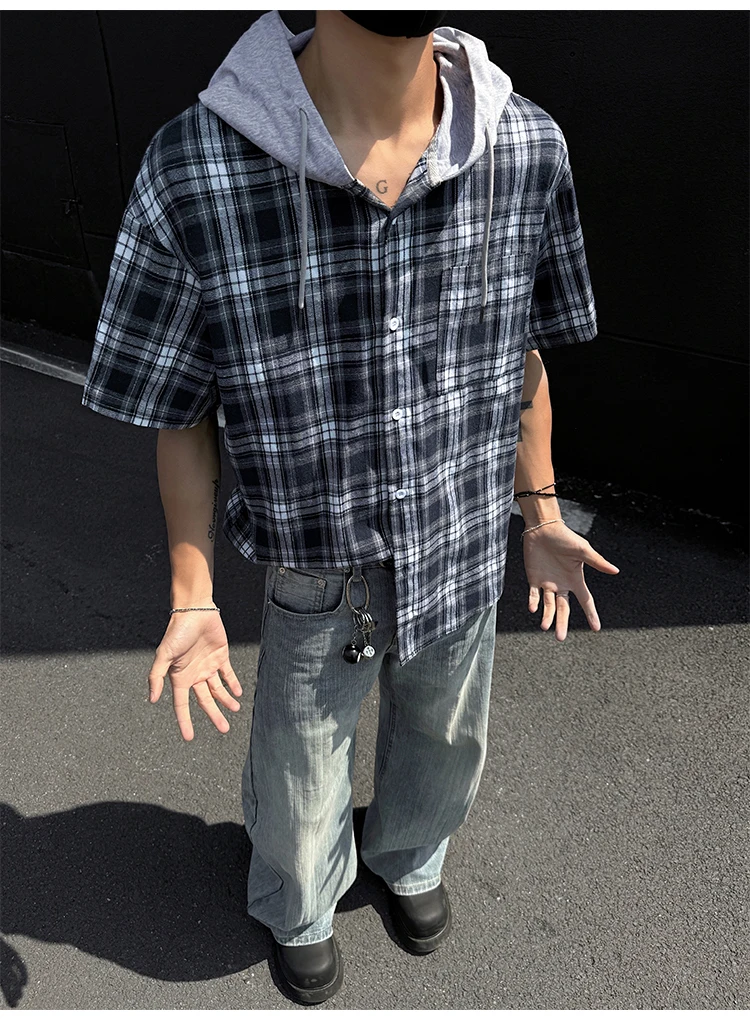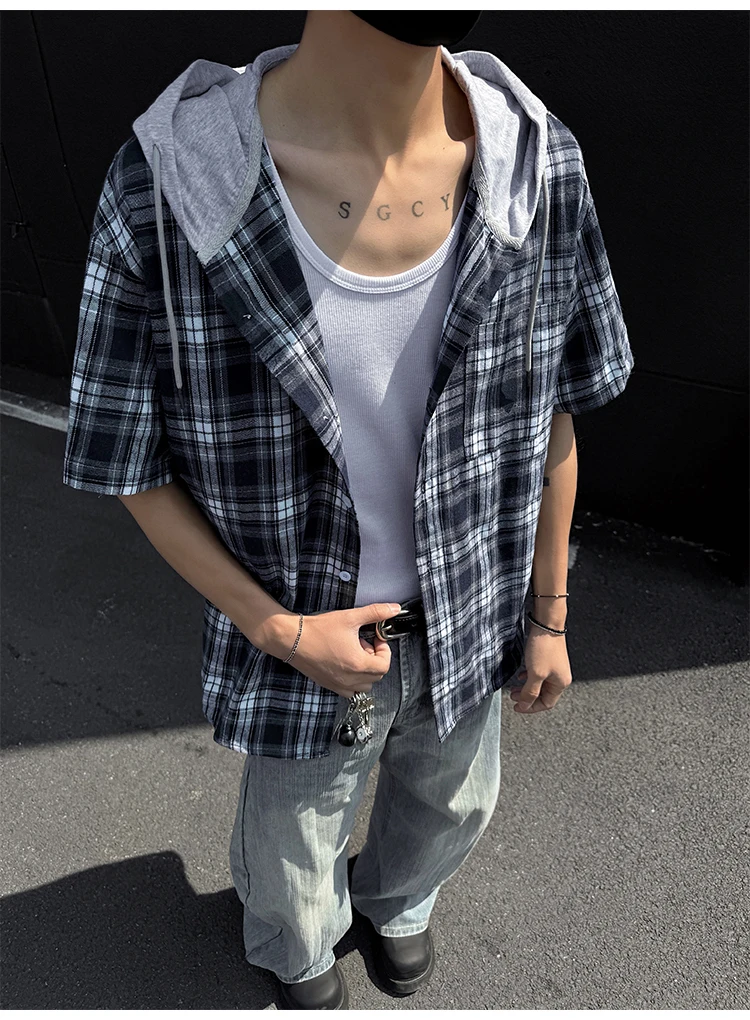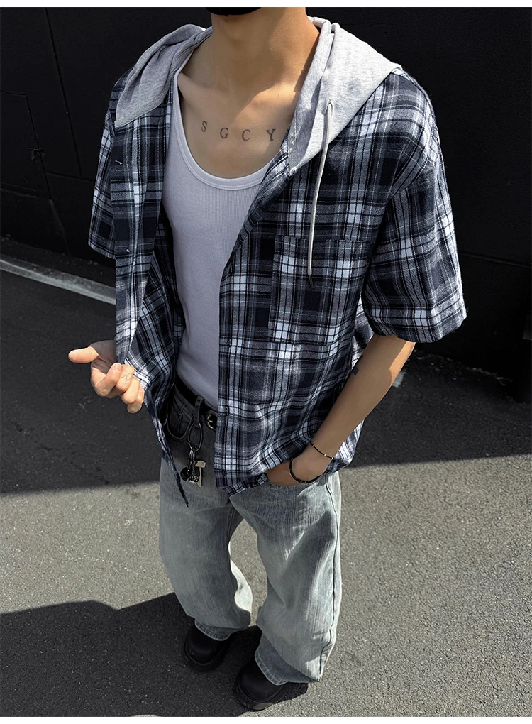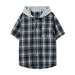 Summer Short Sleeved Shirt Men Fashion Retro Casual Hooded Shirt Men Streetwear Korean Loose Plaid Shirts Man Large Size 4XL