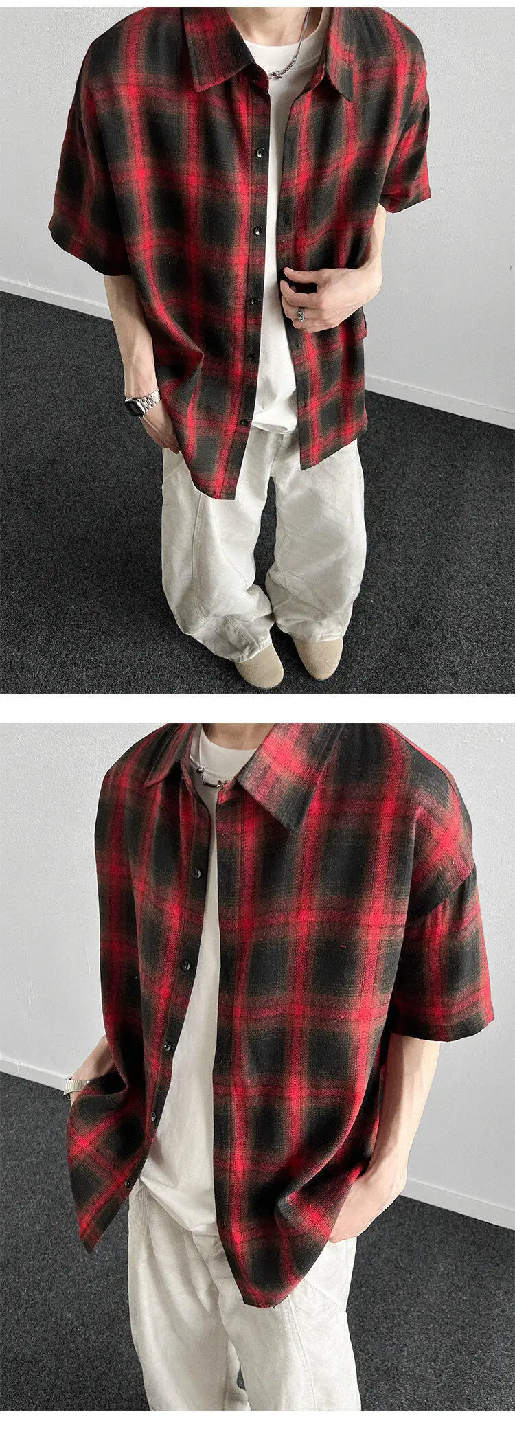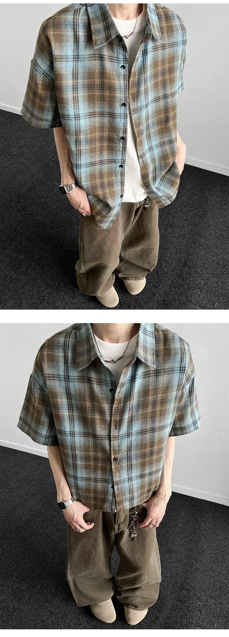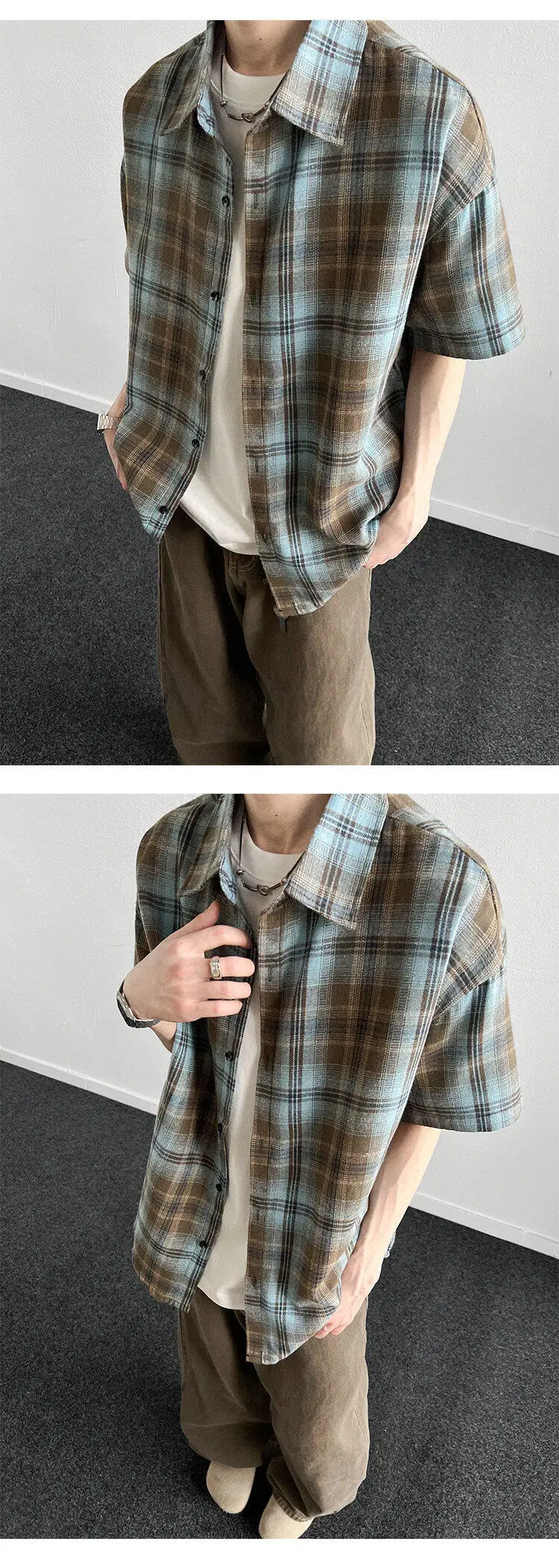 Summer Short Sleeved Shirt Men Fashion Retro Casual Shirt Men Japanese Streetwear Loose Plaid Shirt Mens Vintage Shirts M-3XL