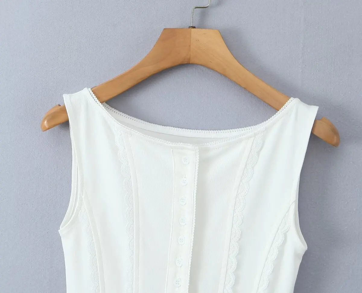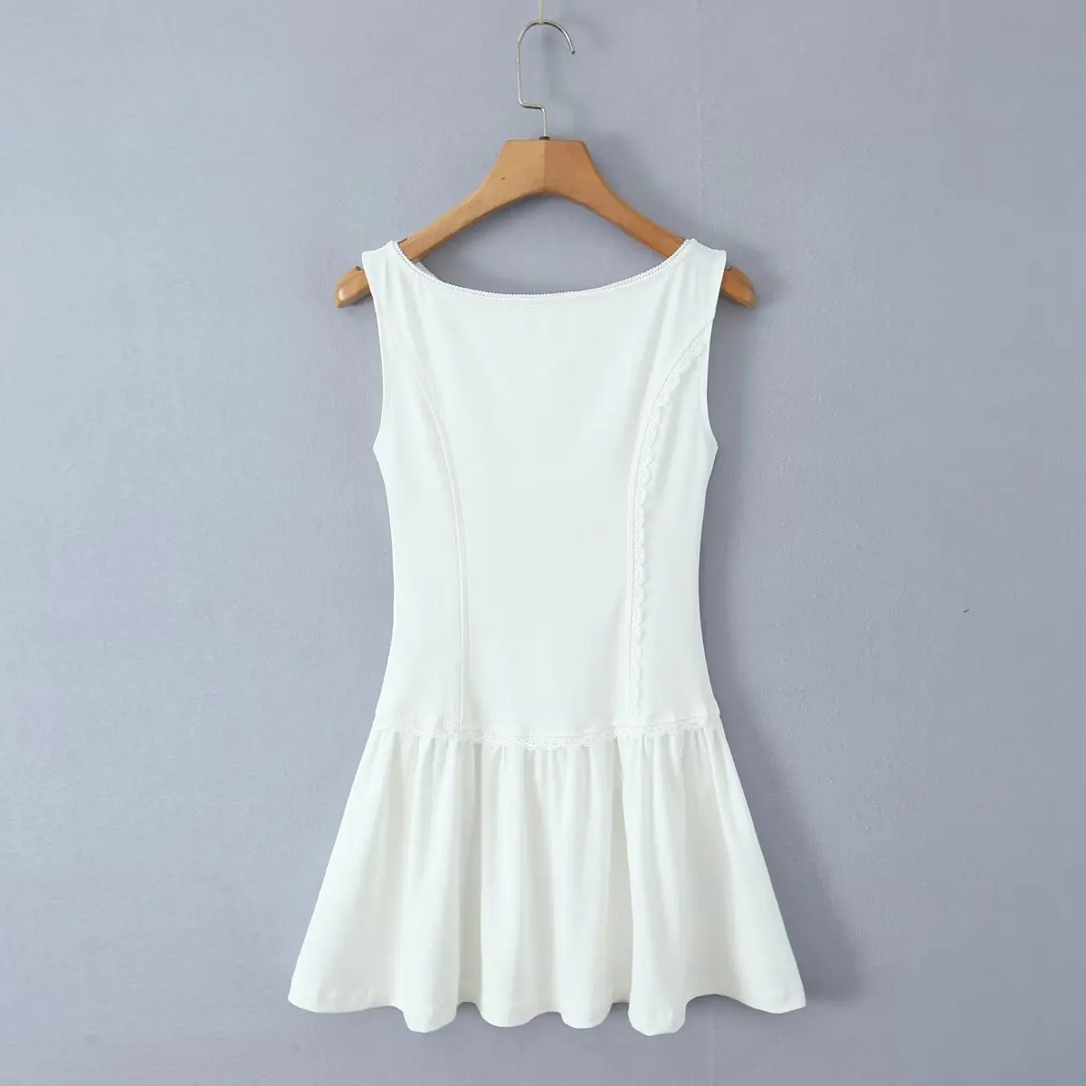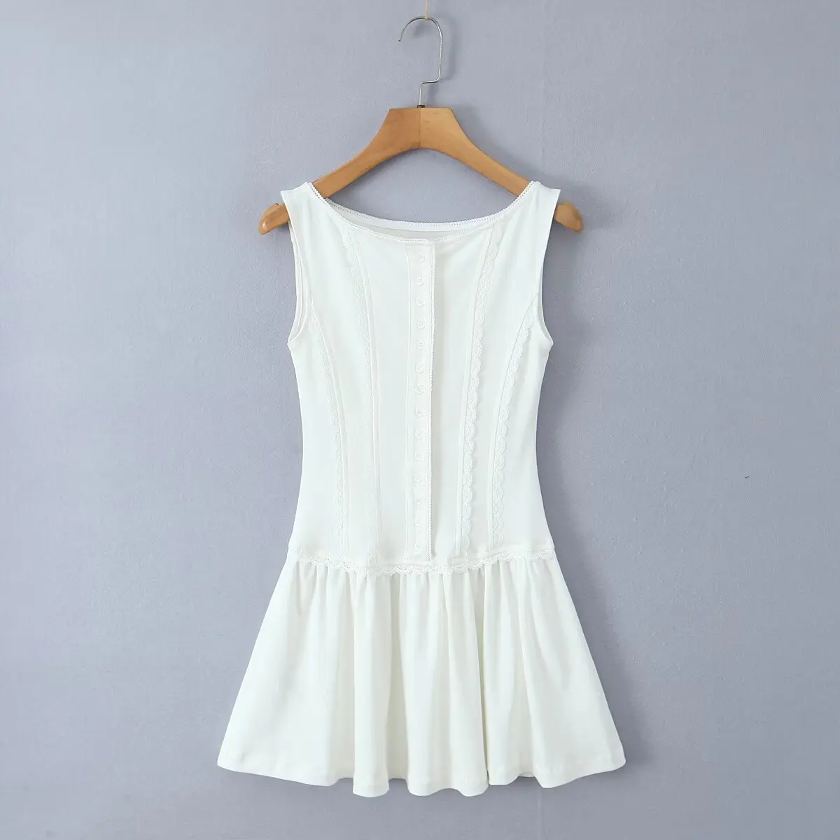 Summer Women Front Button O Neck Sleeveless Dress Lace Trim Sexy Low Waist A-line Mini