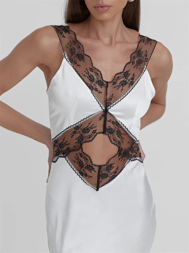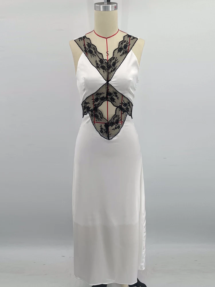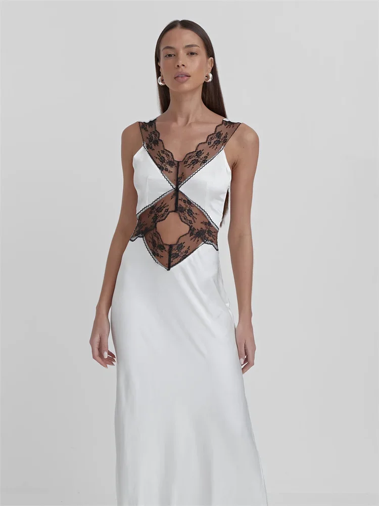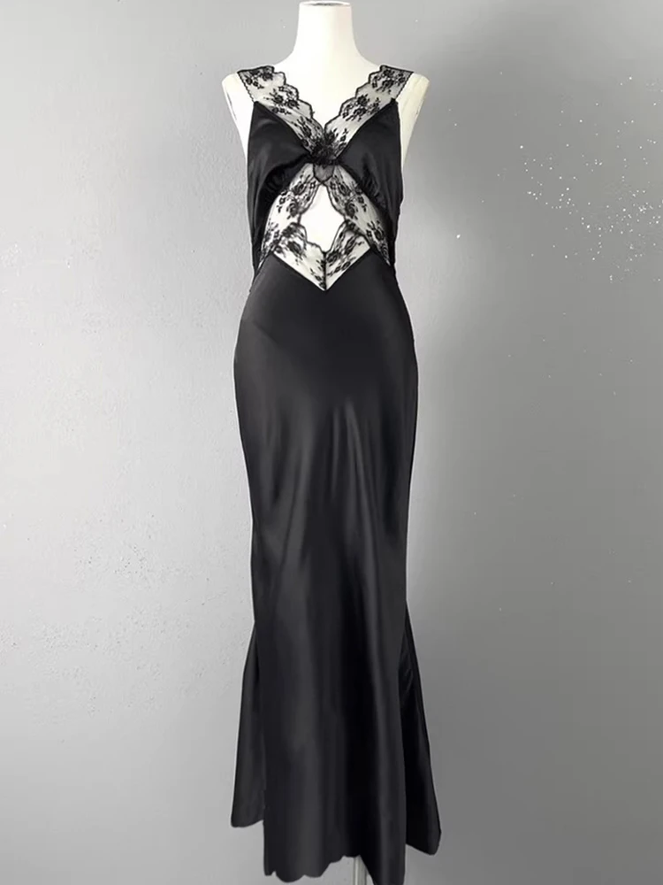 Elegant Lace Backless Hollow Maxi Dress For Women V Neck Patchwork Fashion Print High Waist Party Dress Female Long Dress