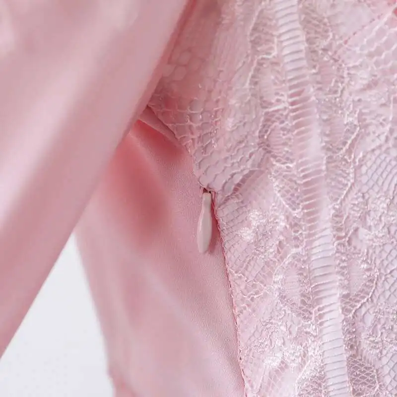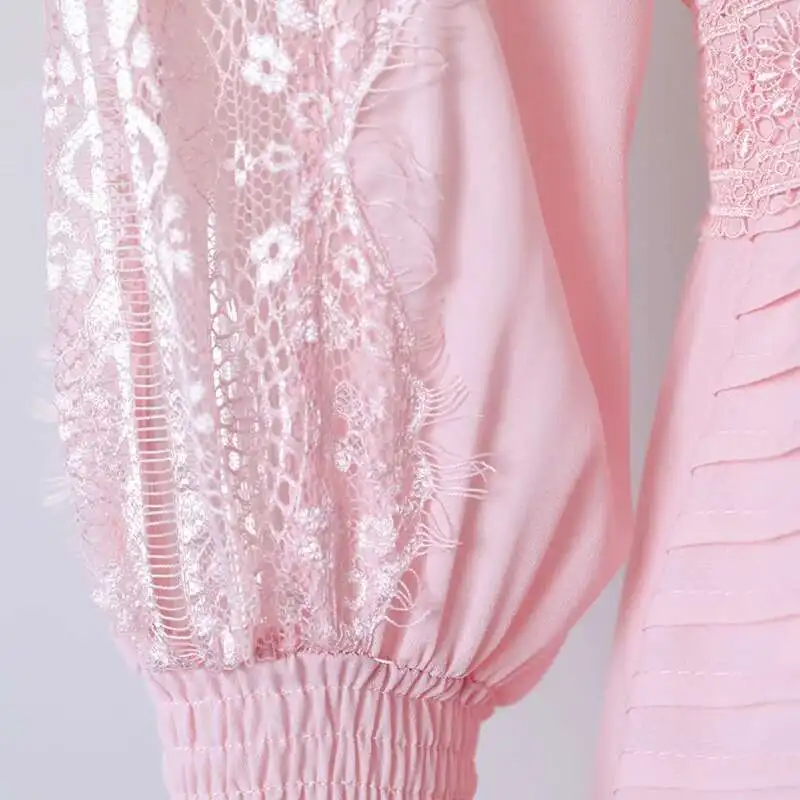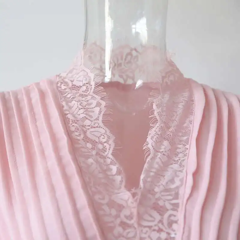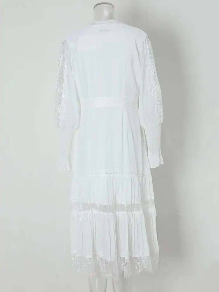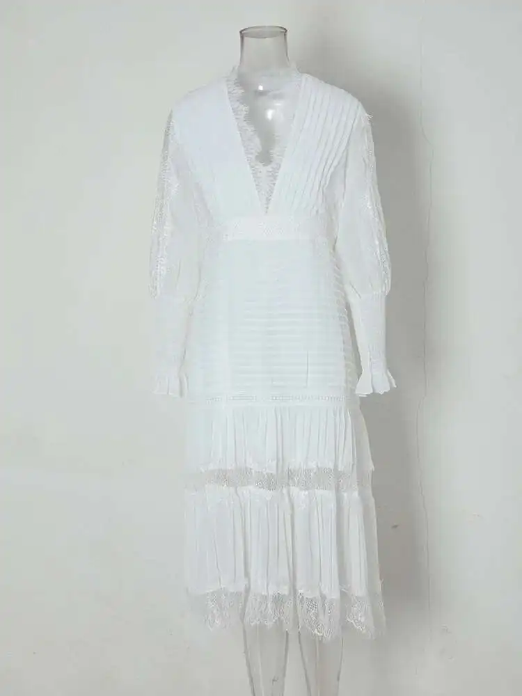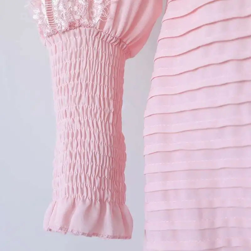 V-neck Lantern Sleeve Lace Stitching Midi Dress Female Clothing Slim Party Dresses For Women Elegant 2025 Summer New