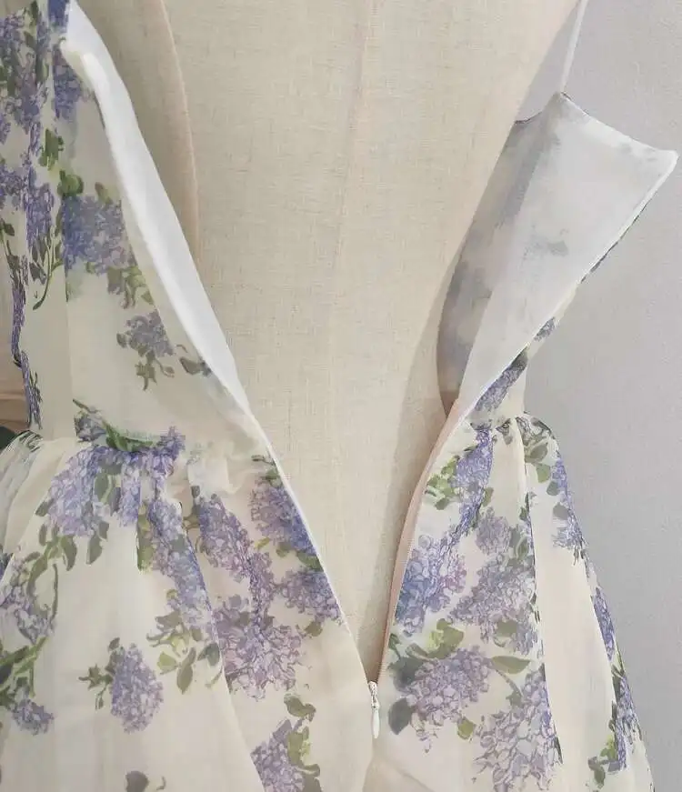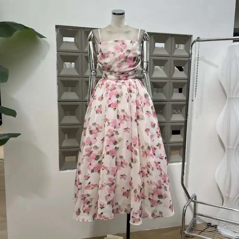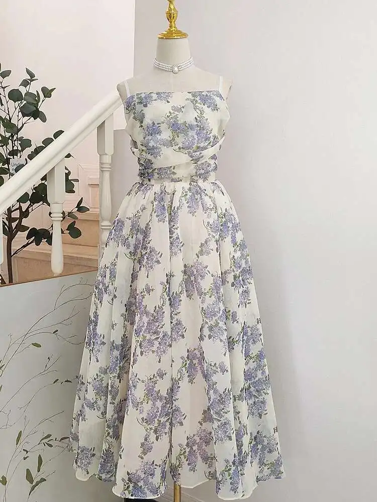 Vintage Printing A-line Folds Sling Dresses For Women Summer New High Waist Backless Pleated Long Dress