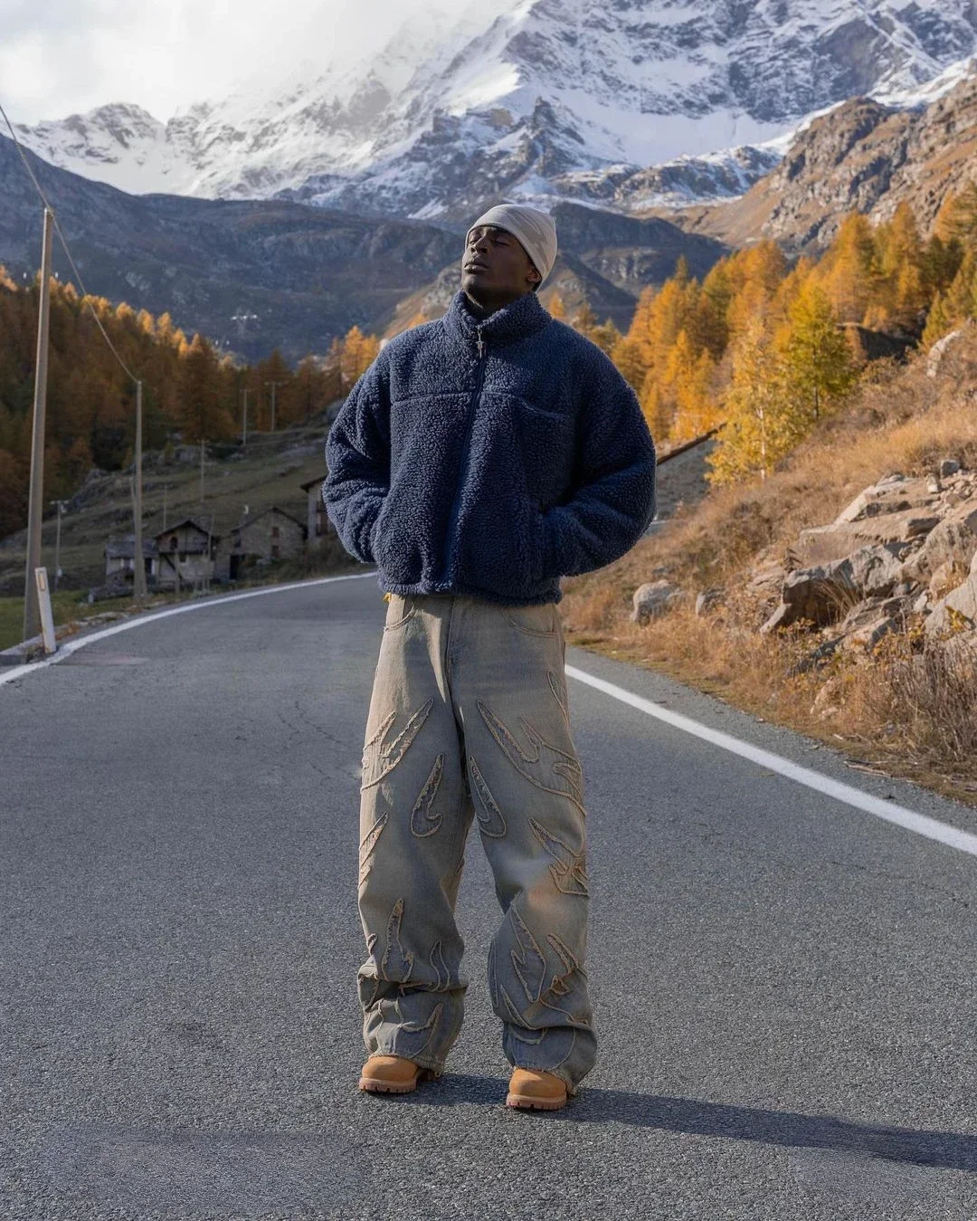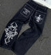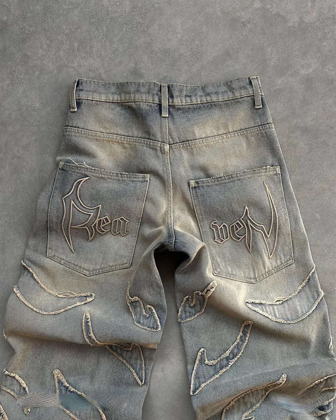 Vintage Raw Edge Embroidery Denim Pants Women Streetwear Distressed Patchwork Baggy Jeans for Men Y2k Straight Wide Leg Trousers