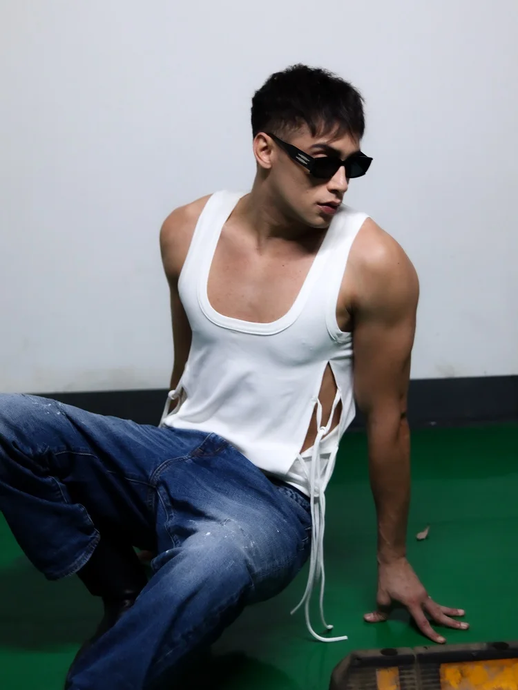 2024 Knitted Elastic Tank Tops Men's Personalized Split Lace Trendy Square Neck Original Design Sleeveless T-shirt