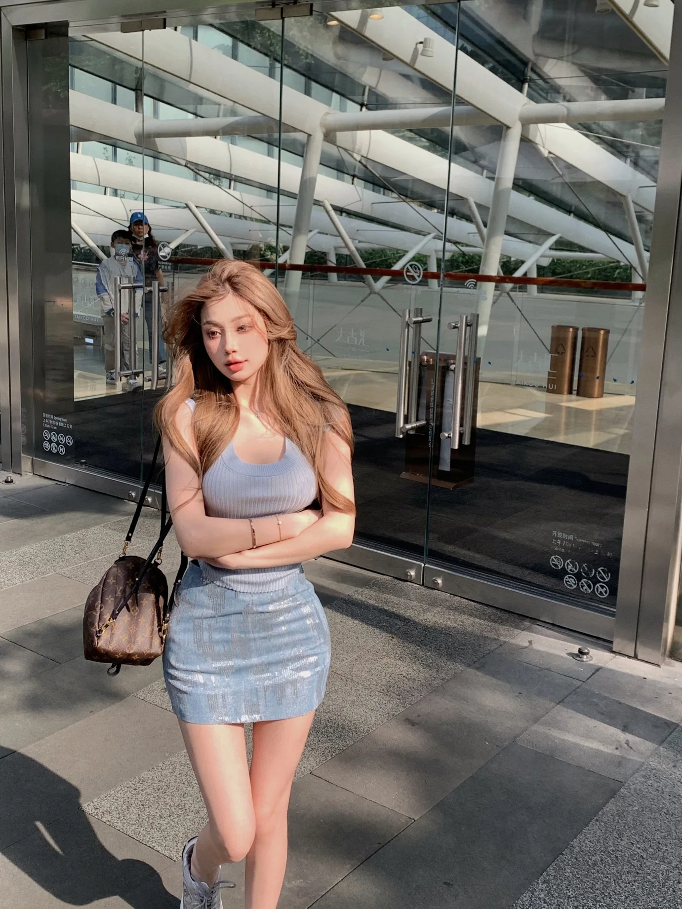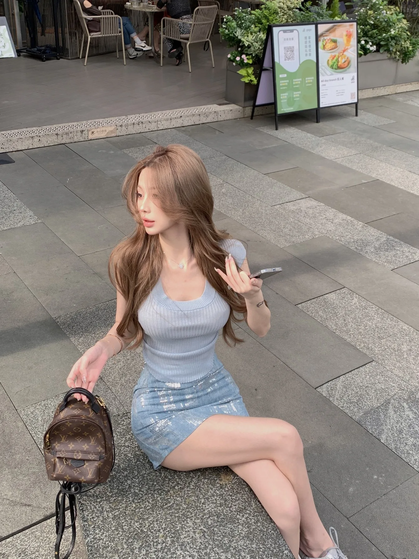 2024 Spring New High Street Fashion Sequin Denim Mini Skirt Women + Solid Color Sexy Slim Knitted Camisole Two-piece Suit