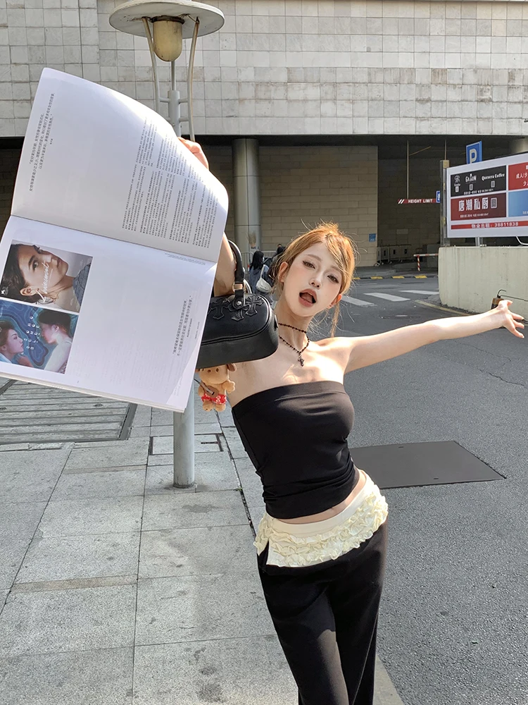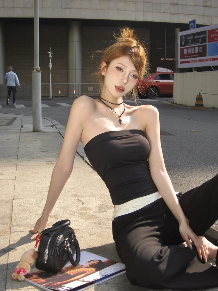 2024 Spring New Streetwear Contrast Color Patchwork Pleated Casual Wide Leg Pants Women + Sexy Camisole Two-Piece Suit
