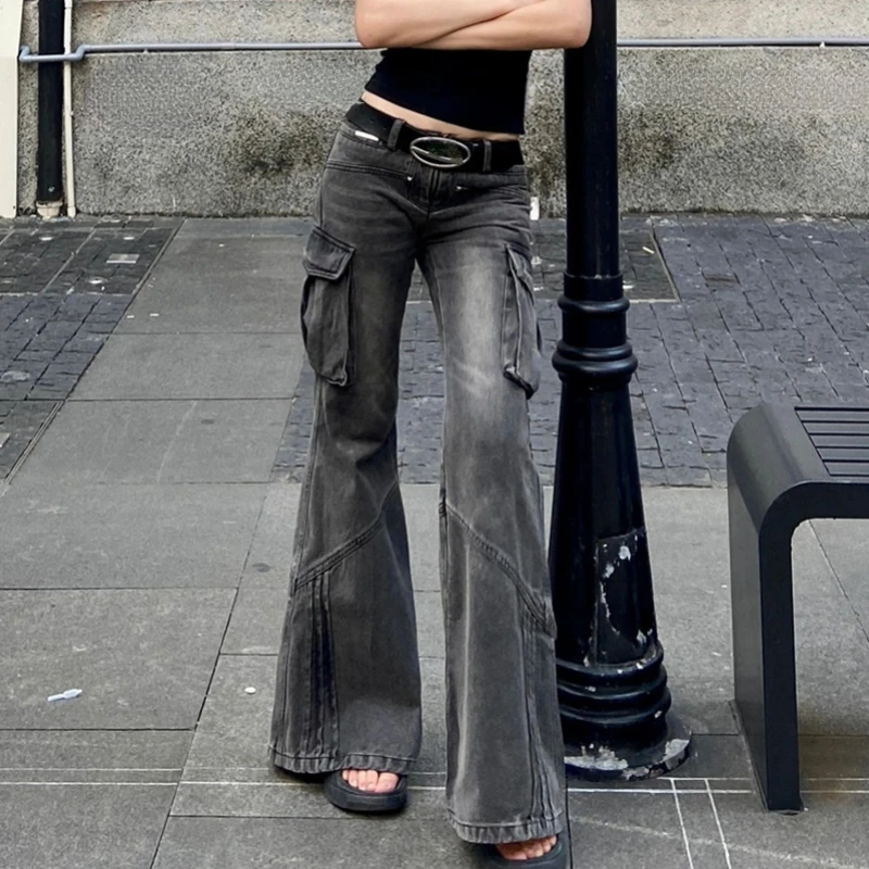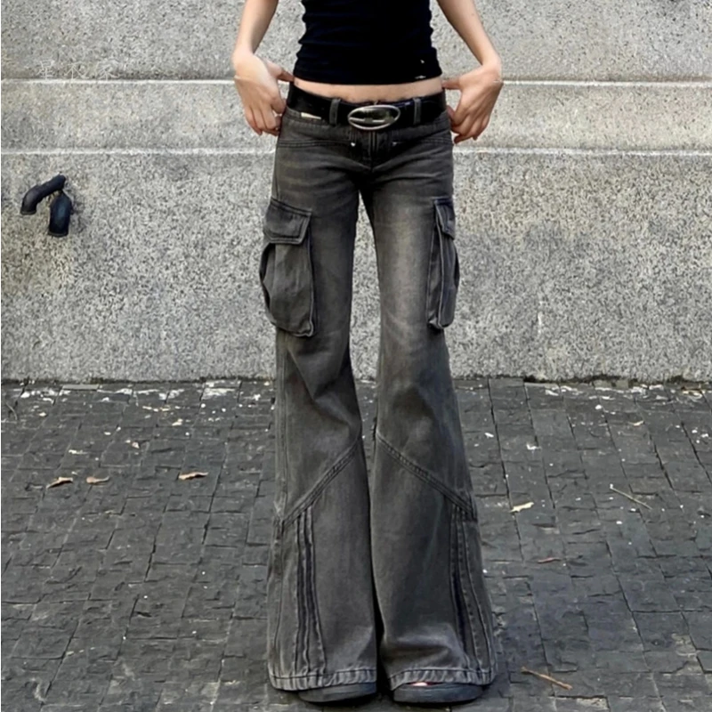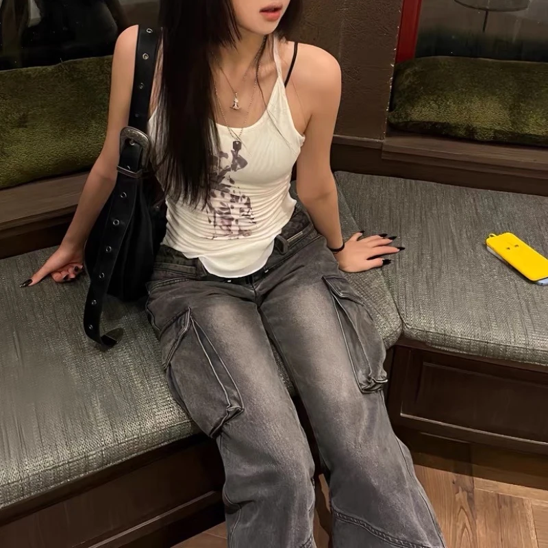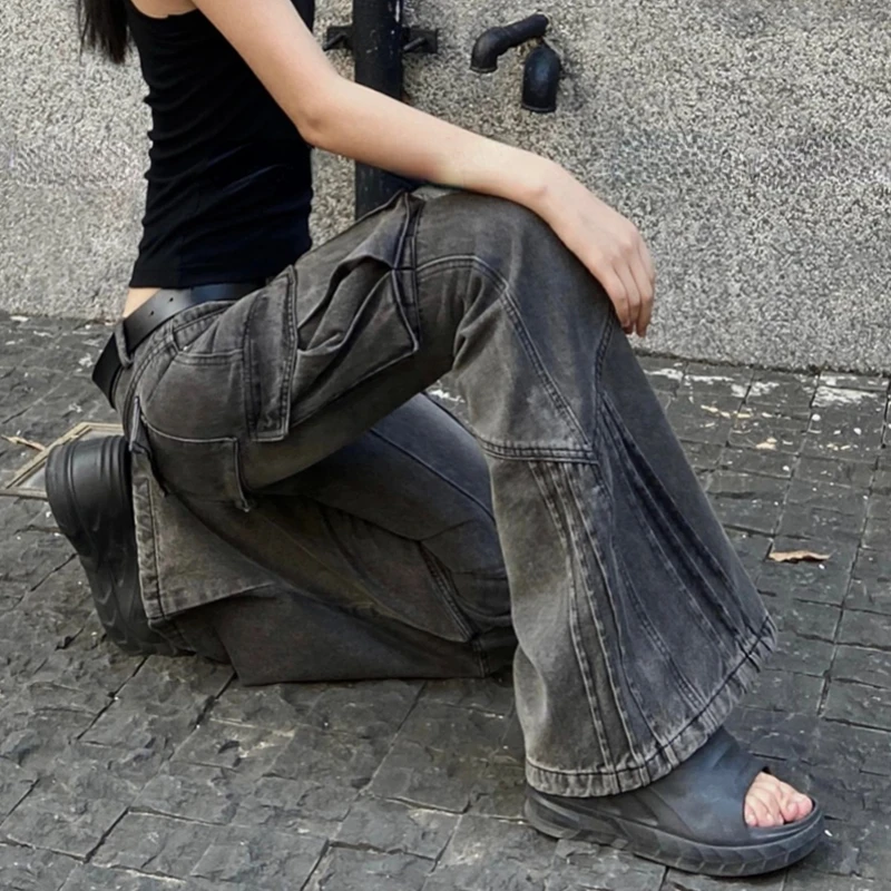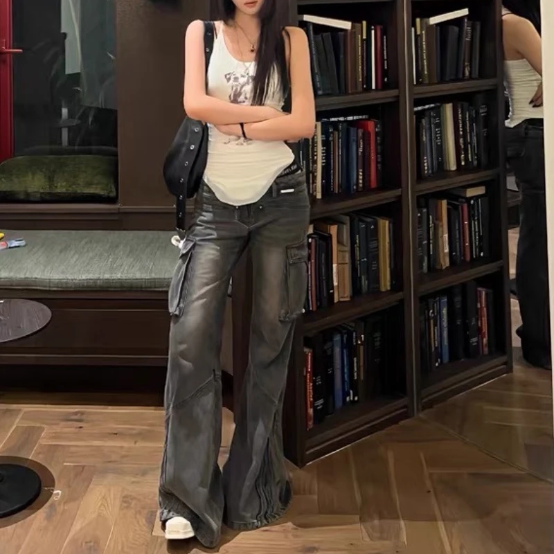 American Retro Pleated Pockets Loose Casual Wide Leg Jeans Women 2024 Spring New Low Waist Washed Distressed Cargo Pants