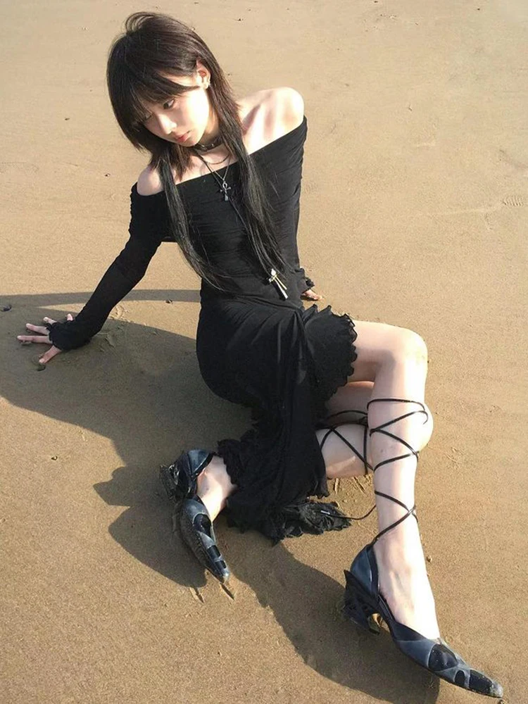 Black Slash Neck Party Dresses Elegant Fashion Ruffled Side Slit Slim Long Dress Off Shoulder Women Vacation vestidos