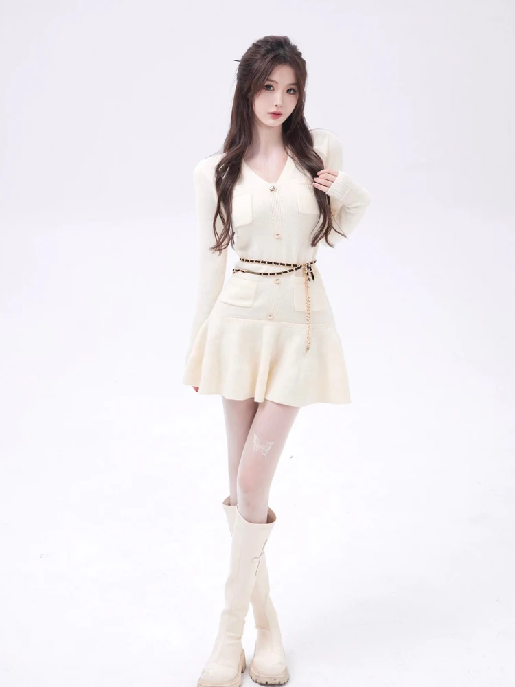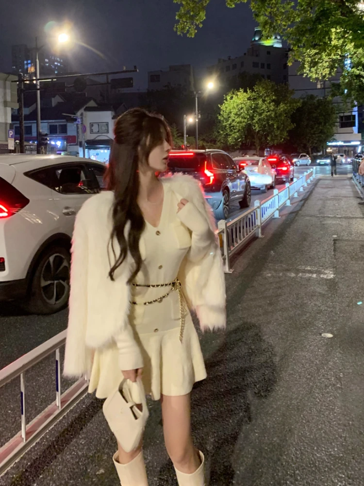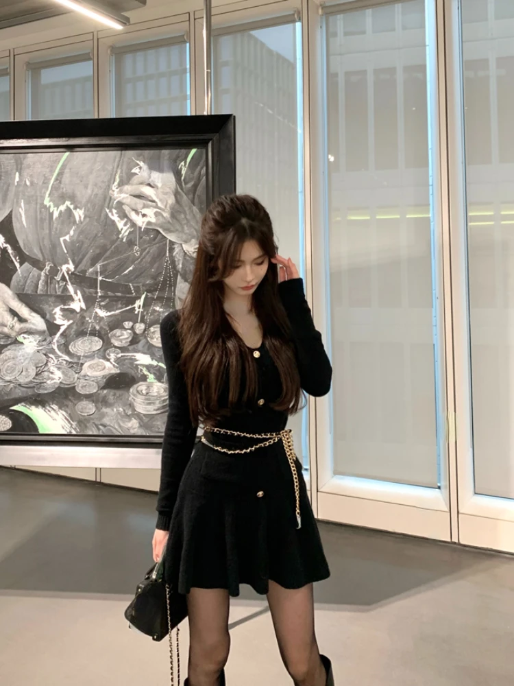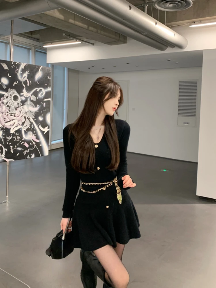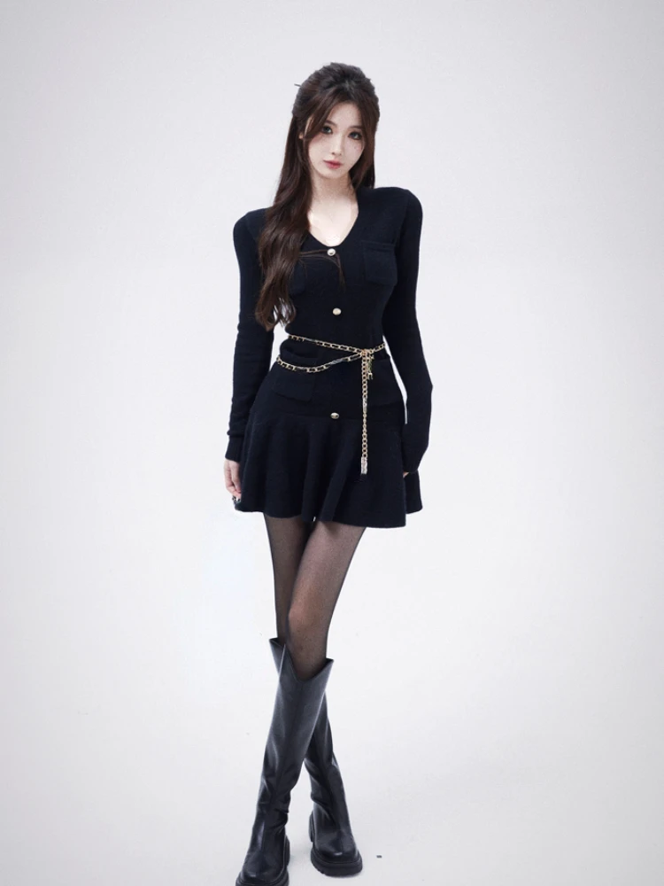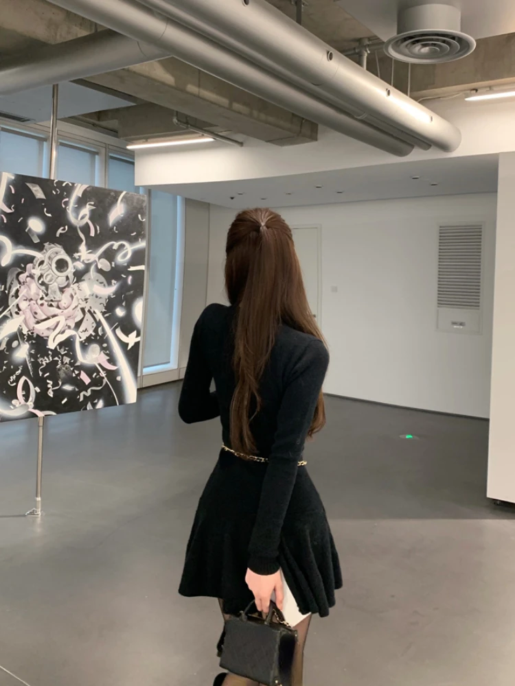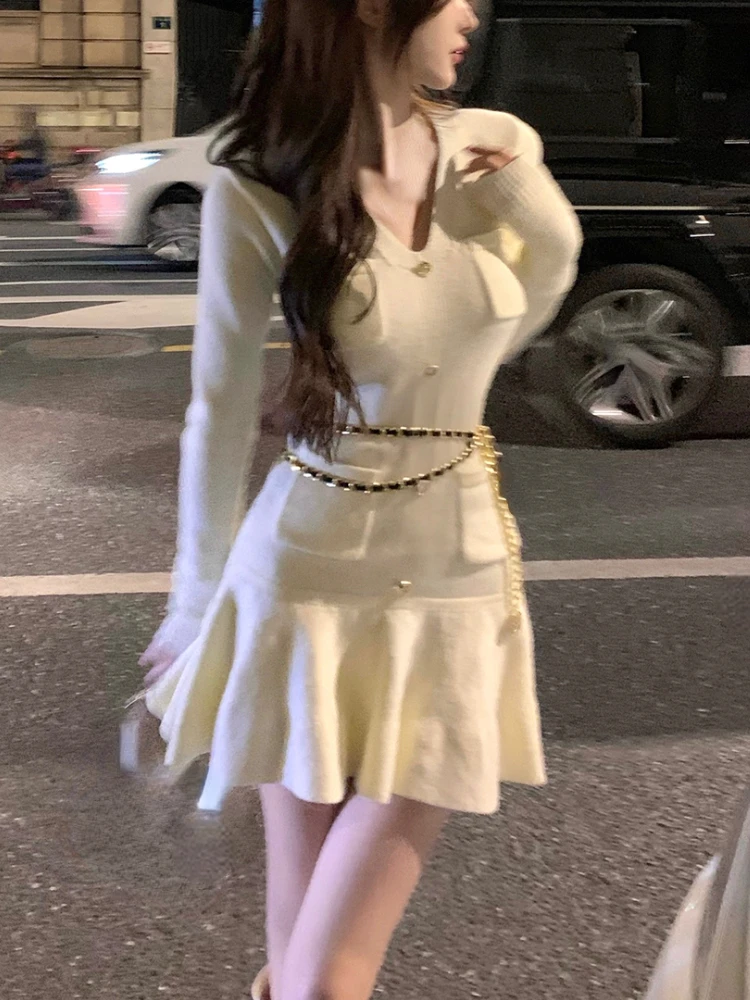 Casual Autumn White Knitted Sweater Mini Dress Women Black Elegant Lady Dresses Fashion Party Pure Color One Piece Dress
