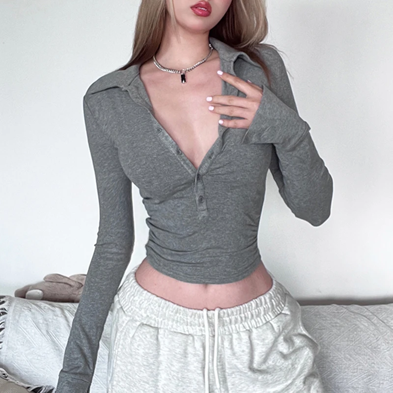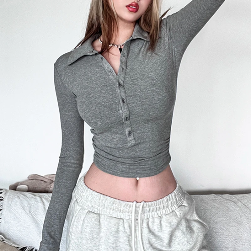 Casual Basic Button-up Turn-down Collar Knitted Cropped Top Women Chic Elegant Slim-fit Long Sleeve T-shirts Autumn Tee