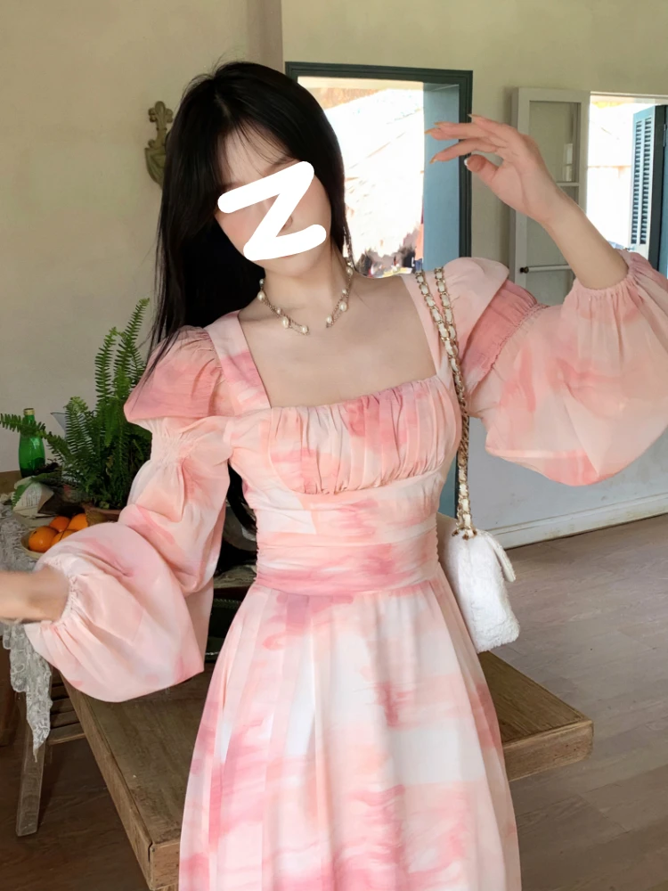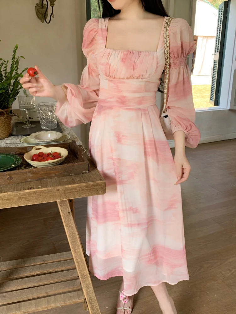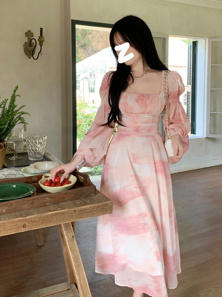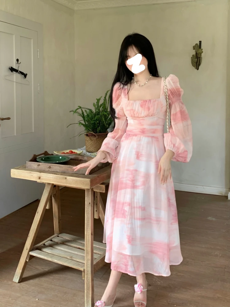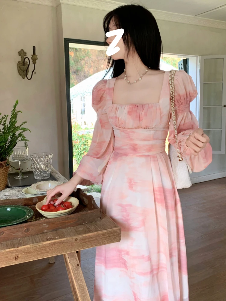 Chiffon Long Sleeve Floral Midi Dress Chic French Slim Elegant Women Dress Casual Fashion Beach Style Office Lady Dresses