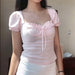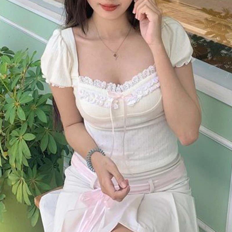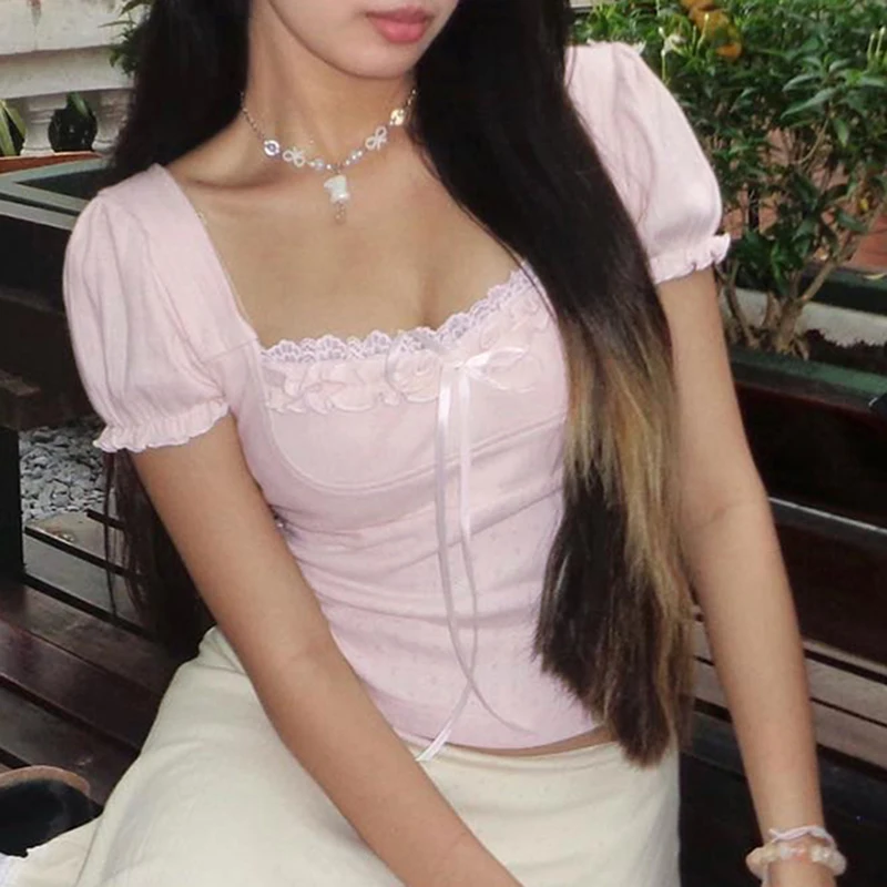 Cute Frill Lace Bow Decorate Top Women's Summer Puff Short Sleeve Square Collar T-shirts Y2K Aesthetic Tees Coquette