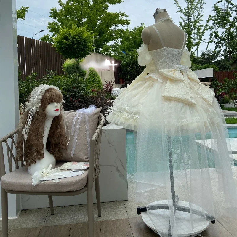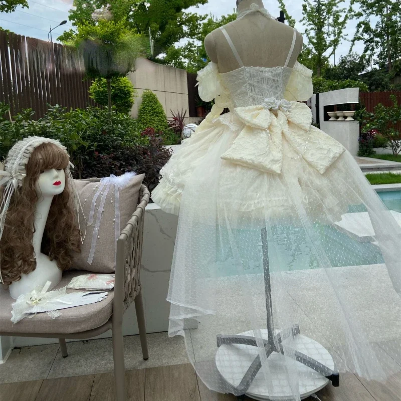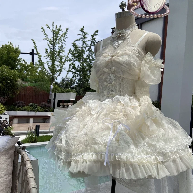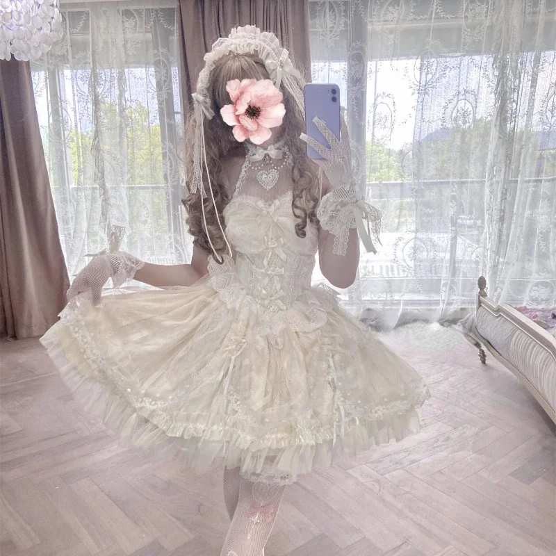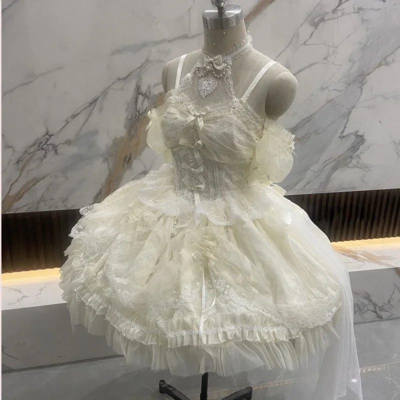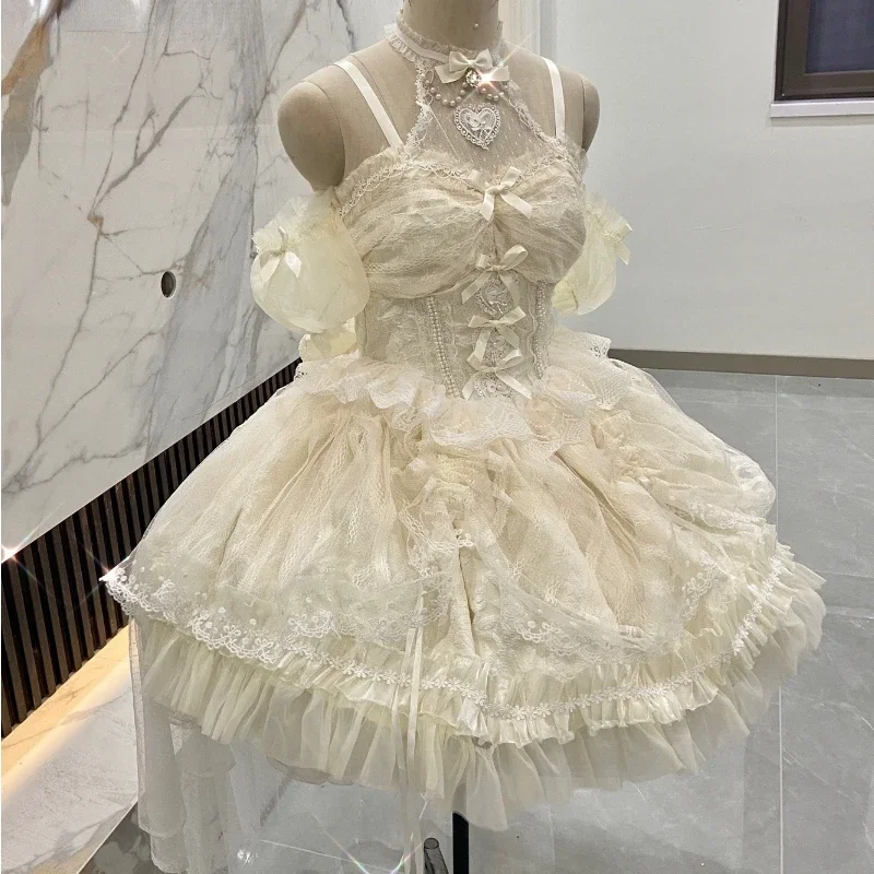 Elegant Japanese Sweets Lolita Jsk Dresses Kawaii Women Vintage Lace Mesh Princess Strap Dress Harajuku Lolita Cosplay Clothing
