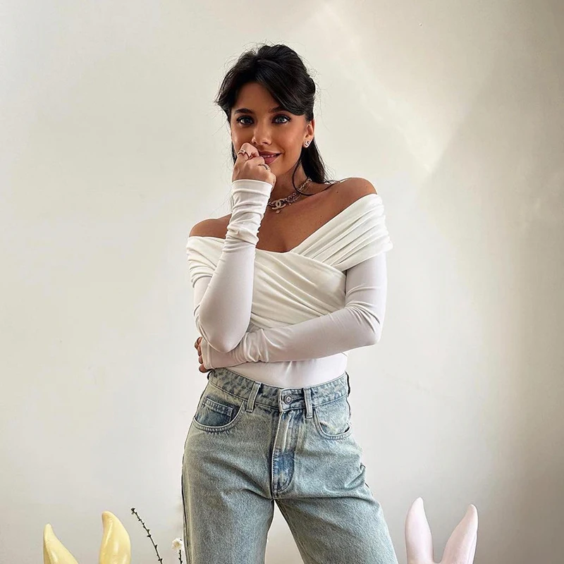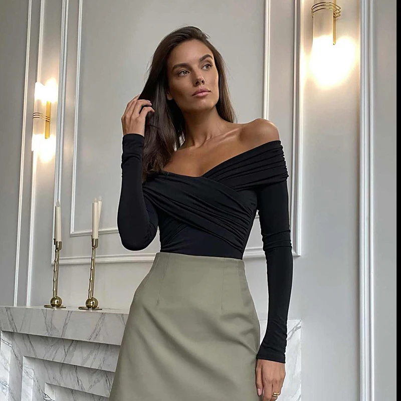 Fashion Cross V Neck Tops for Women Off Shoulder Sexy Long Sleeves T-Shirt Streetwear Ladies Black Slim Tee Shirt Korea