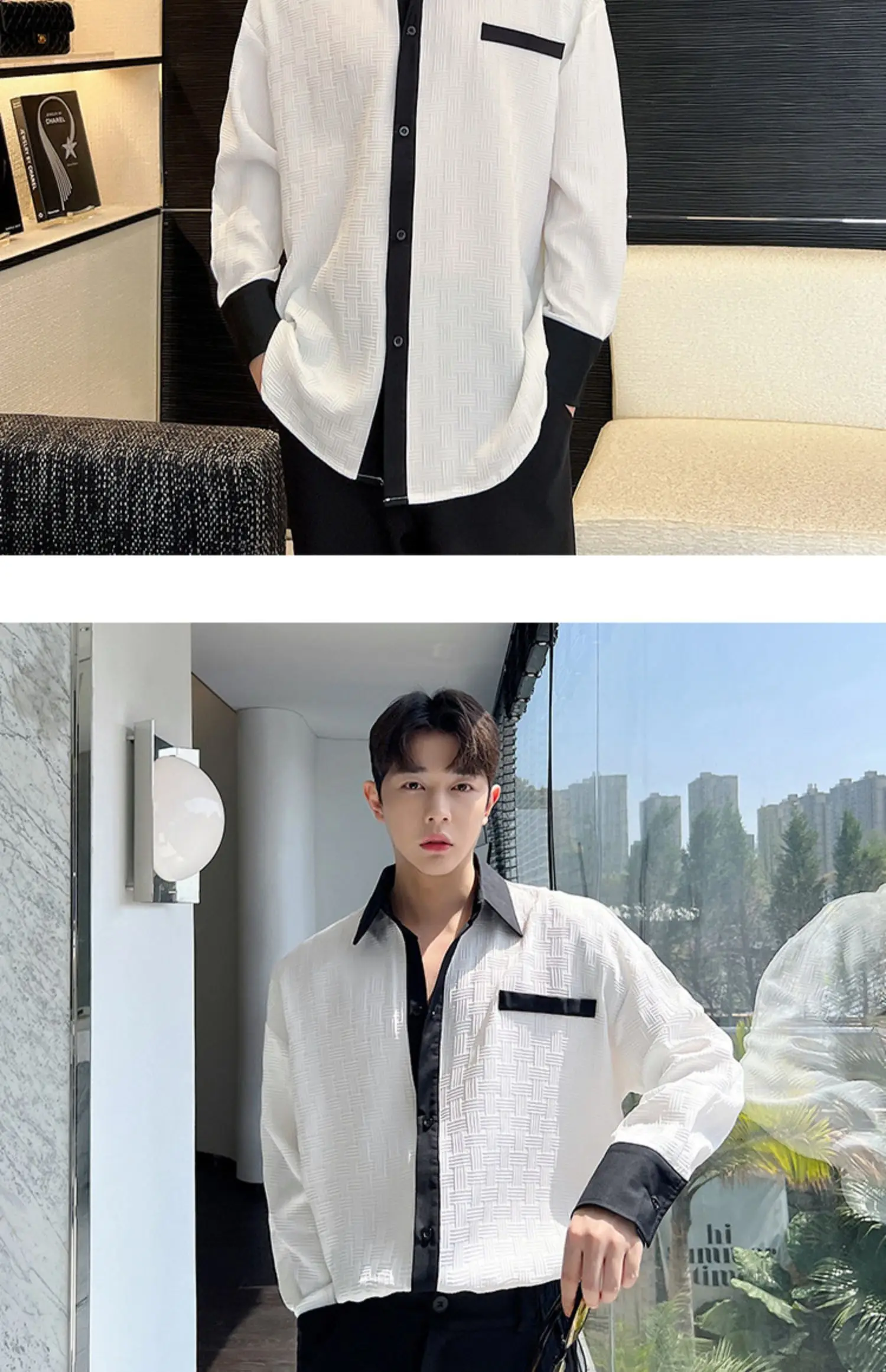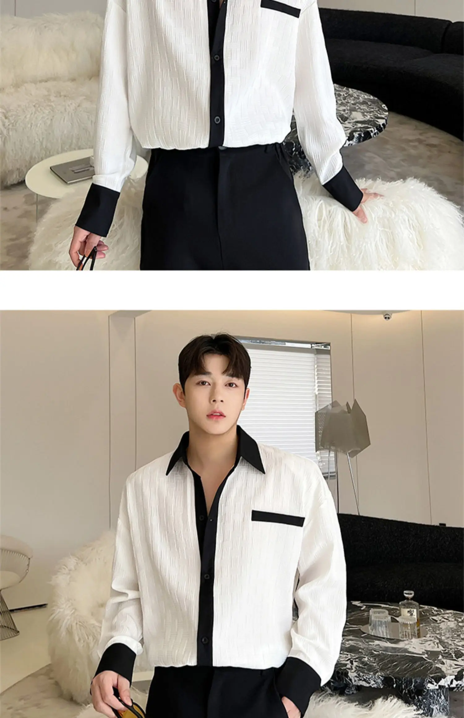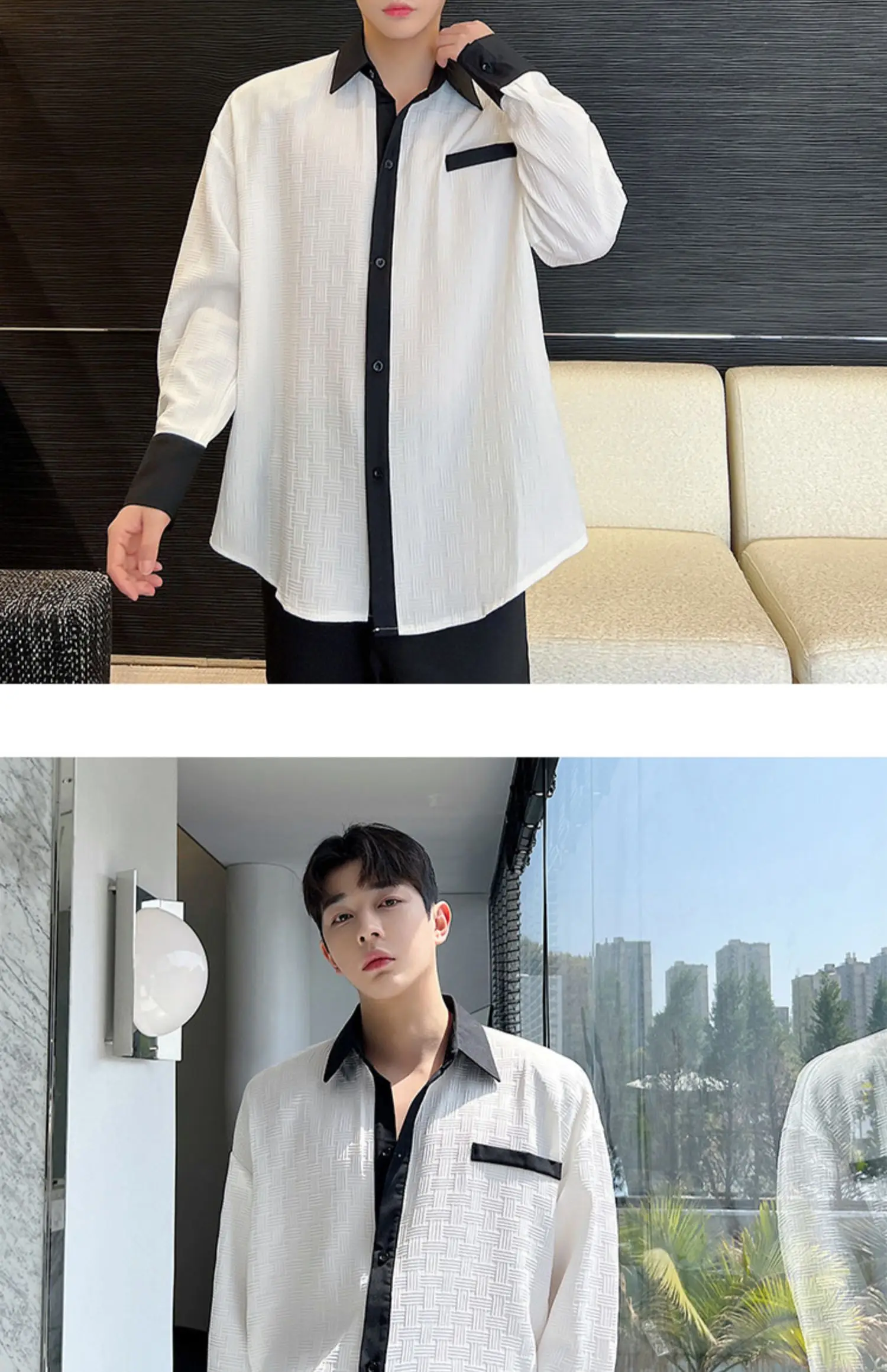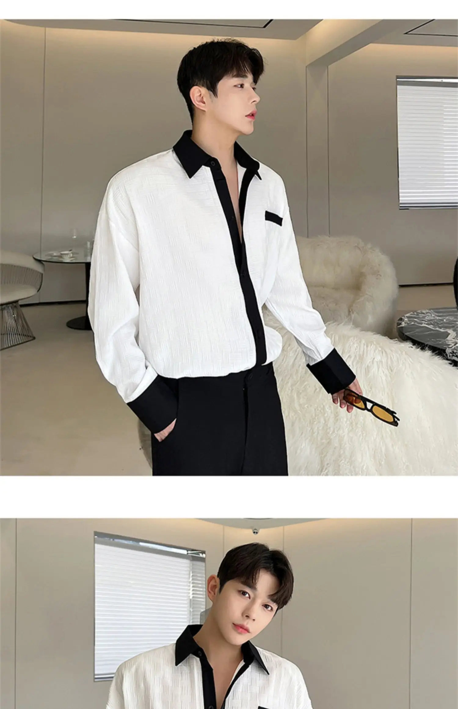 Fashion Korean Shirt Long Sleeve Color Contrast Design Edge Men's Elegant Trendy 2024 Spring Casual Loose Tops New