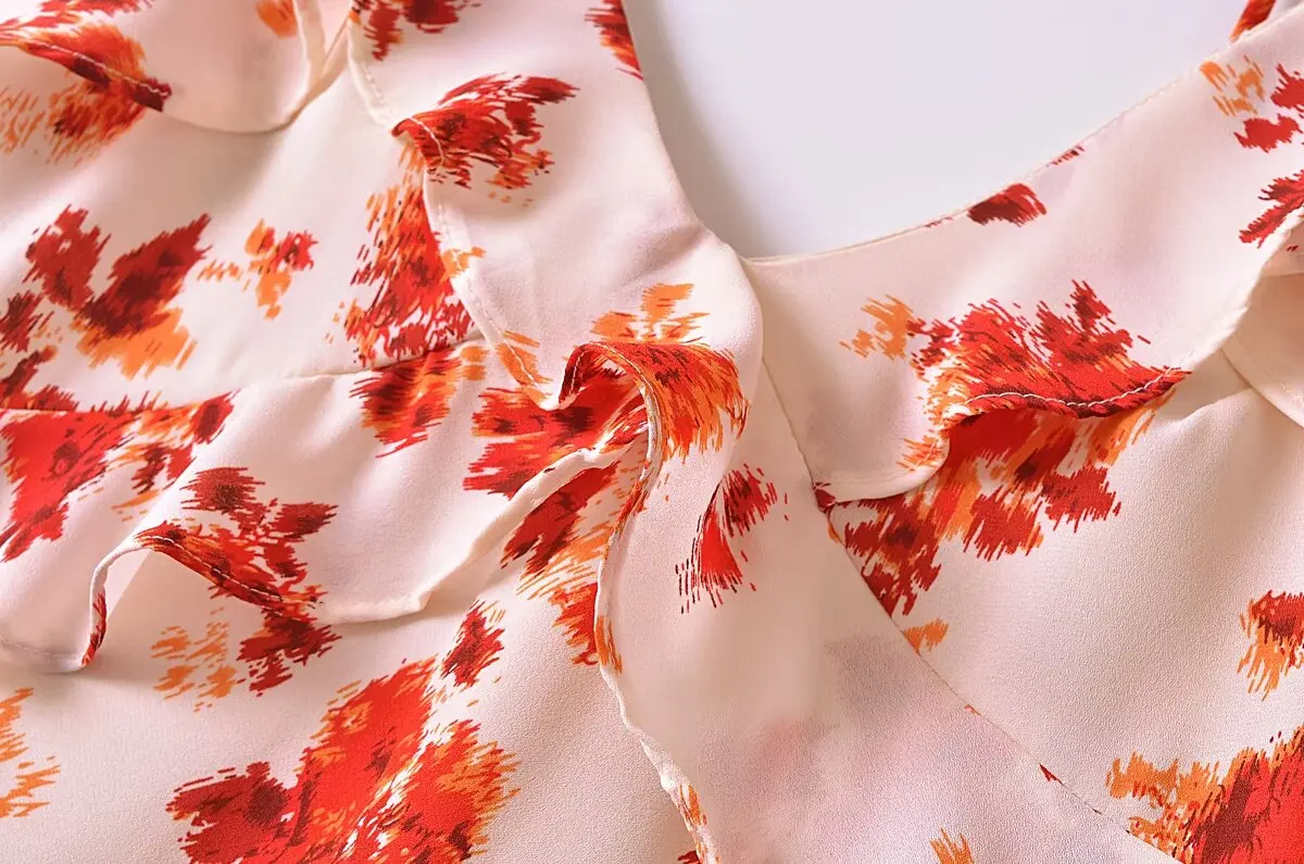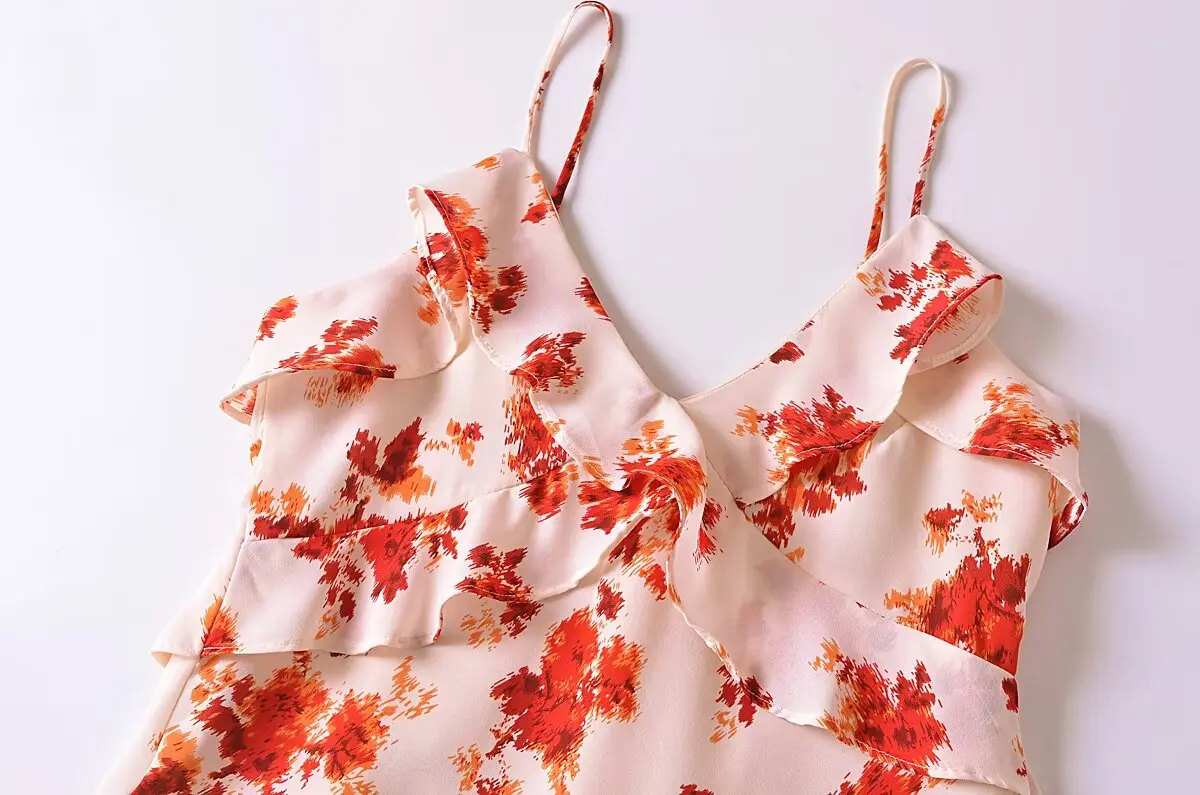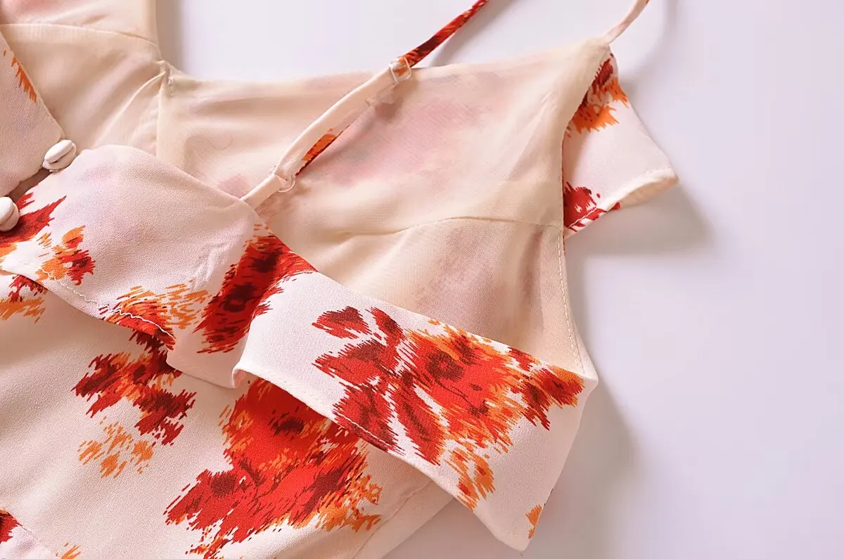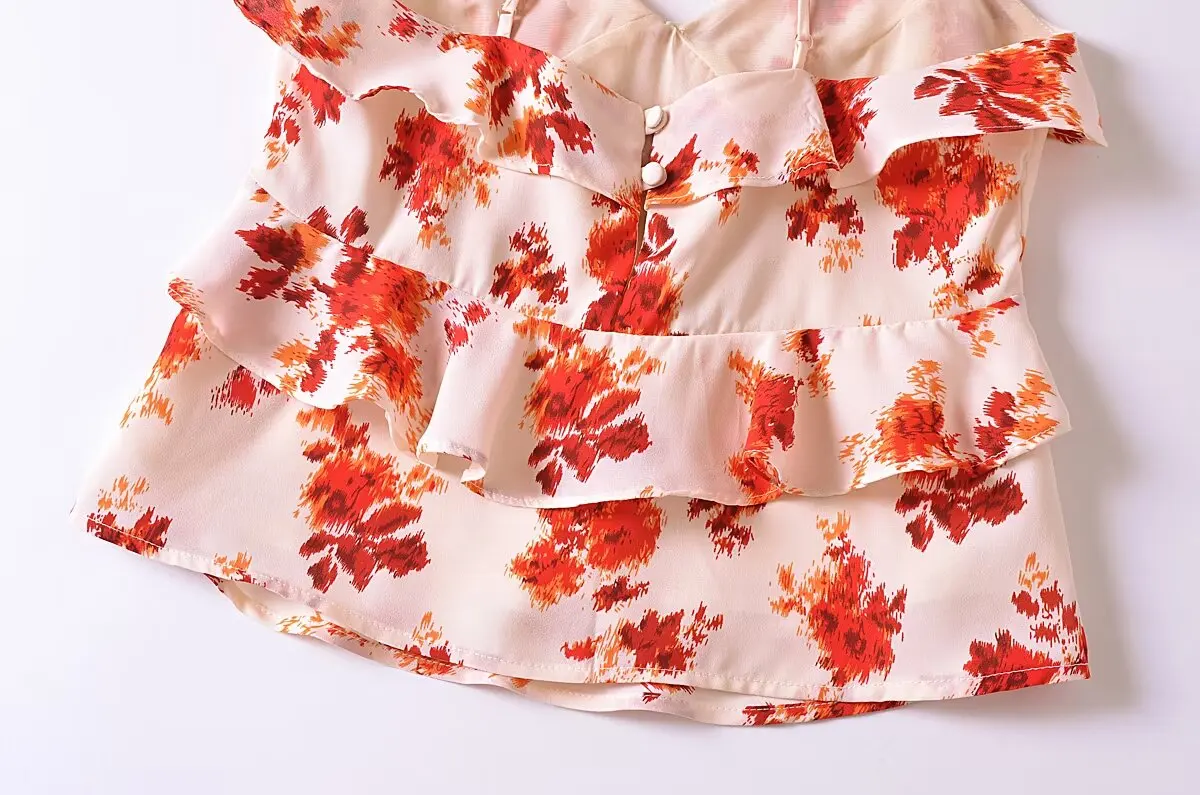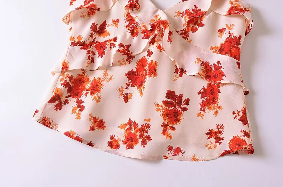 French Style Floral Print Ruffle Camis Women Sexy Sleeveless V Neck Summer Crop Top