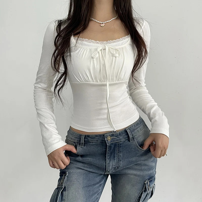 Gentle Elegant Lace Patchwork Knitted Cropped Top White Coquette Slim Long Sleeve T-shirts Fall Cute Casual Knitwear