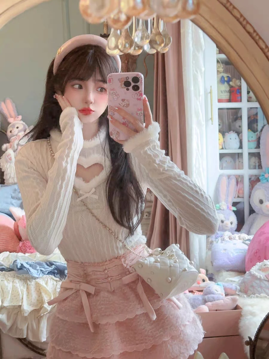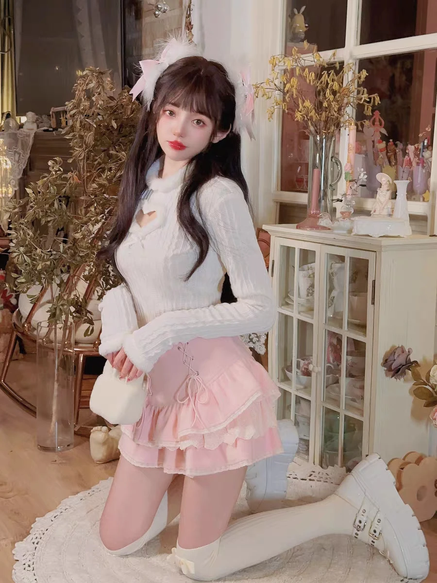 Heart Design White Pink Japanese Kawaii Lolita Blouse Cropped Hollowed Out Slim Knitted Long Sleeve Sweet Bandage Casual Shirt