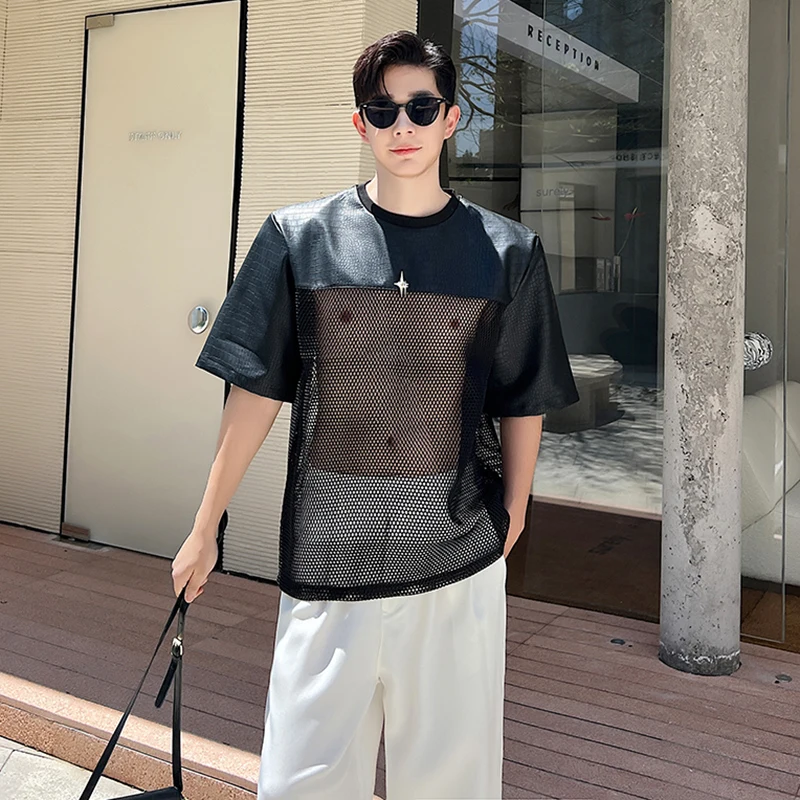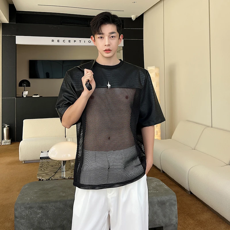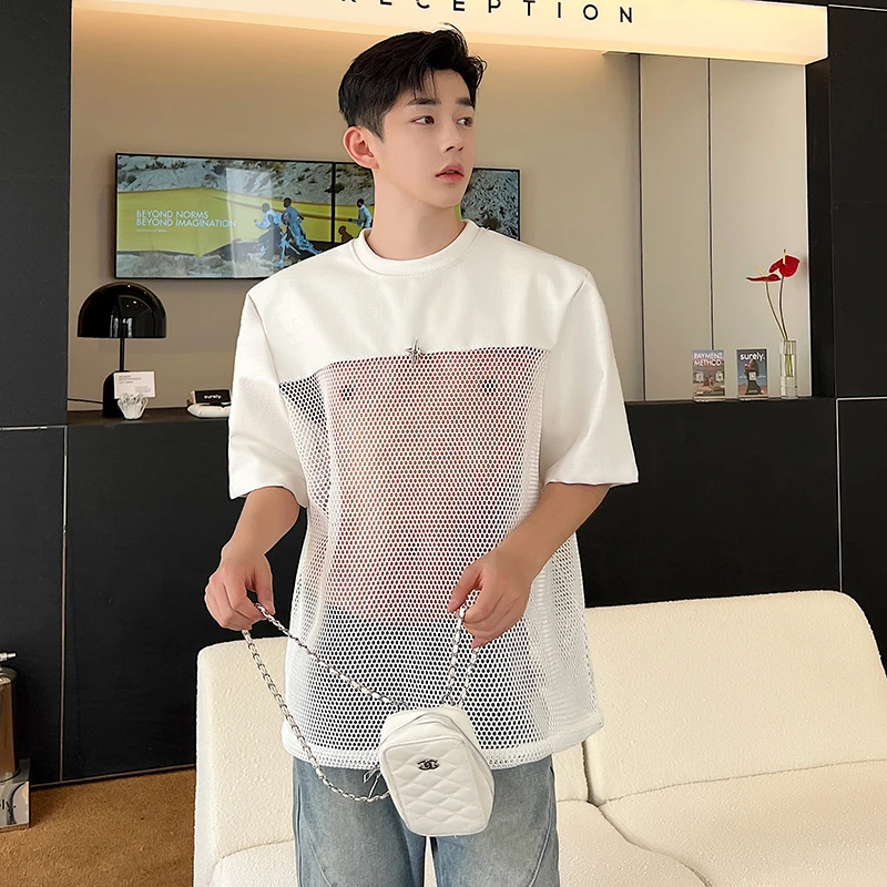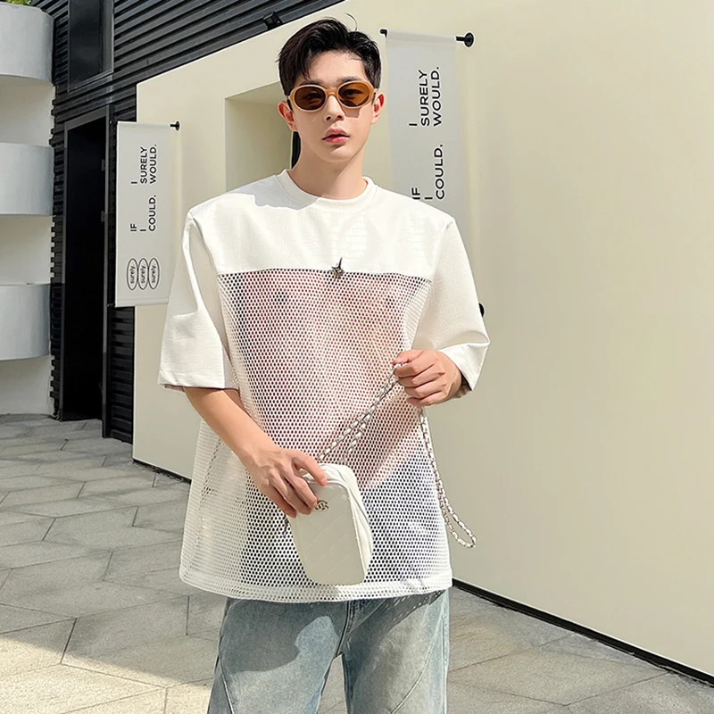 Hollow Out Mesh Splicing Design T-shirt Short Sleeve Men's 2024 Summer Street High Quality Solid Color Trendy Tops