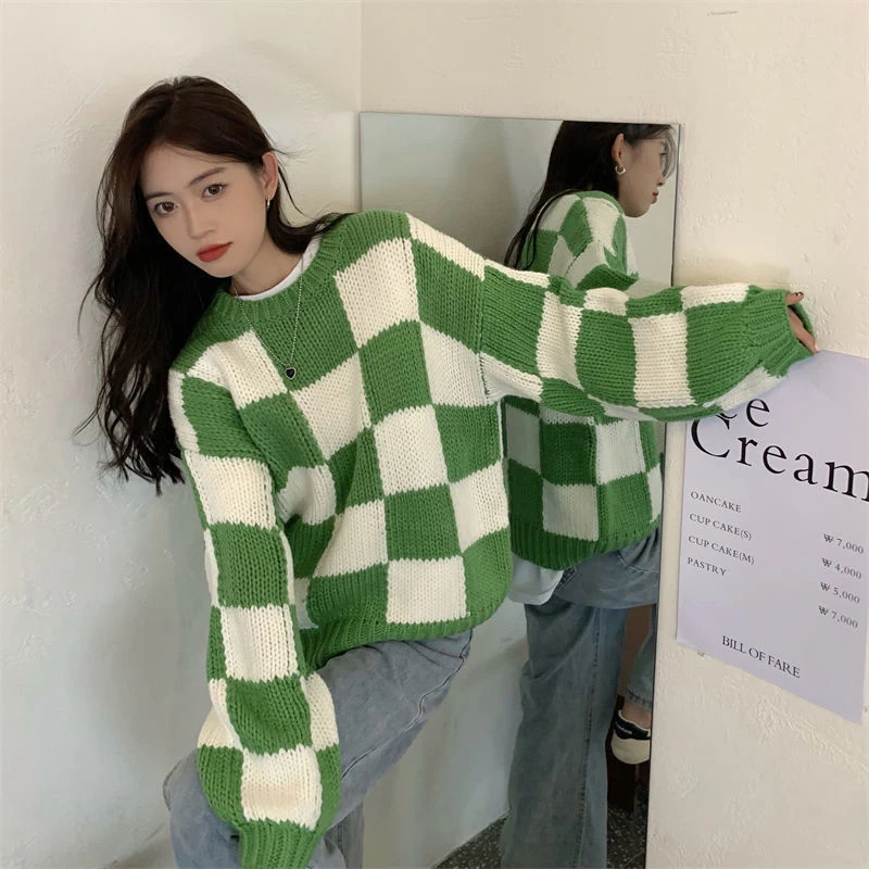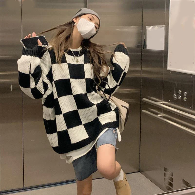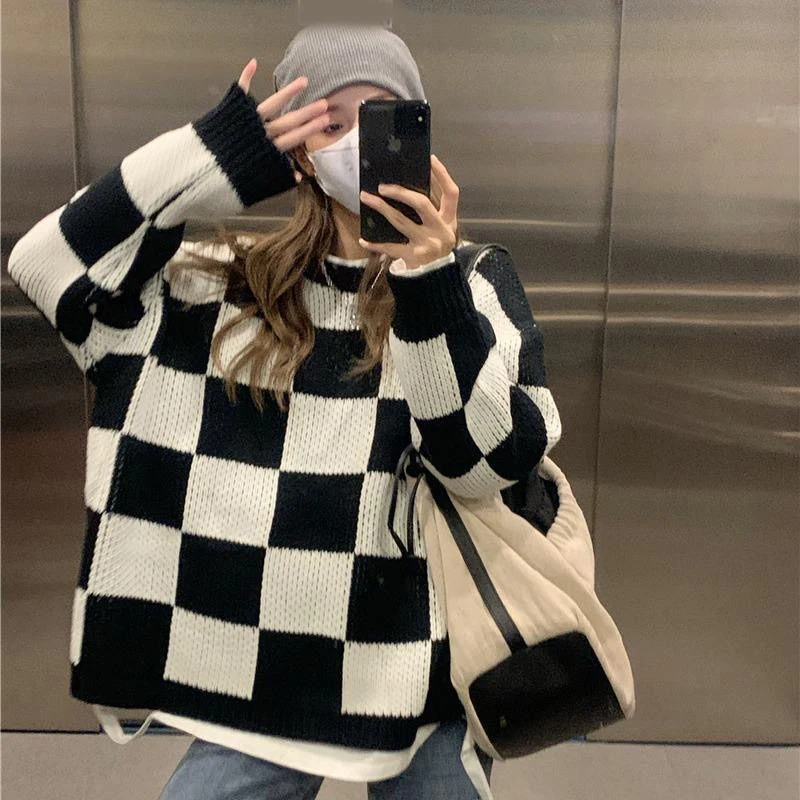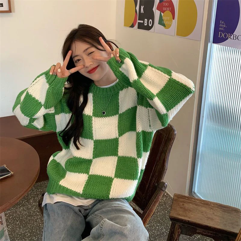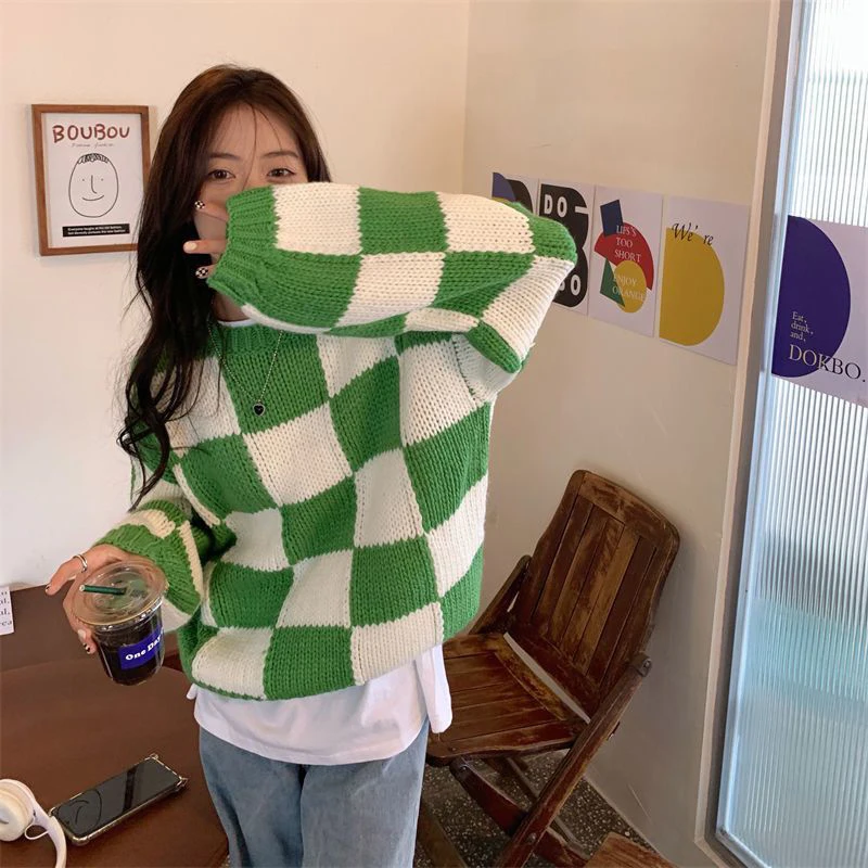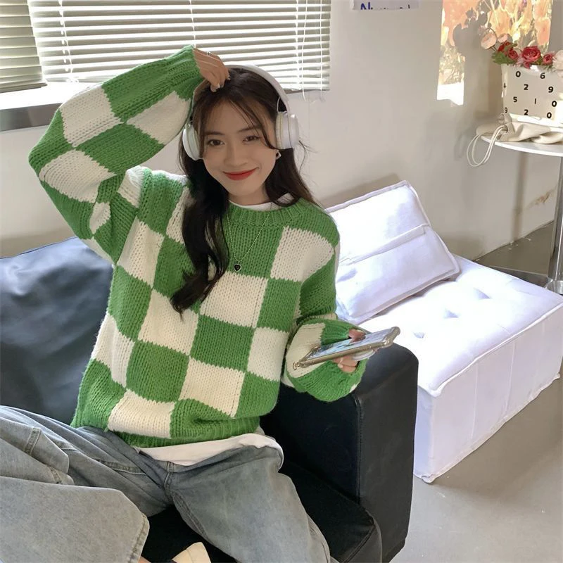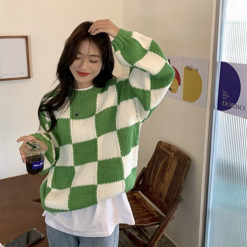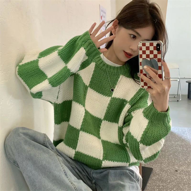Voguable Japan Vintage Women Plaid Sweater Oversize Loose Lazy Wind Knitted Pullover Preppy Style Casual Harajuku Fall Winter Top