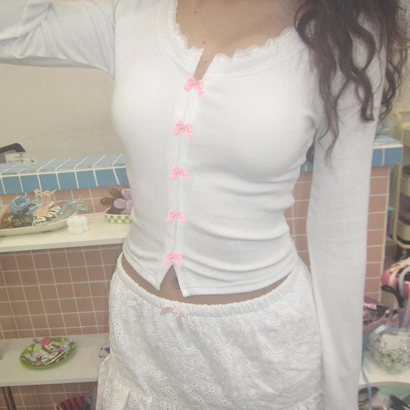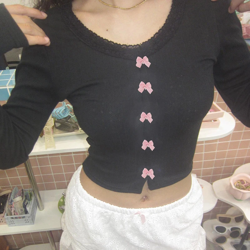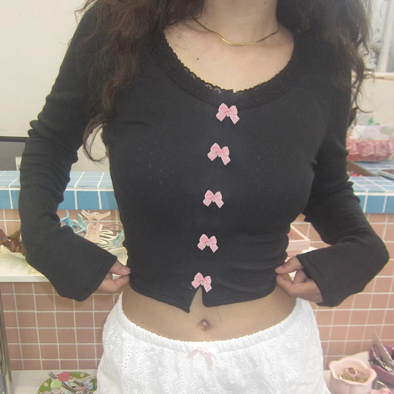 Kawaii Multi Bow Single-breasted Knitted Top Solid Japanese Lolita Style Cropped Tops Sweet Barbiecore T-shirt y2k Tees