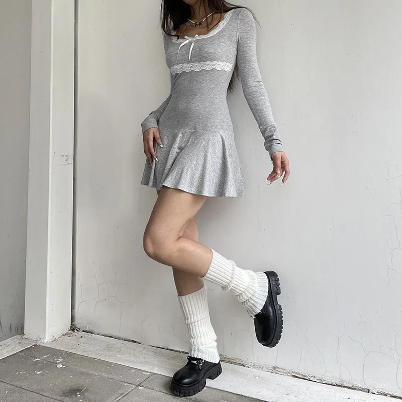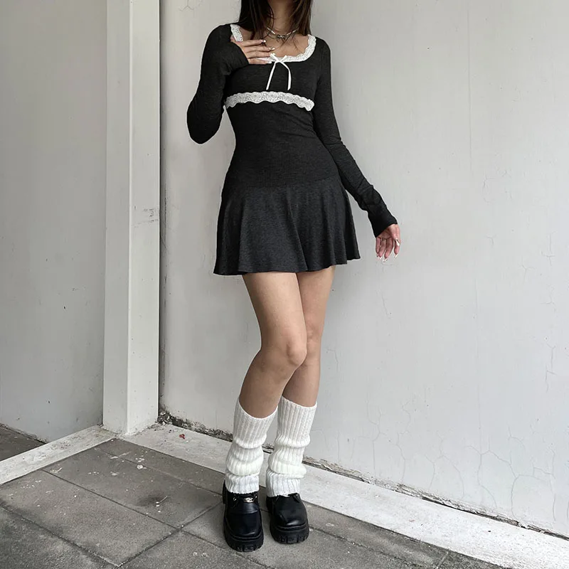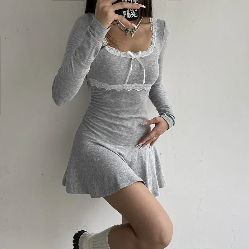 Lace Patchwork Knitted Mini Dresses Women Autumn Y2K Sweet Bow Bodycon Long Sleeve Pleated Dress Casual Korean Style