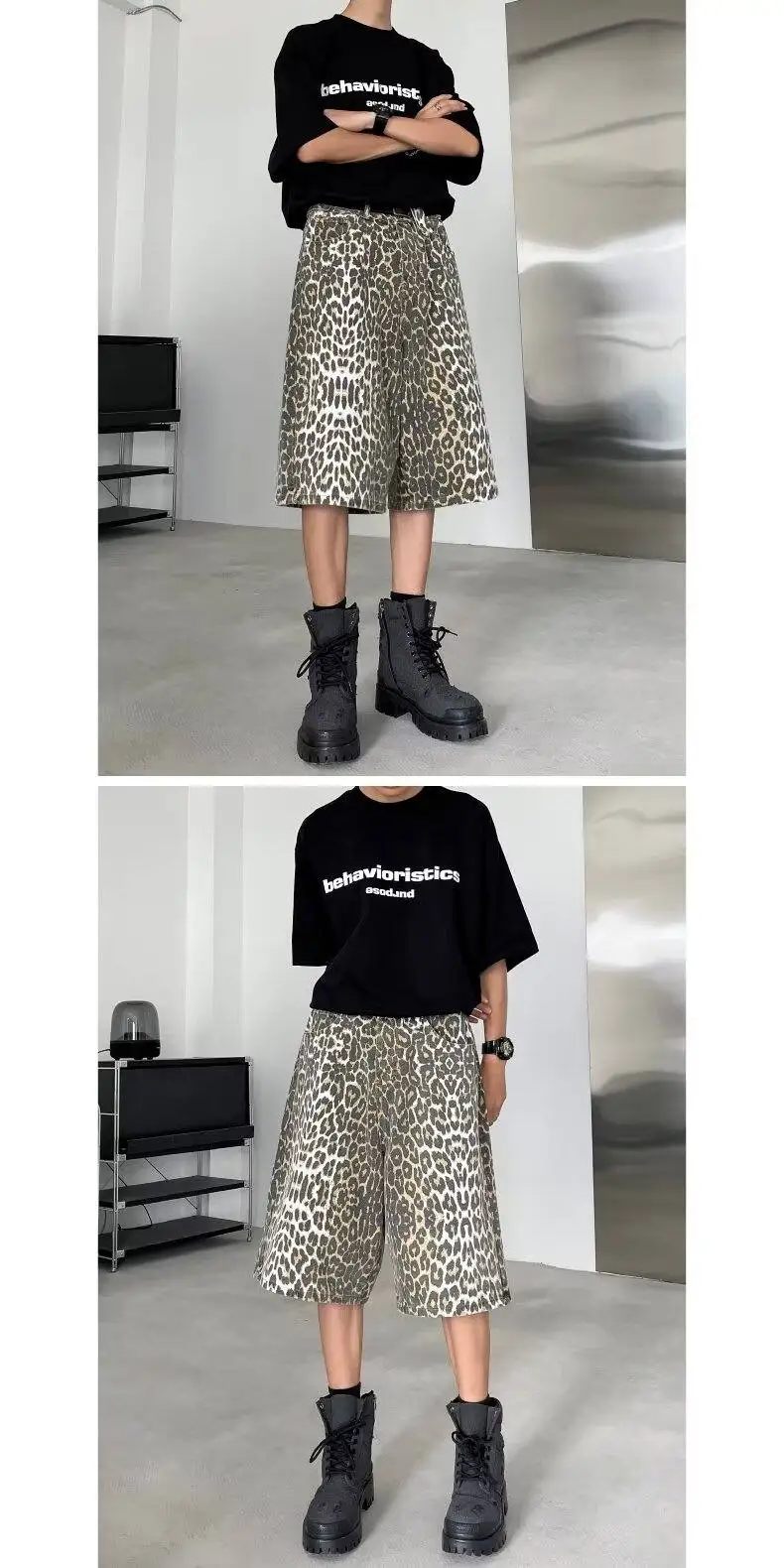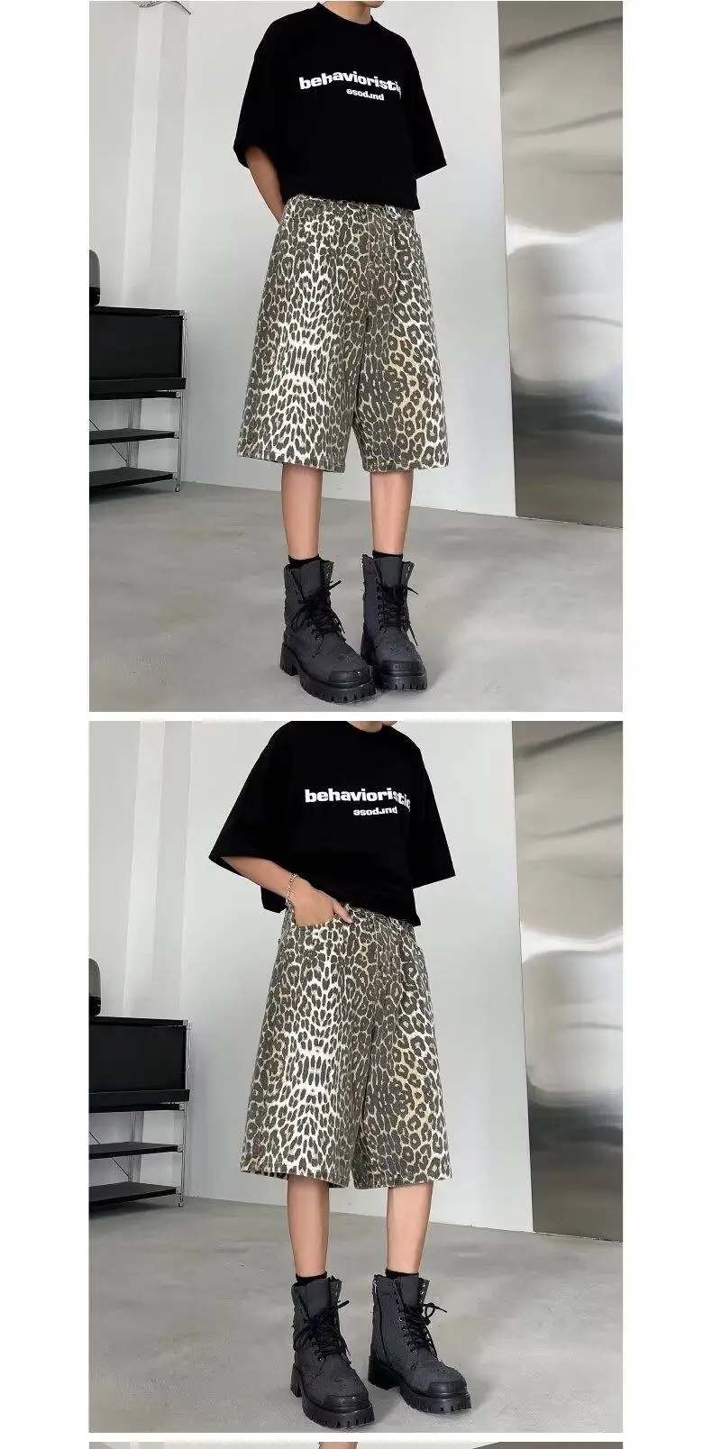 Leopard Print Design Personality Trendy Seven-point Pants 2024 Korean Original New Men Fashion Street Men's Shorts
