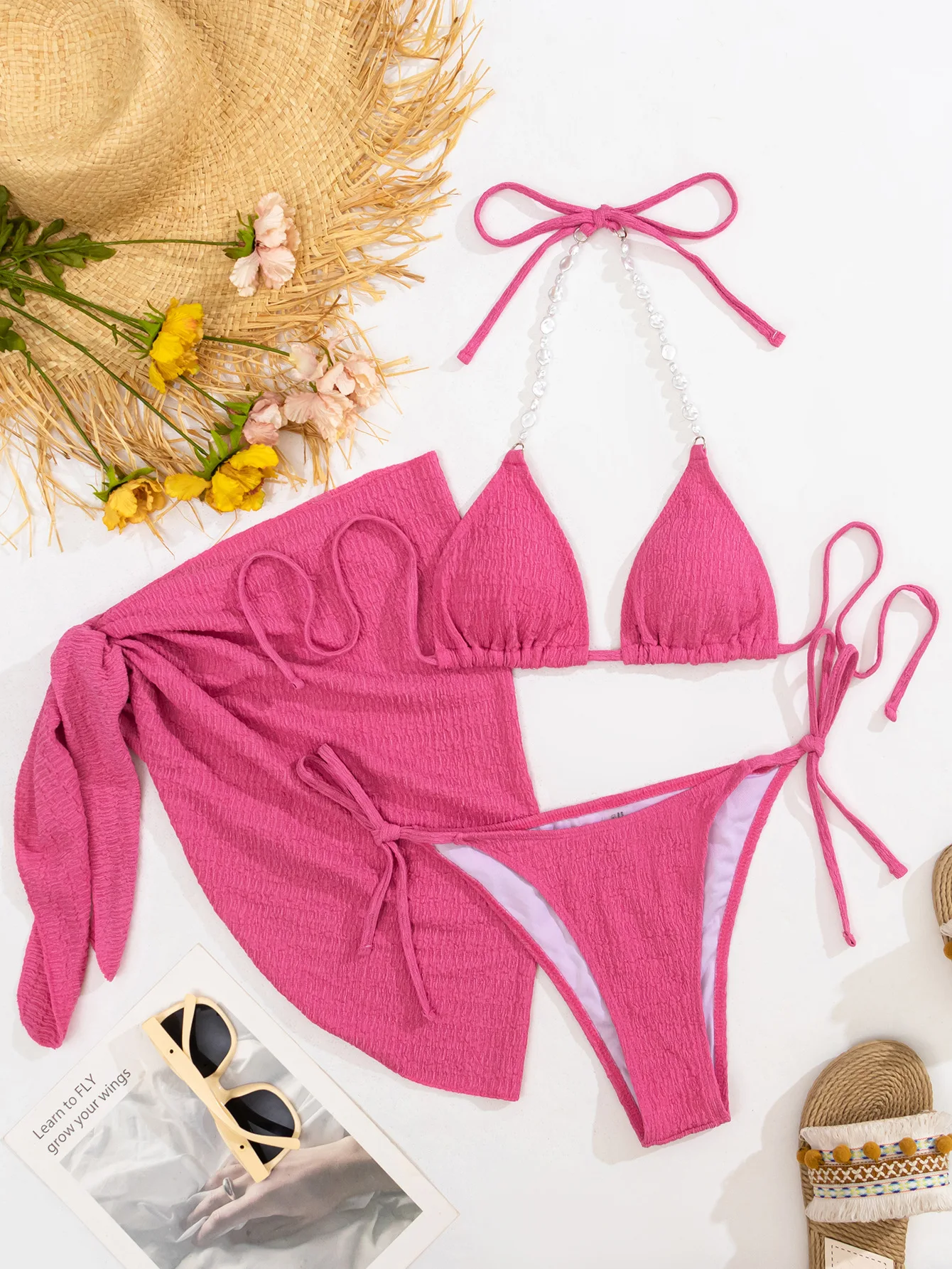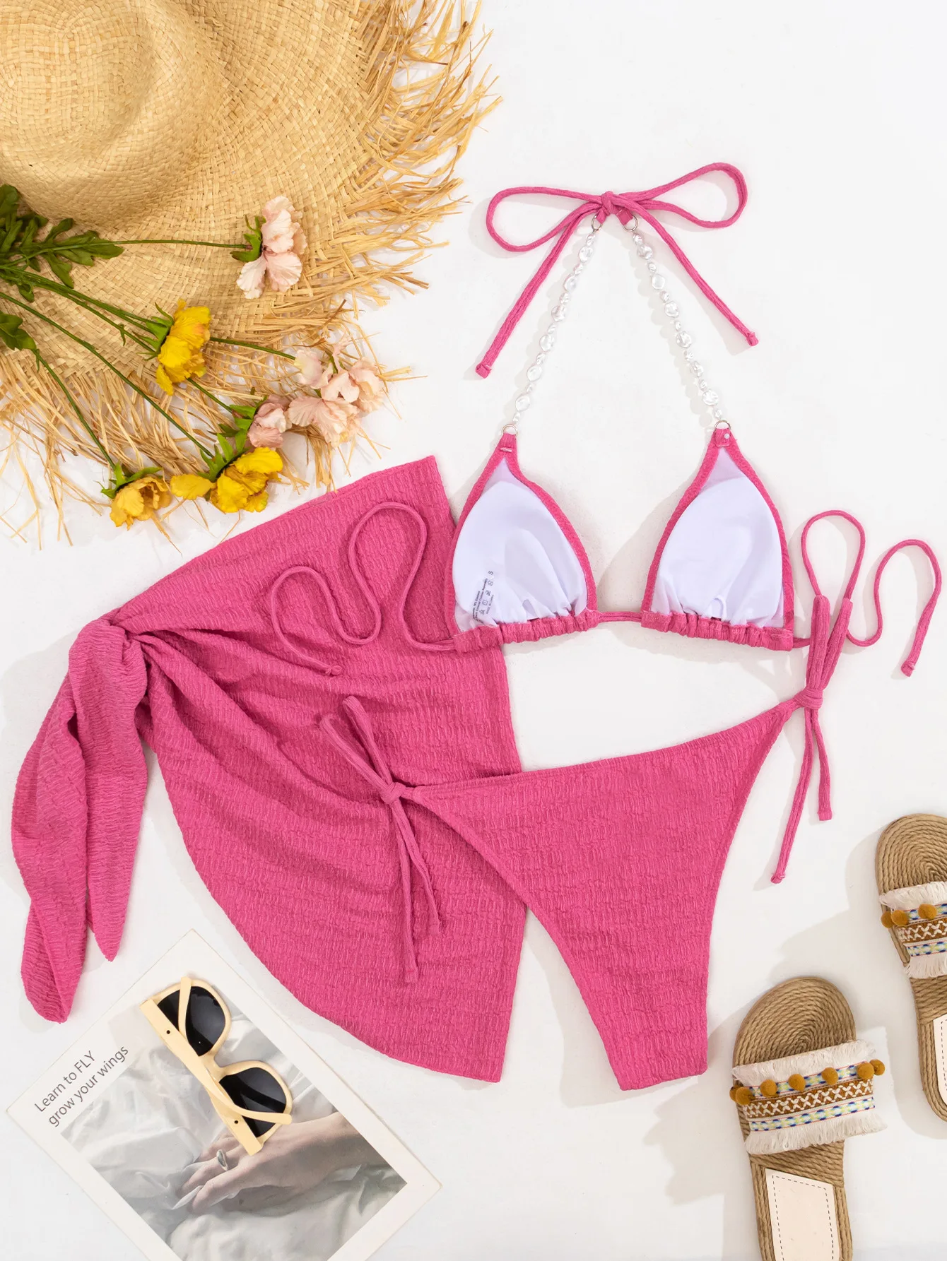 Luxury Bikini Set with Skirt 3 Pieces Solid White Blue Thong Swimsuit Women Sexy Pearl Designer Bathing Suit Cover Up Swimwear