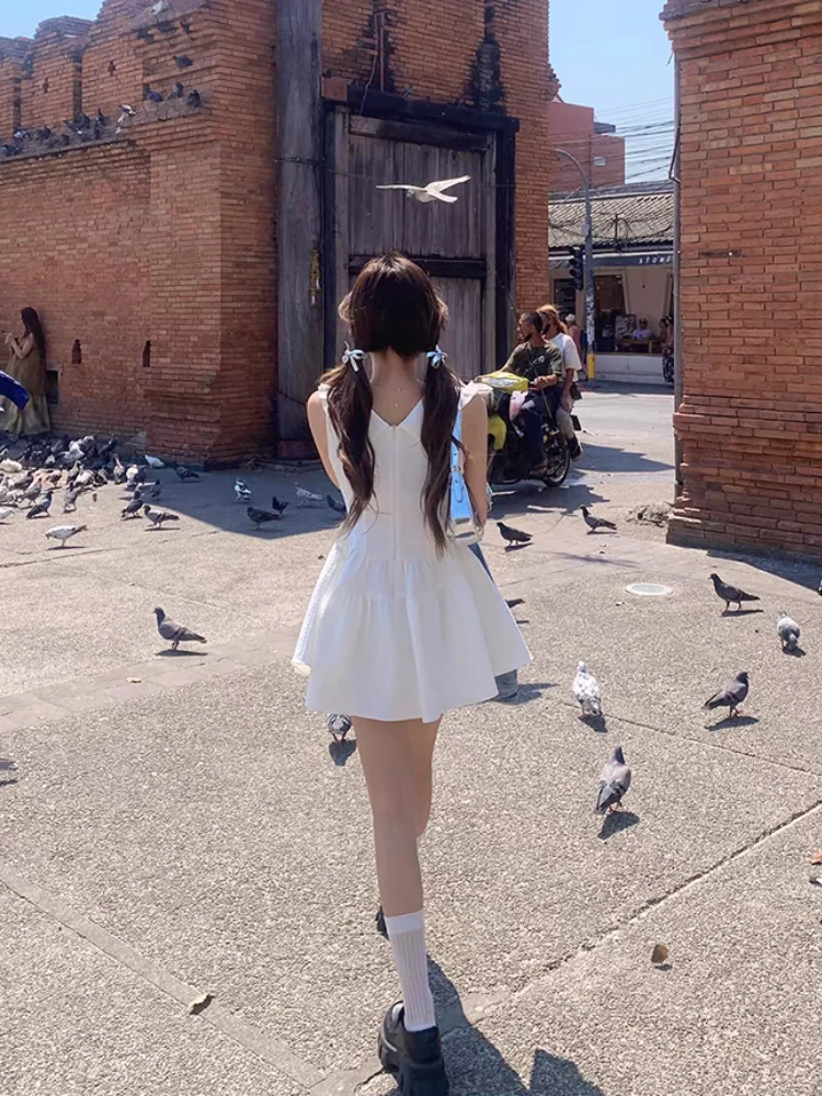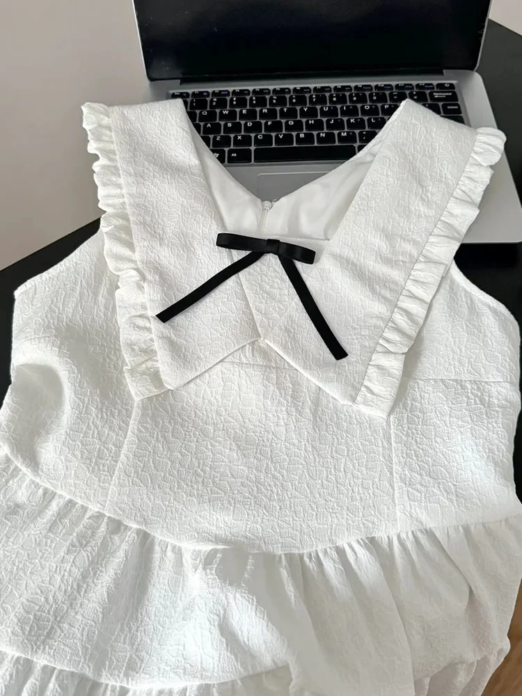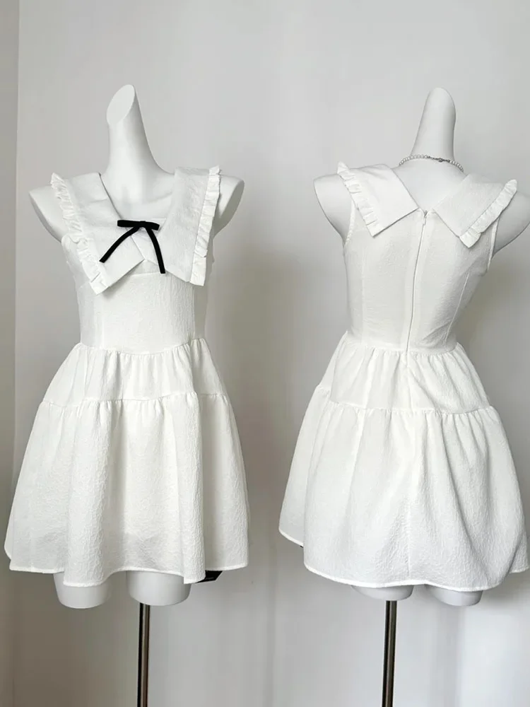 Preppy Style Design White One-Piece Frocks Sleeveless Off Shoulder Party 90s Women Sweet A-Line Dress Casual Bow Vestidos New