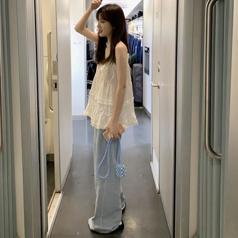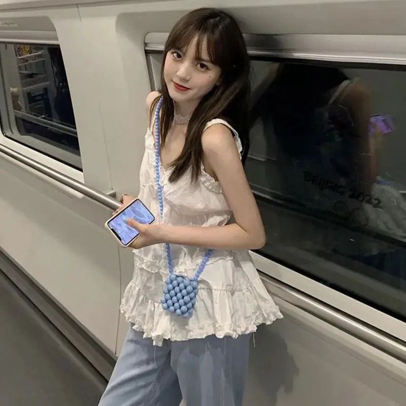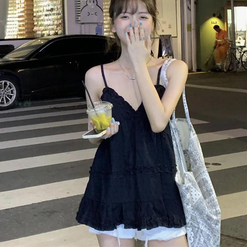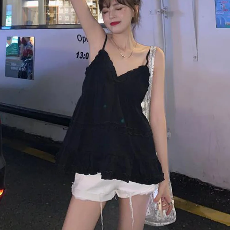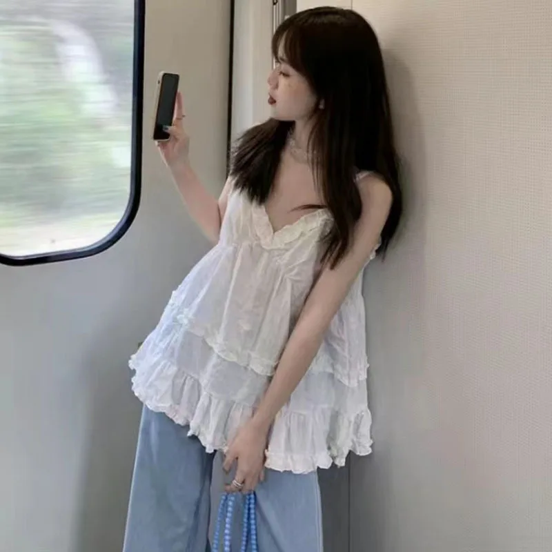 Preppy Style Short Tank for Women Summer Ruffles Design White Camisole Woman Japanese Sweet Beach Sleeveless V-Neck Tops