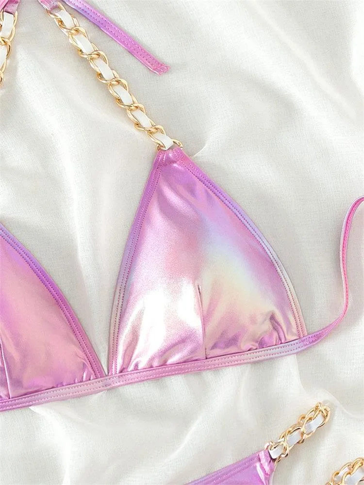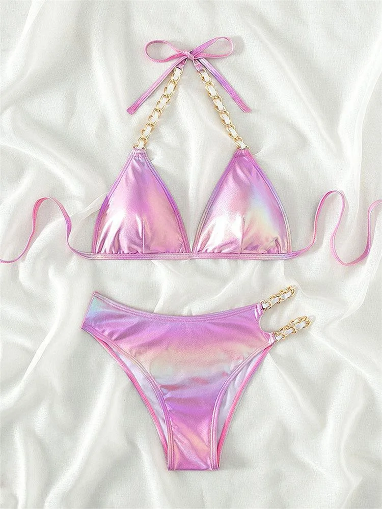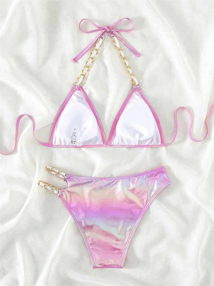 Push Up Bikini Micro Bikinis Set Pink Gradient Metal Strap Swimsuit Women Sexy Cut Out Bathing Suit High Waist Swimwear