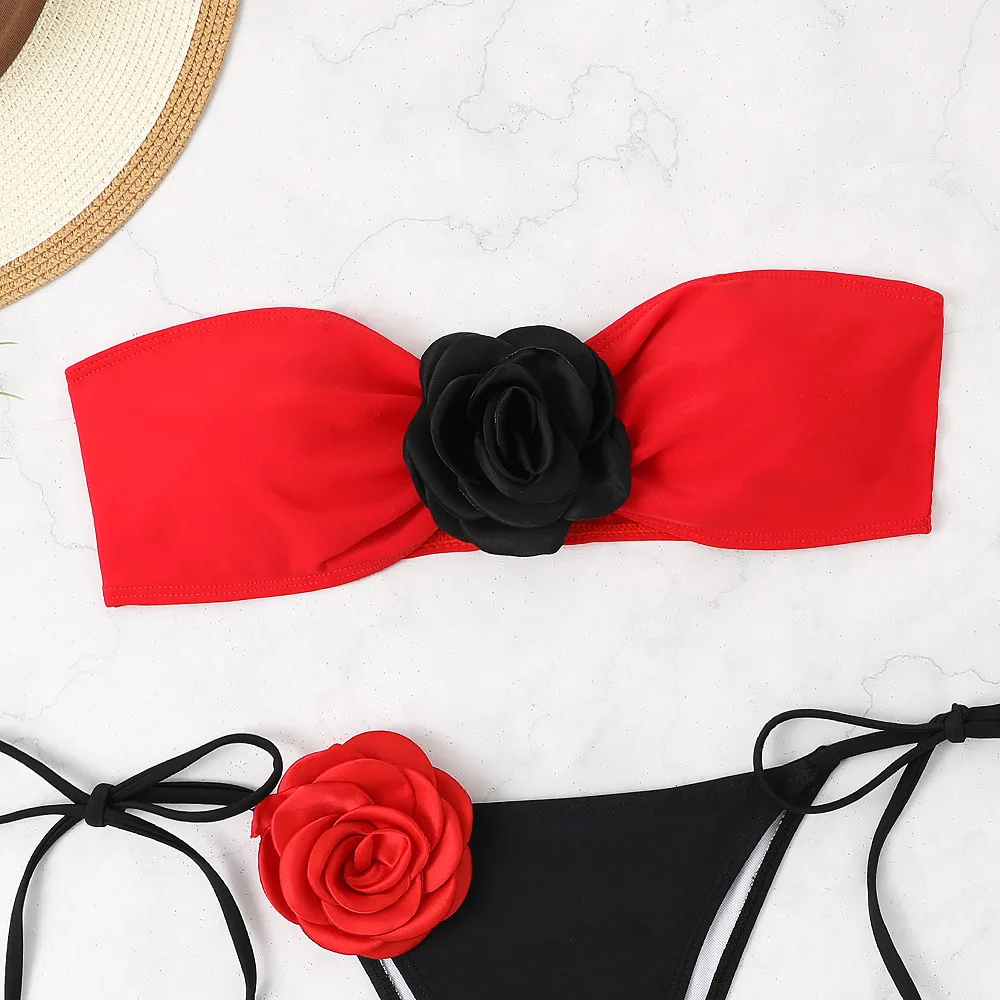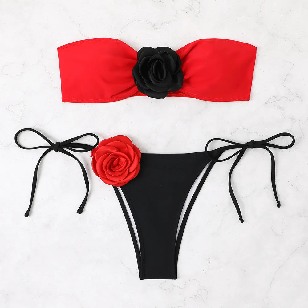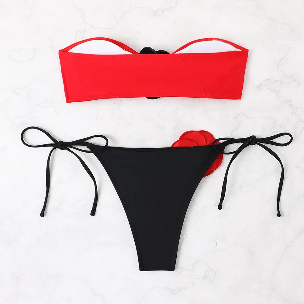 Sexy 3D Floral Designer Bikini Set 2024 New Bandeau Push Up Bra Black White Patchwork Micro Swimsuit Bathing Suit Thong Swimwear