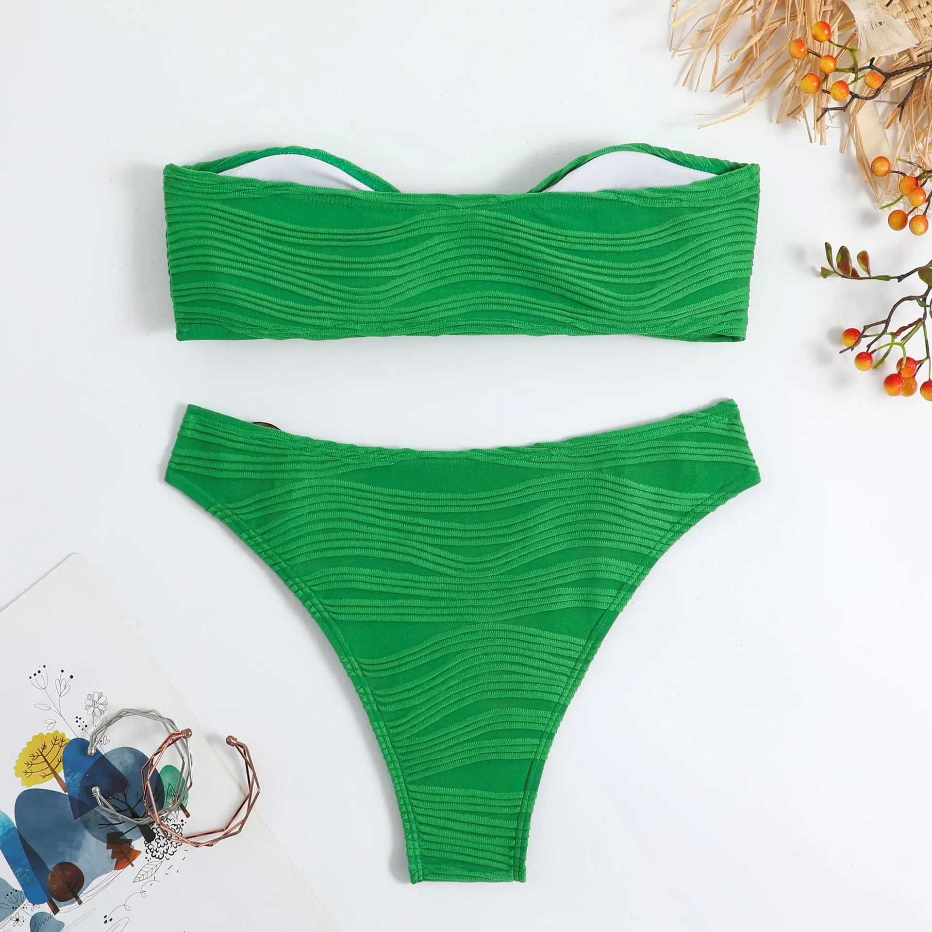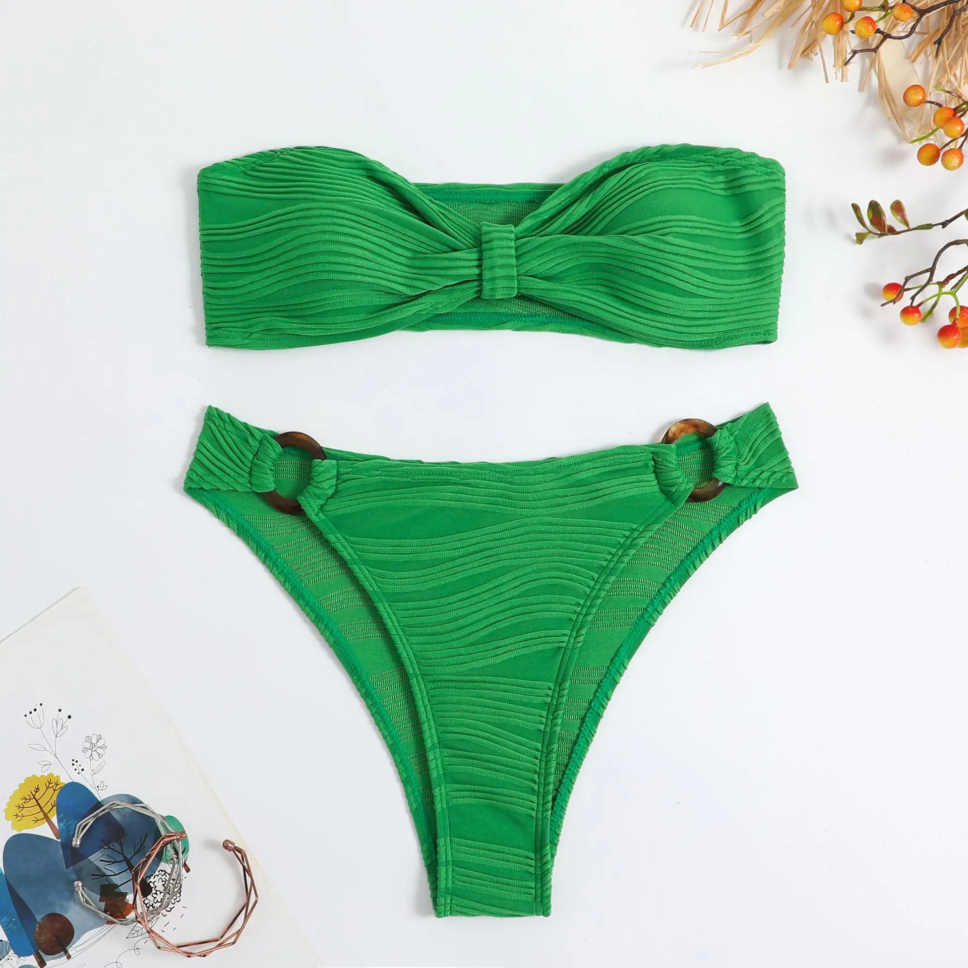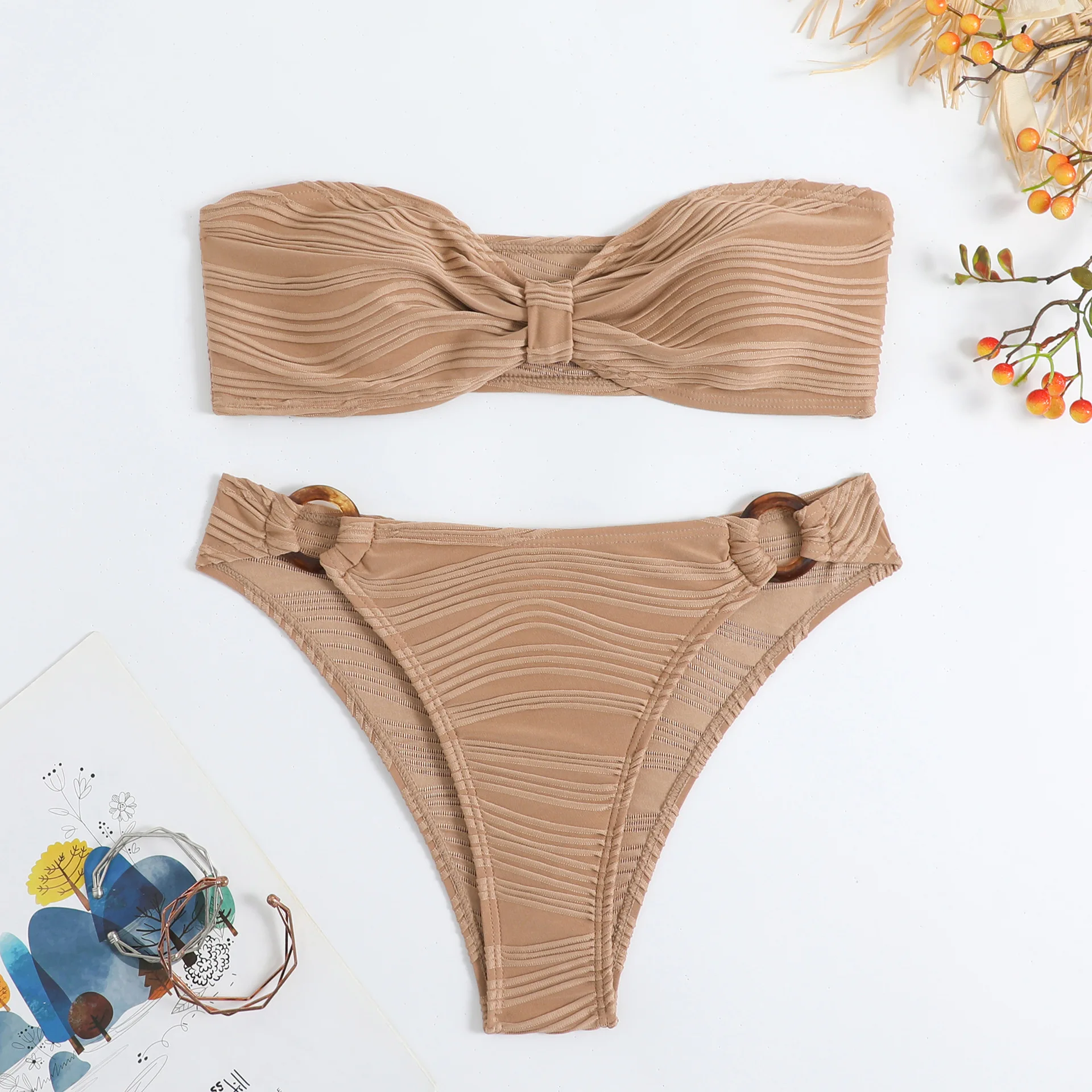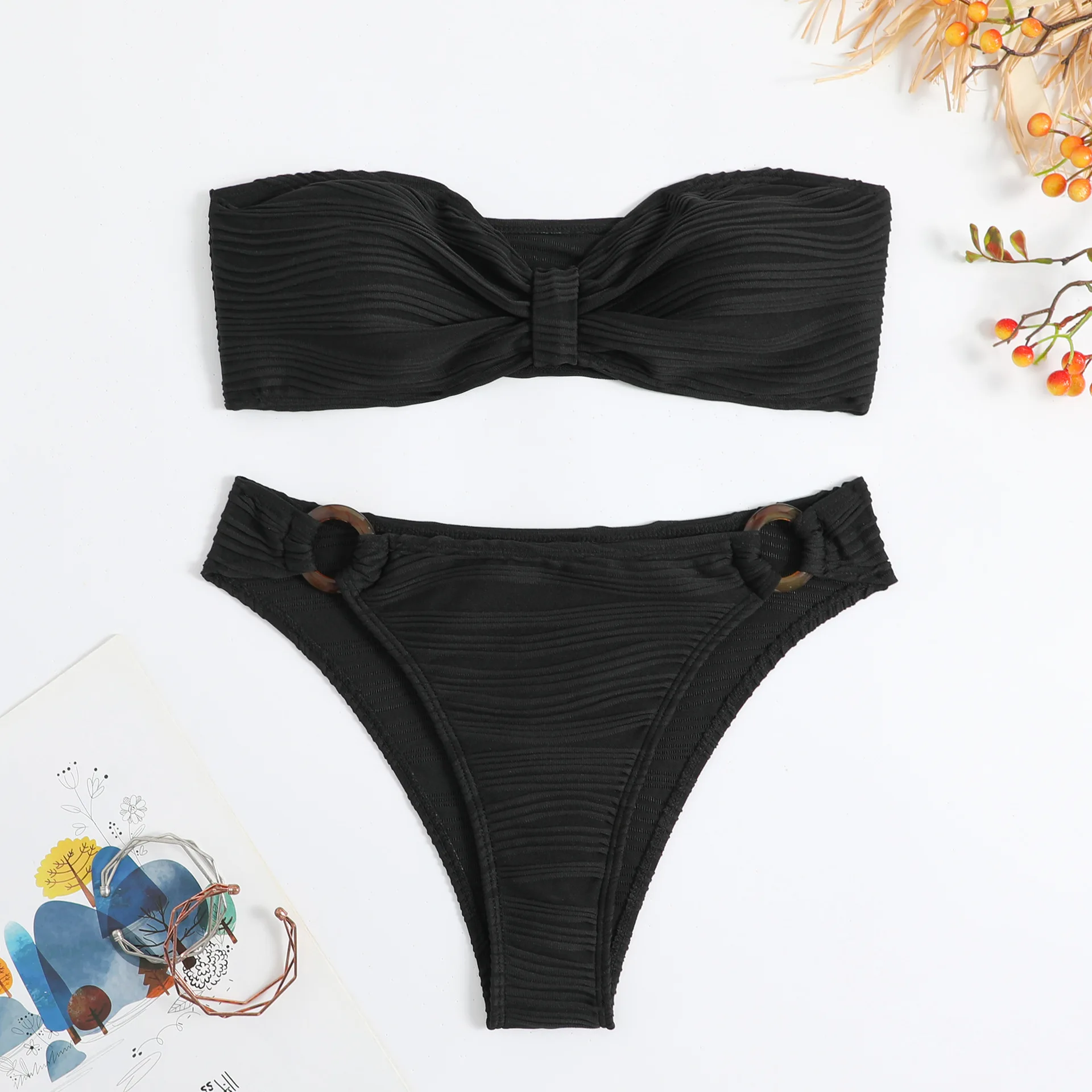 Sexy Bandeau Bikini Set Women New Metal V Neck Push Up Thong Swimsuit 2024 Beach Solid White Bathing Suit Micro Swimwear Biquini