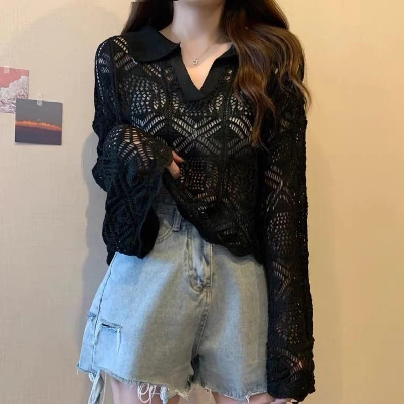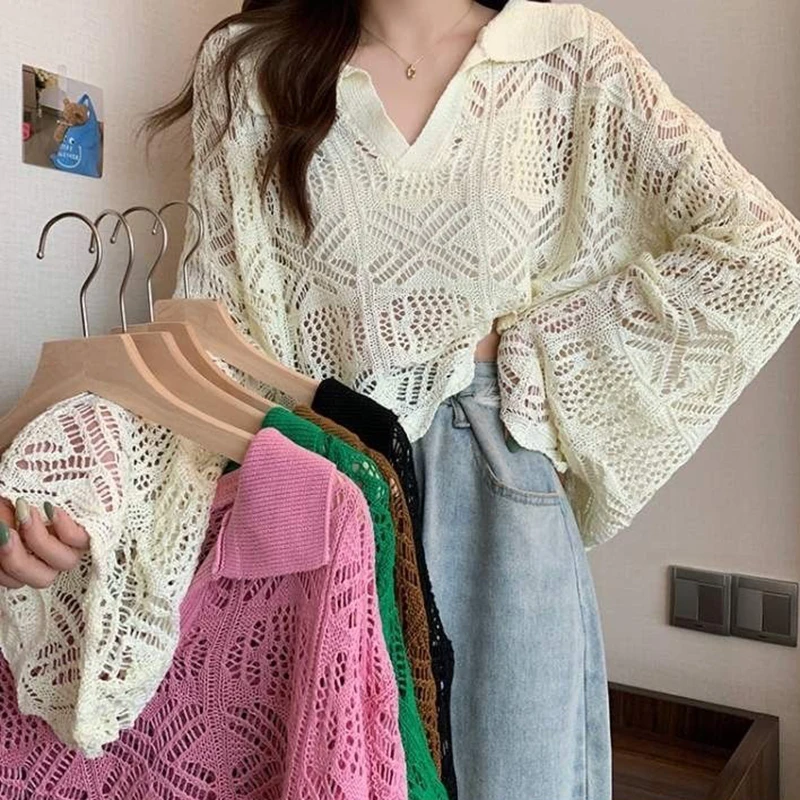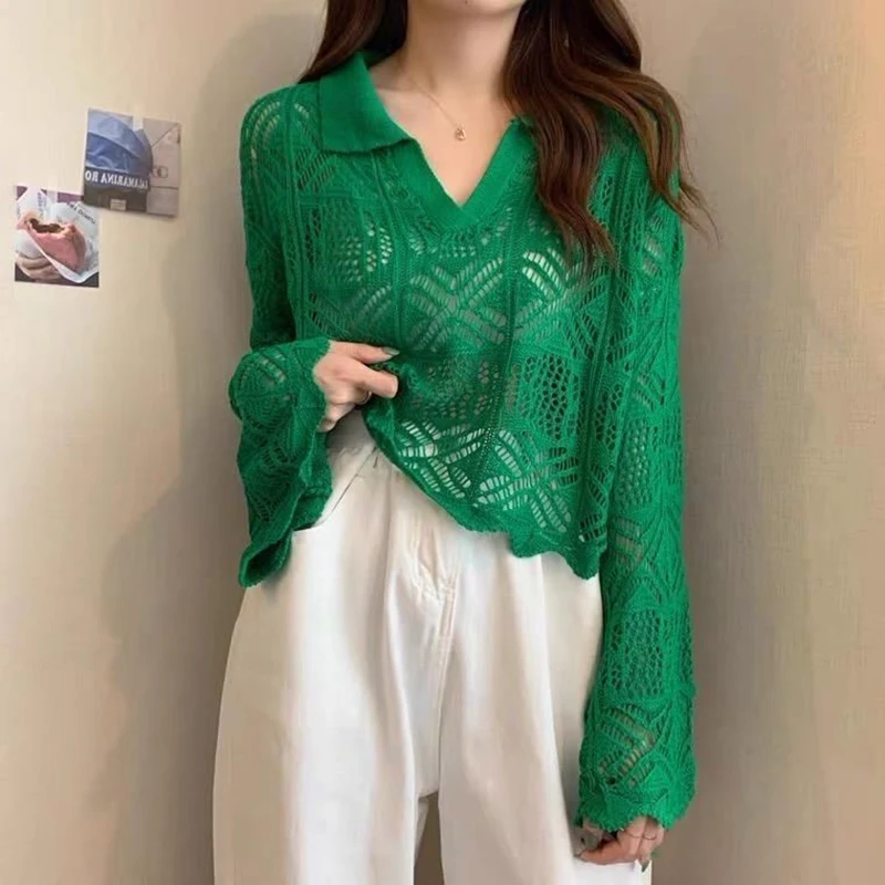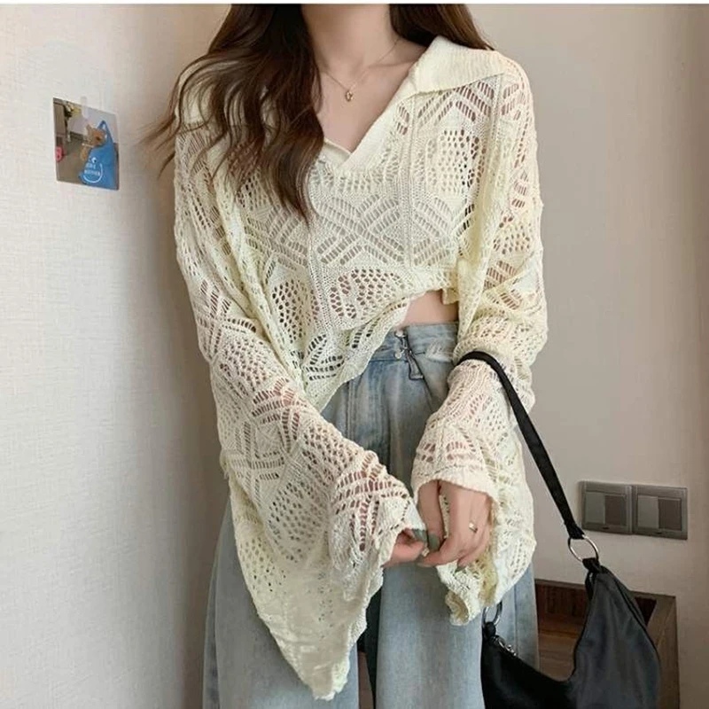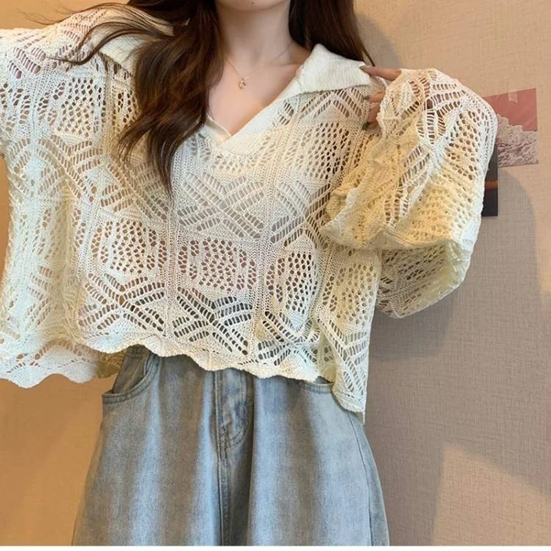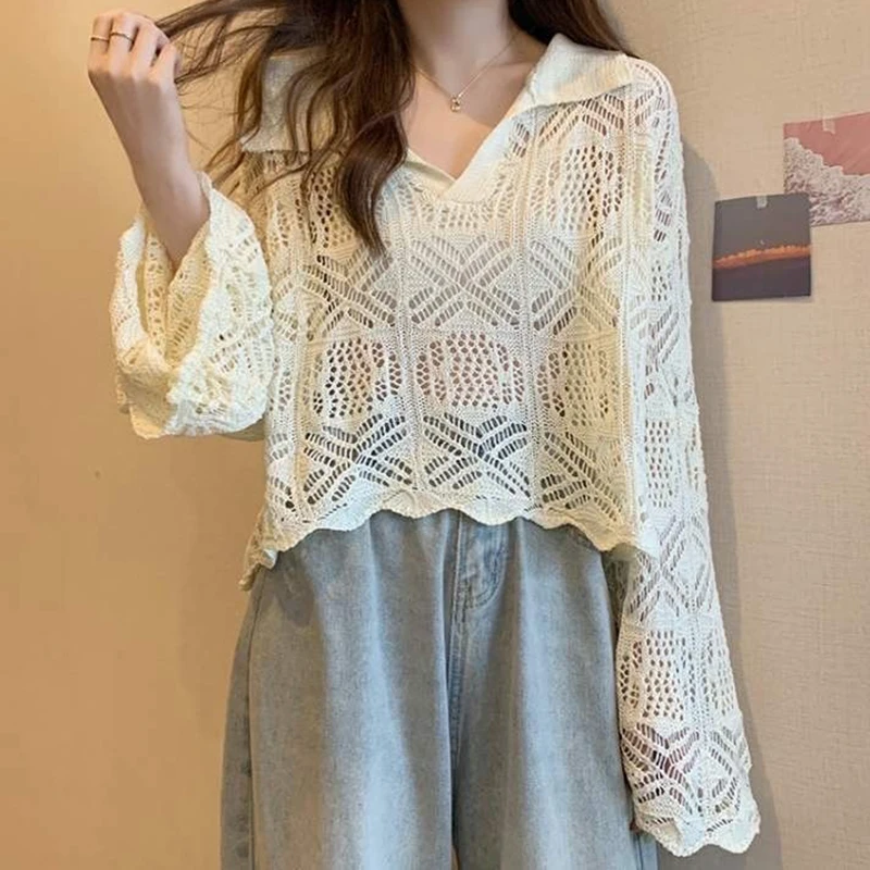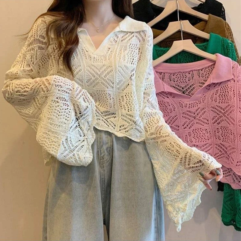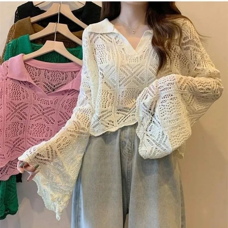 Sexy Hollow Out Women Knitted Crop Tops Fashion Korean Flare Sleeve Pullover Sweater Fall Casual Female Tops New