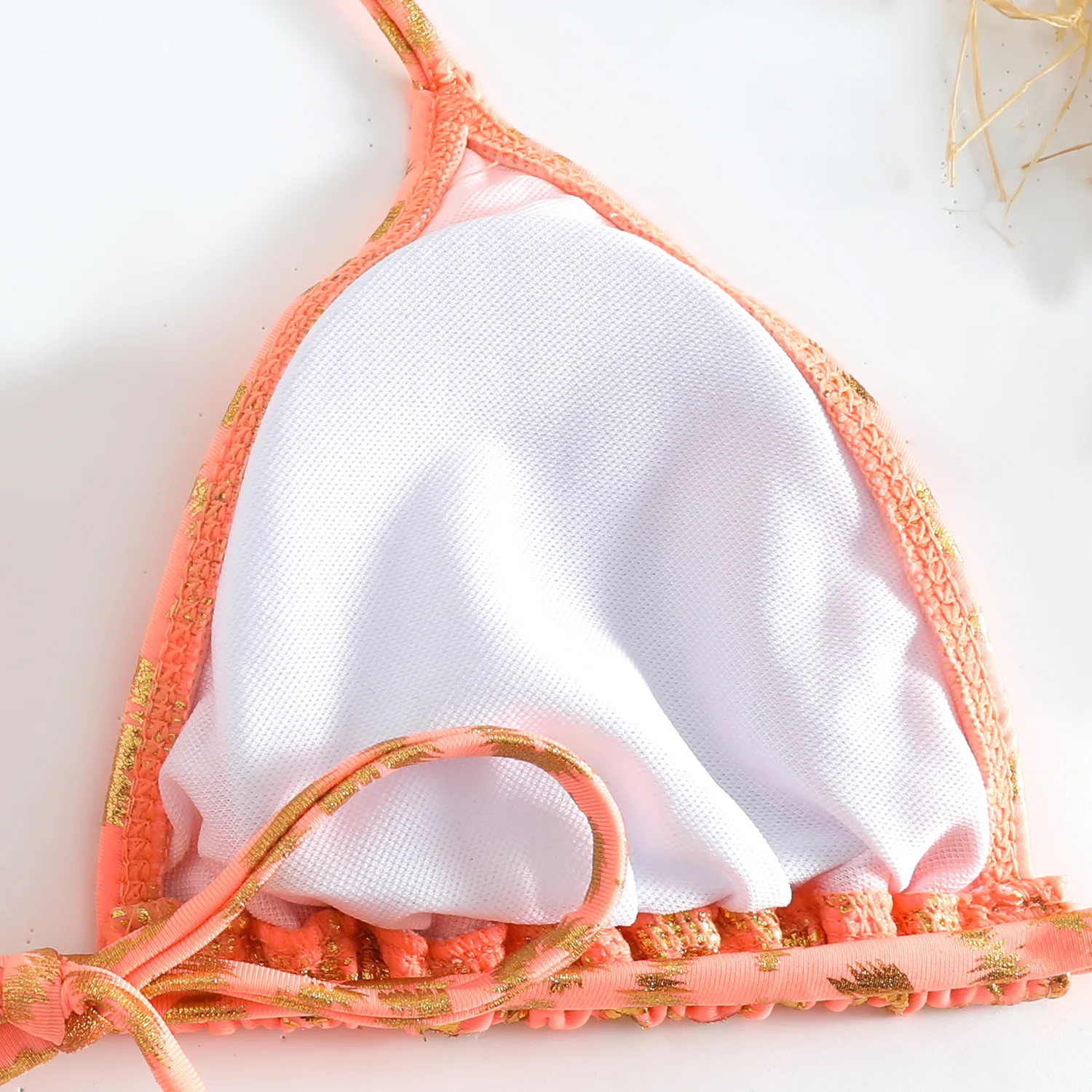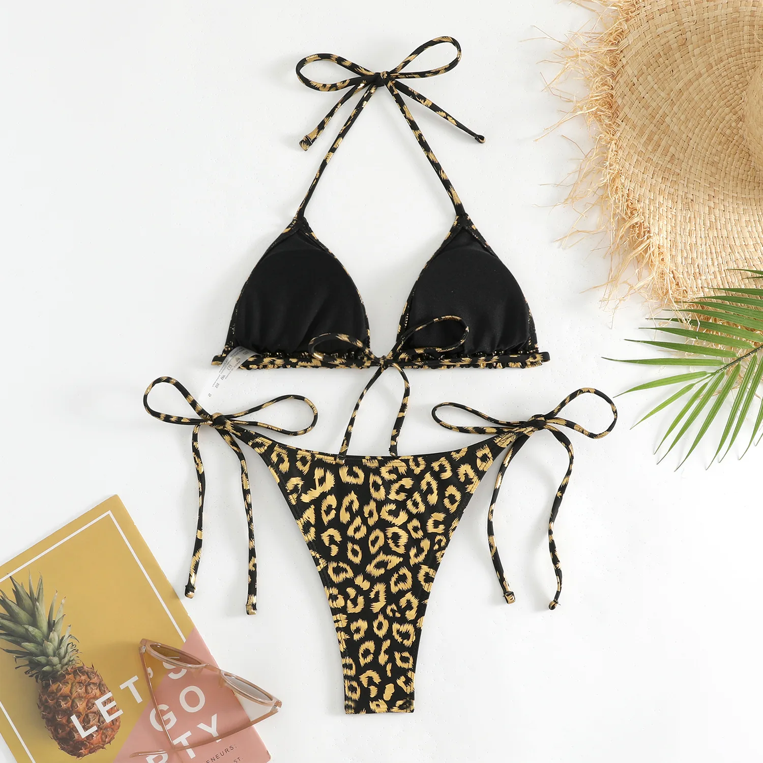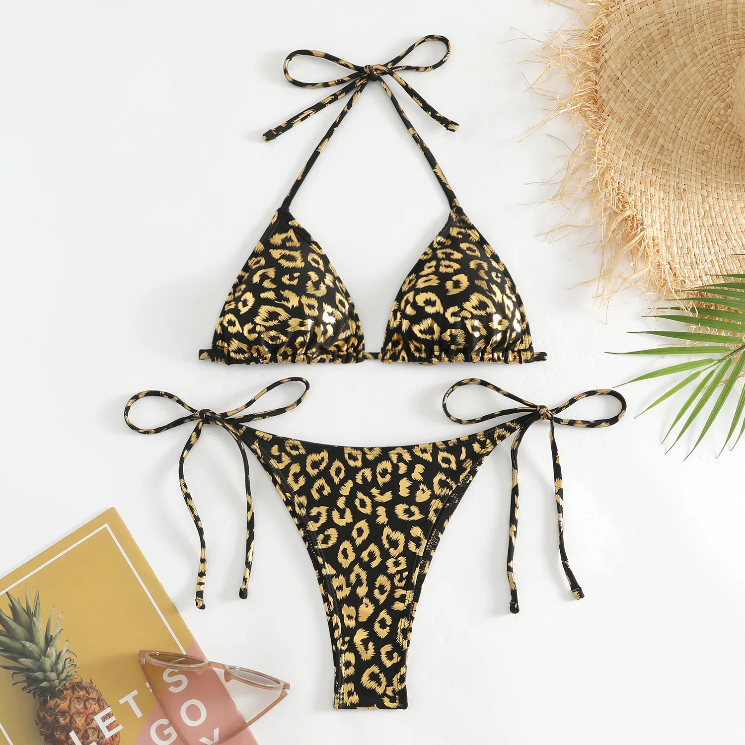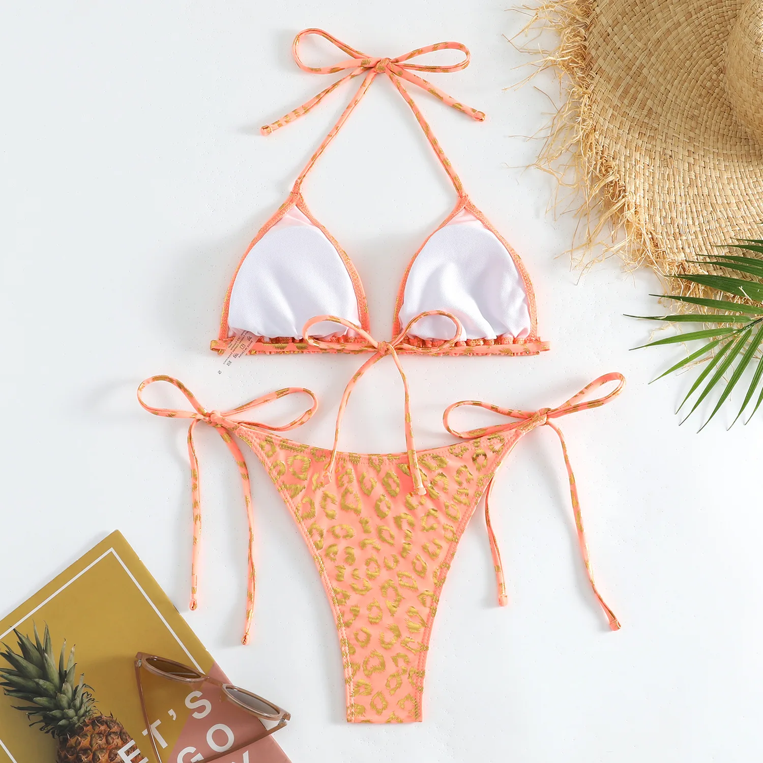 Sexy Orange Leopard Print Bikini Set 2024 Women Halter Push Up Bra Tie Side Thong Swimsuit Summer Backless Bathing Suit Swimwear