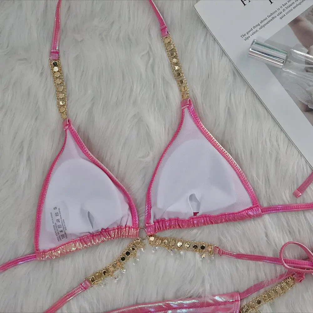 Sexy Pink Brozing Bikini Set 2024 Women Luxury Rhinestone Criss Cross Bandage Micro Swimsuit Bathing Suit Diamond Thong Swimwear