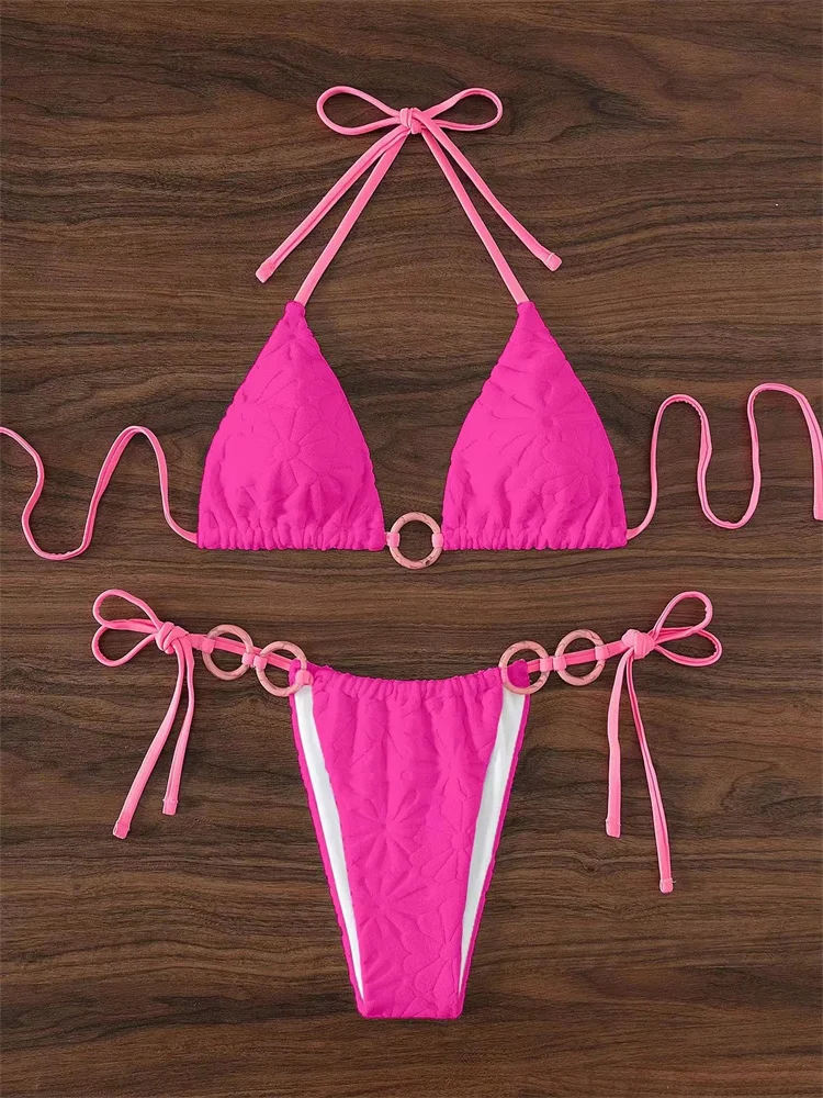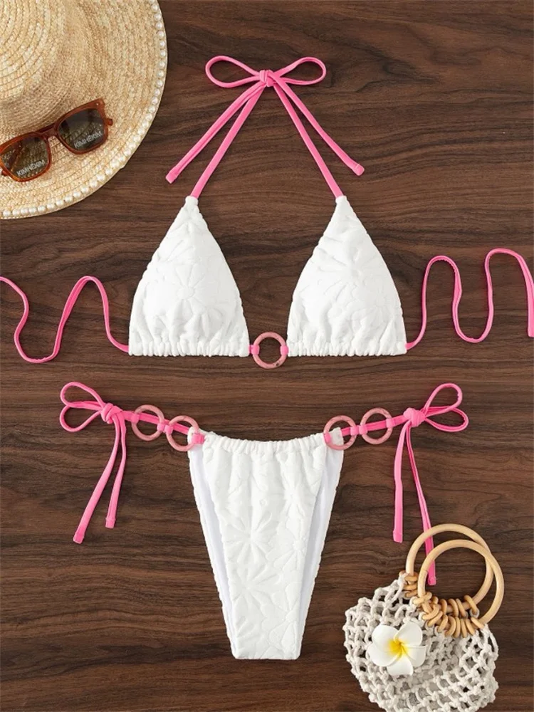 Sexy Triangle Bikini Women White Contrast Ring Linked Criss Cross Micro Swimsuit 2024 Beach Bathing Suit Tie Side Thong Swimwear