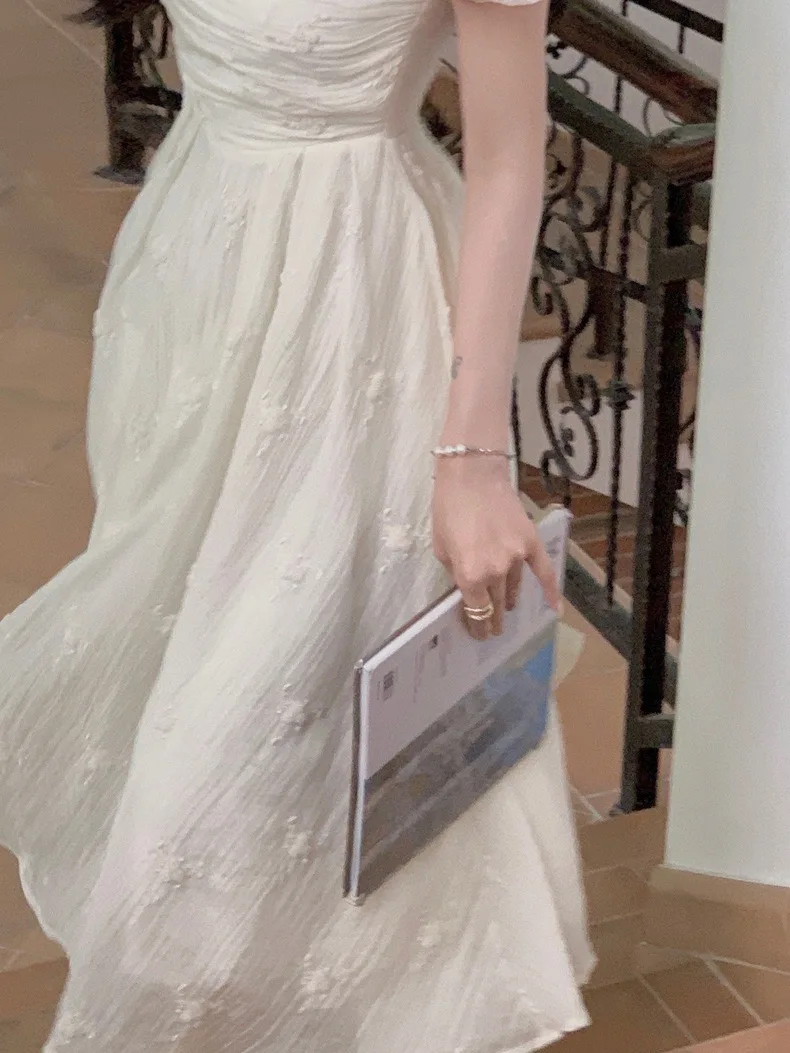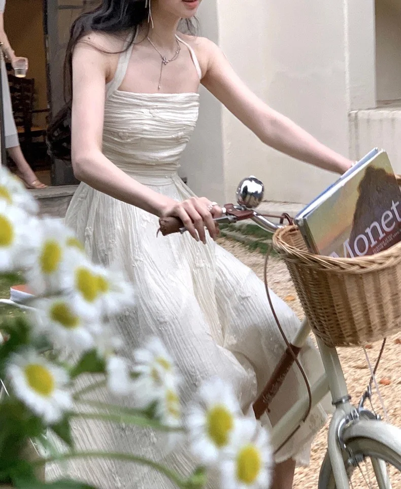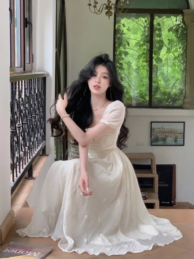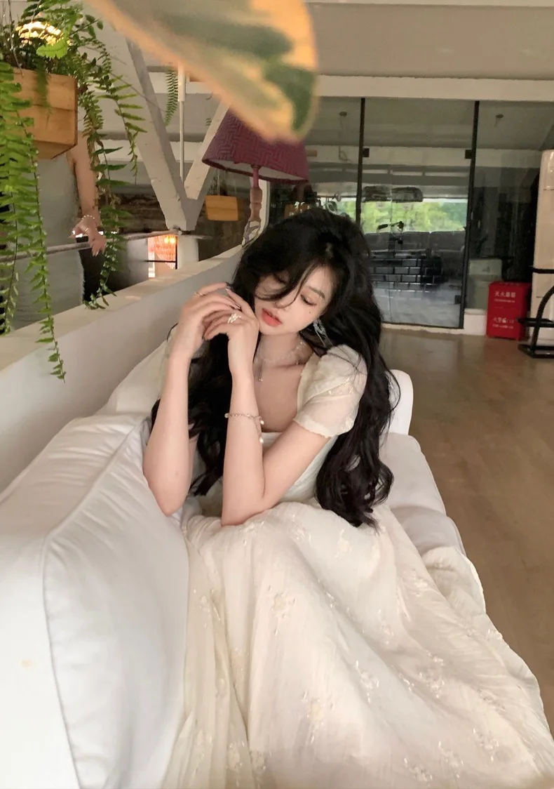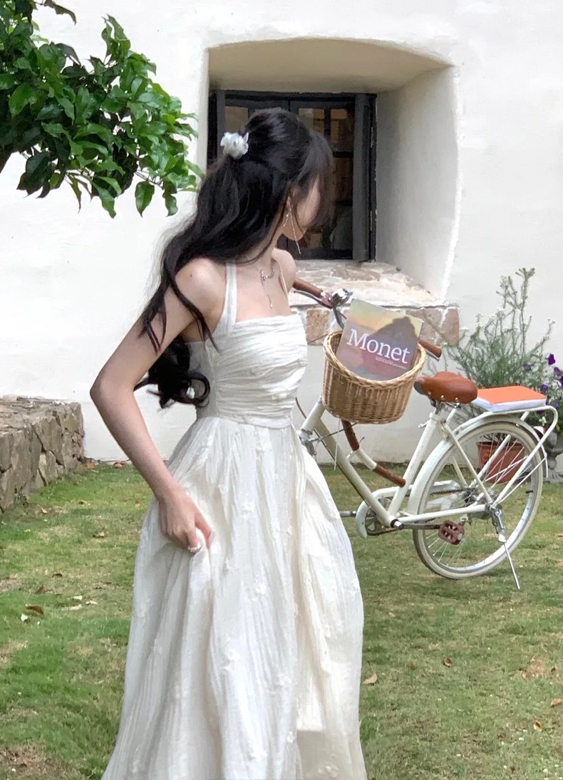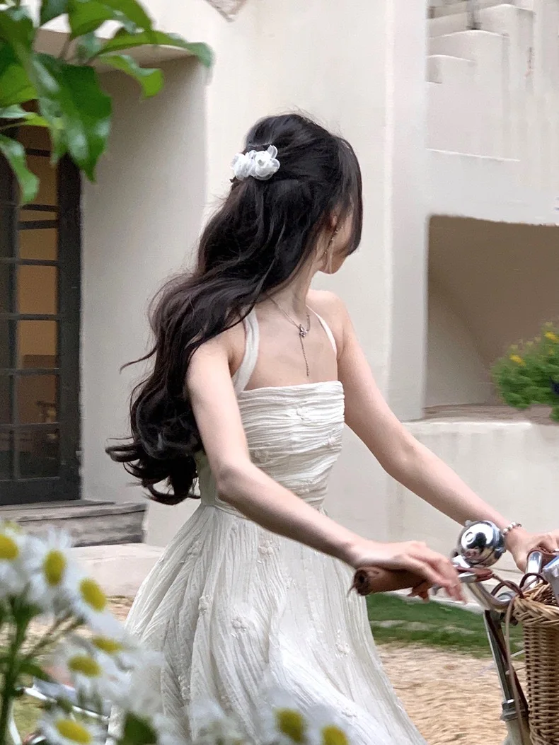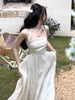 Summer Fairy Backless Slash Neck Embroidery Suspender Dresses Women High Waist Chiffon Slim Fit Lolita Style White Dress