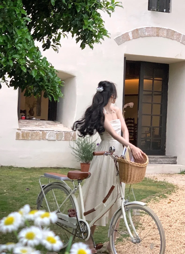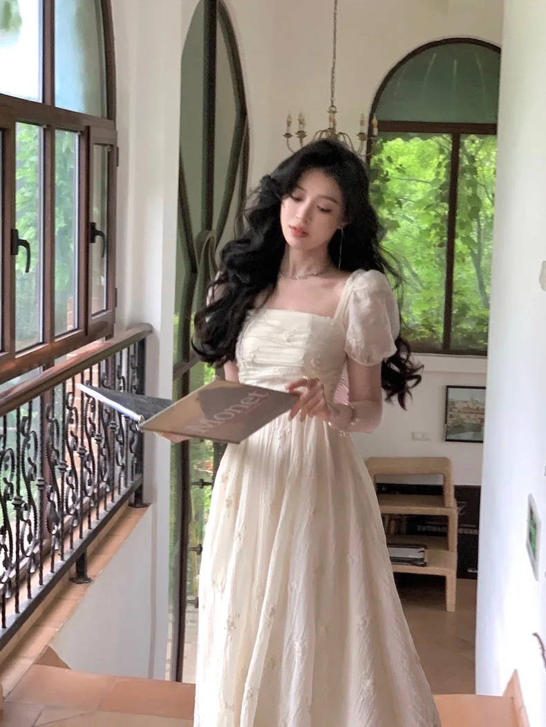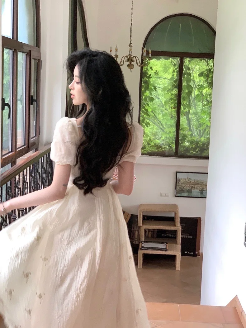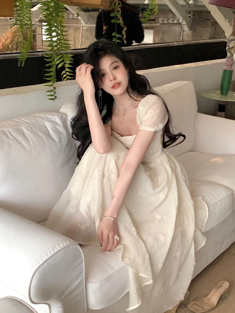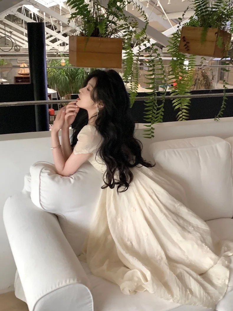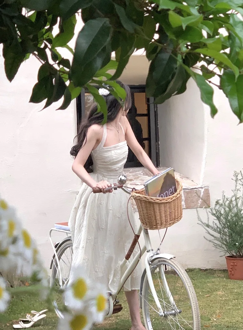 Summer Fairy Backless Slash Neck Embroidery Suspender Dresses Women High Waist Chiffon Slim Fit Lolita Style White Dress