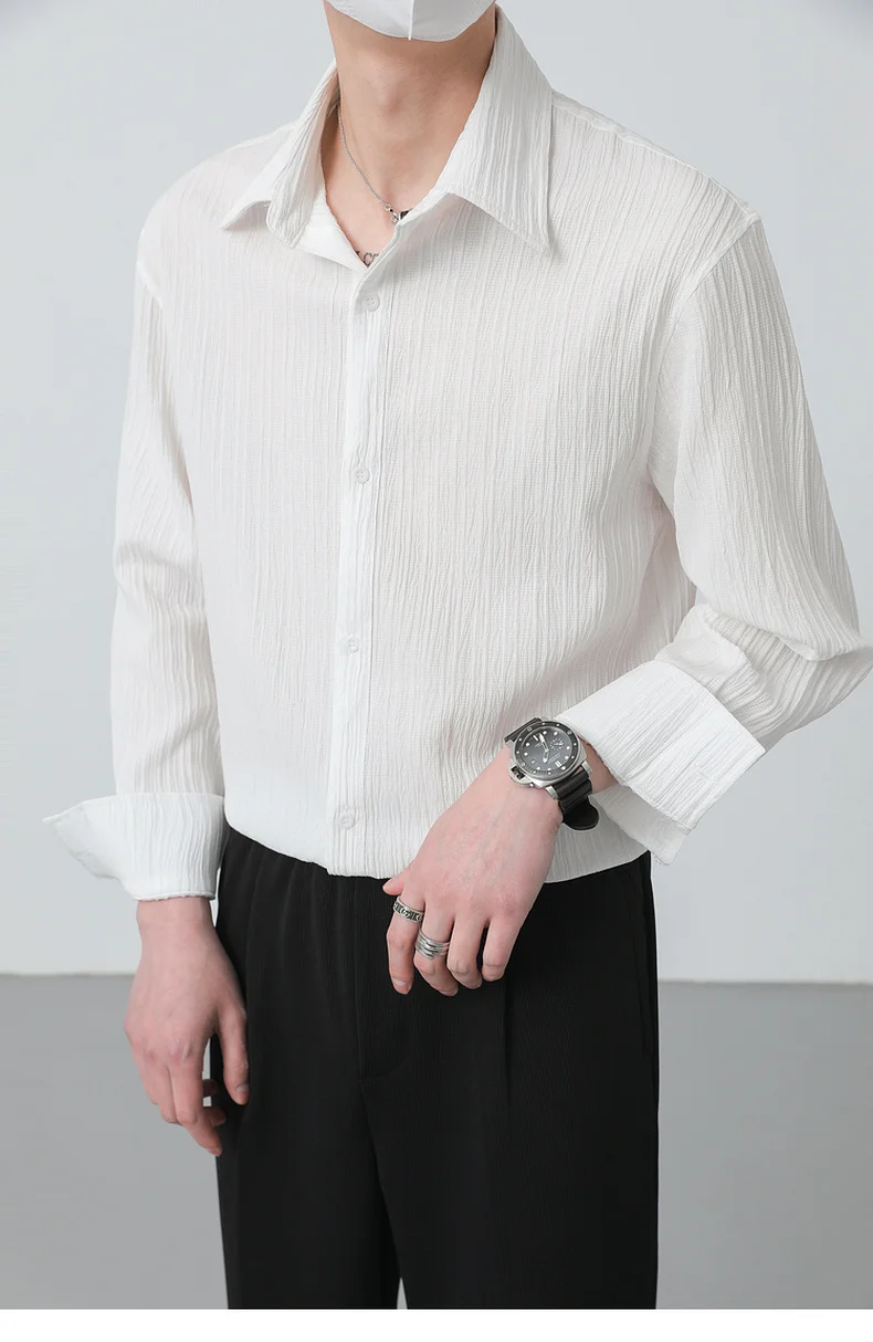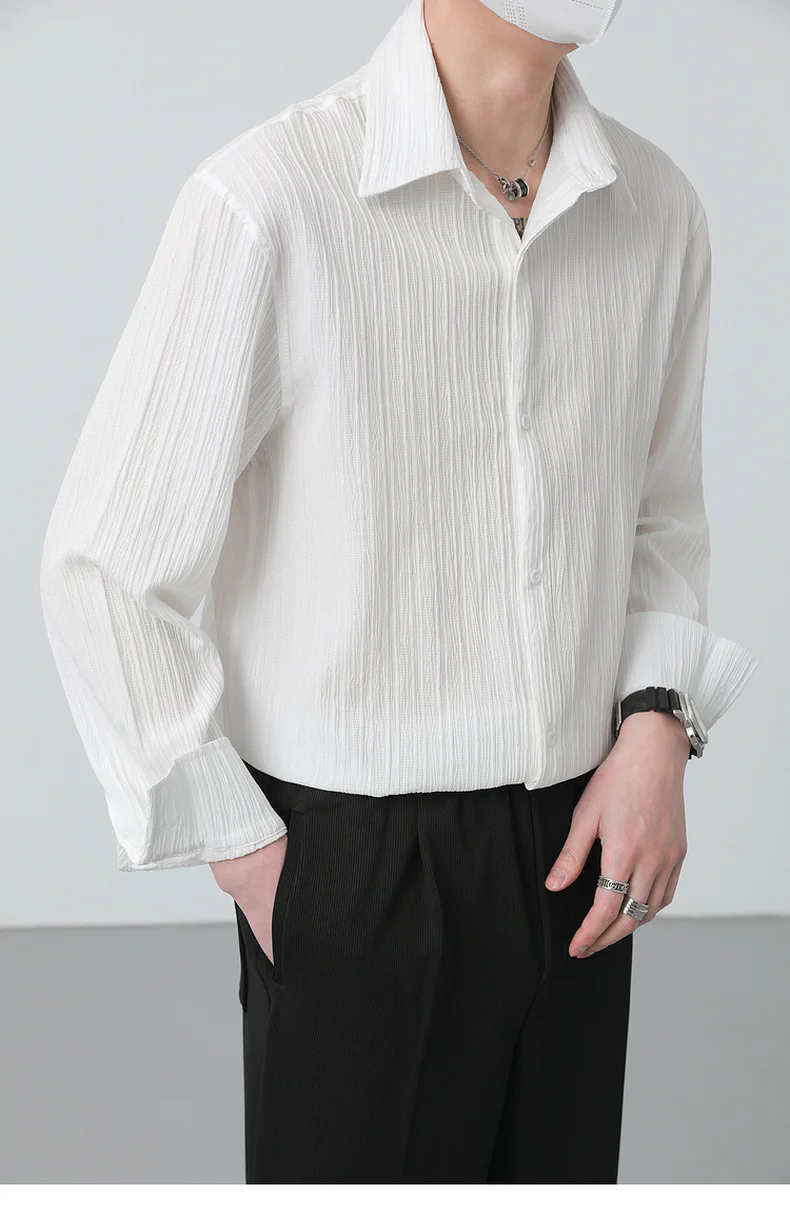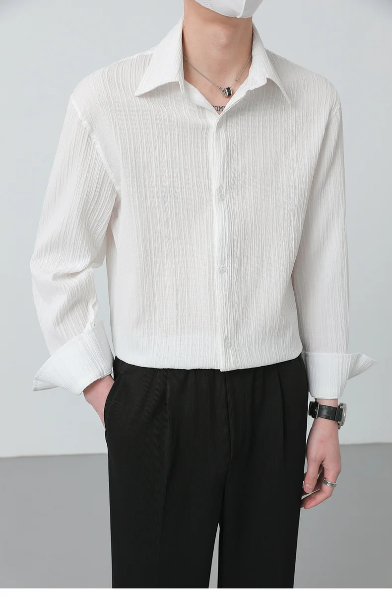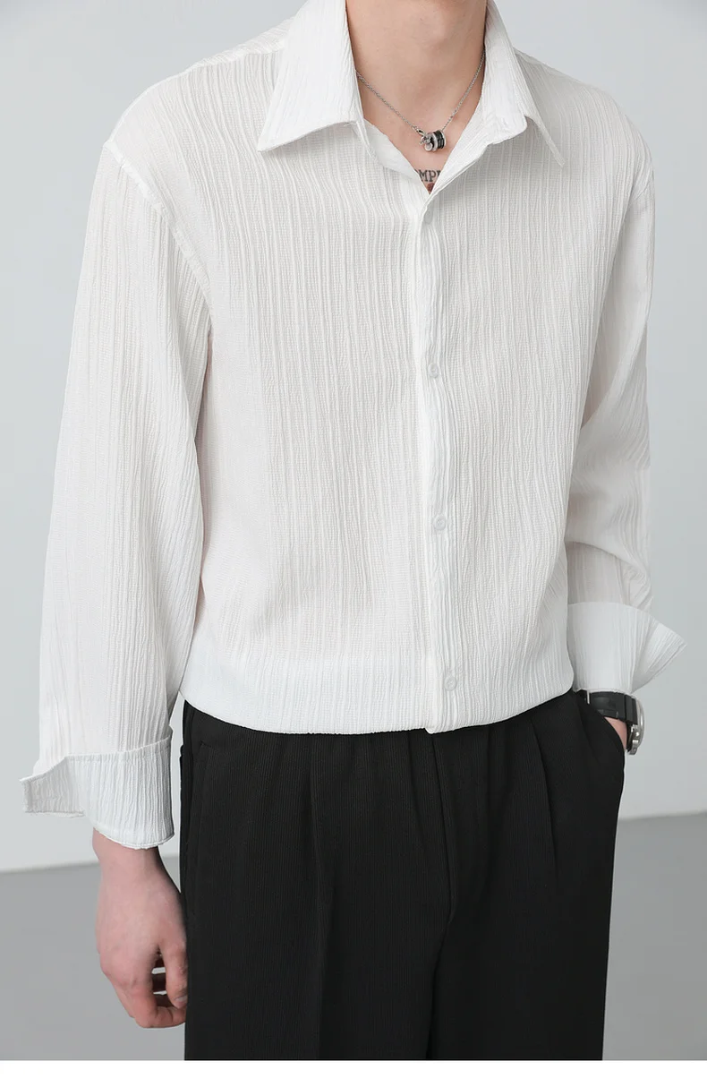 Summer Thin Shirt Men Slim Fit Fashion Social Men Dress Shirt Korean Casual White Long Sleeved Shirt Men Pleated Shirts M-2XL
