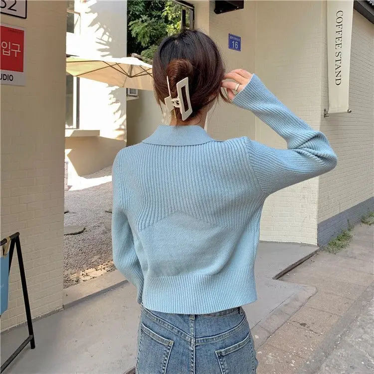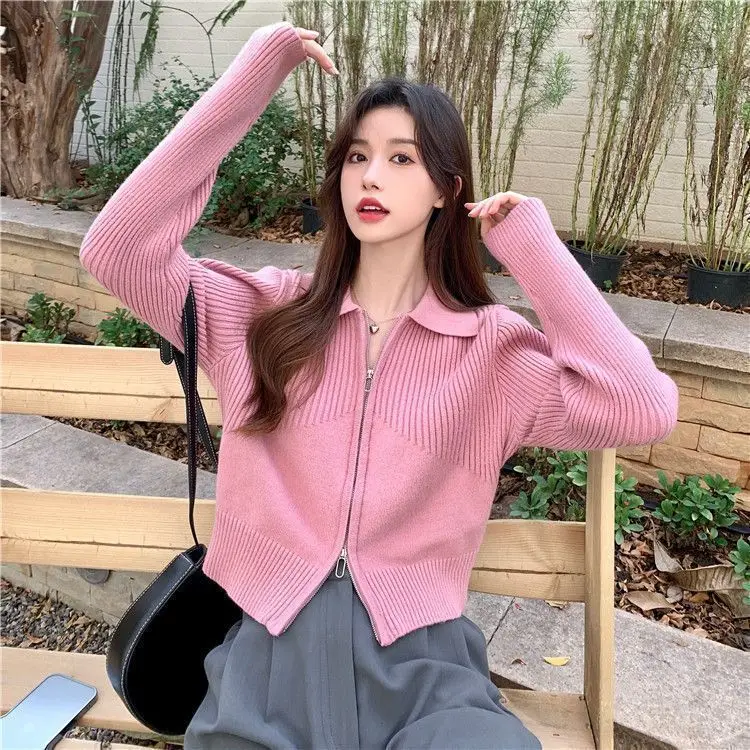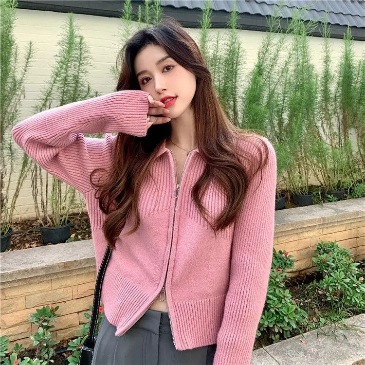 Sweet Cute Solid Zipper Pullovers Women Fashion Leisure All-match Retro Simple Vintage Loose Female Zipper Knitwear Top