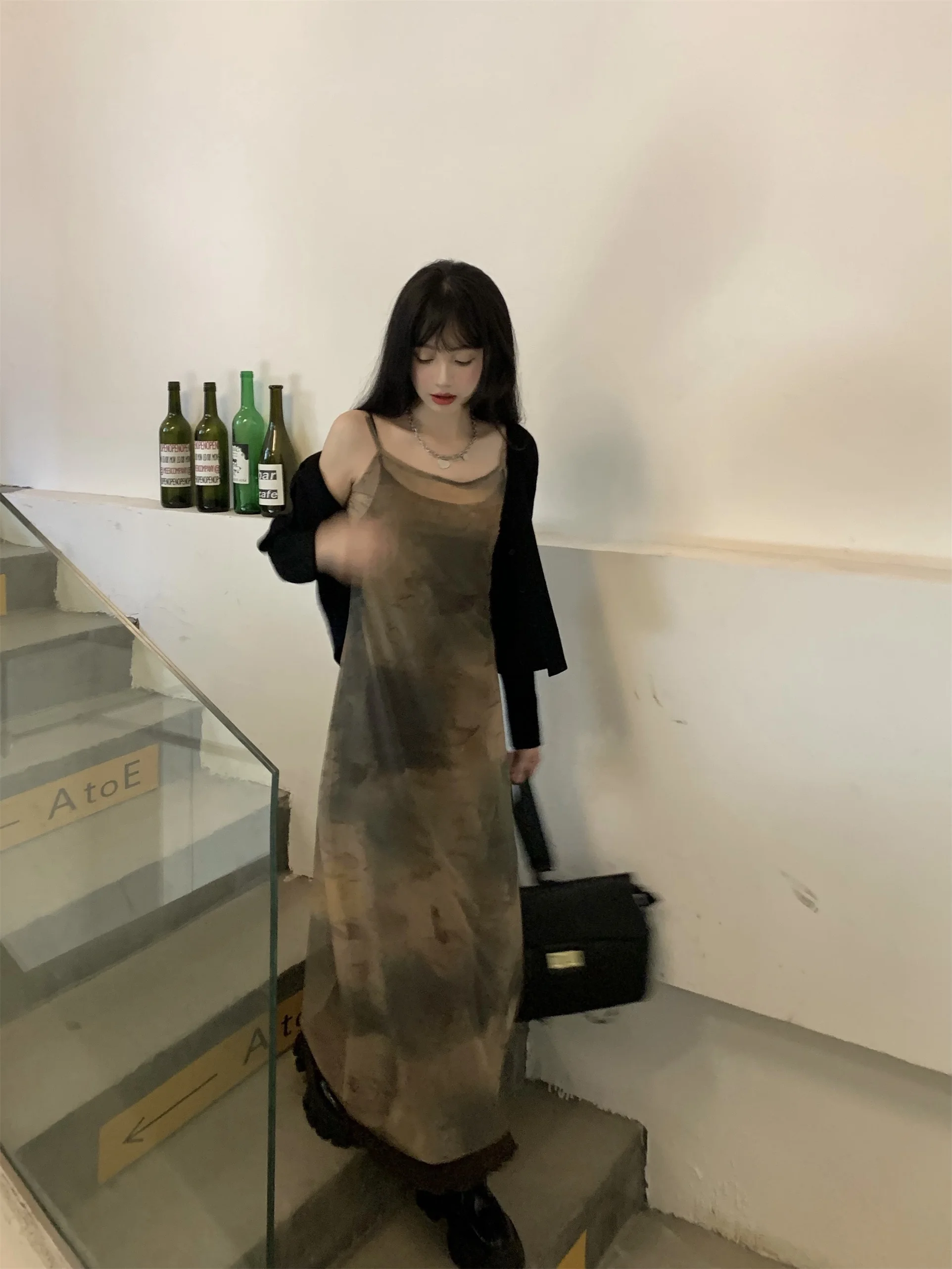 Tie-dye Gauze Suspender Dress Women 2024 Spring Korean Retro Strapless Mid-length Dress + Black Knitted Cardigan Two-piece Suit