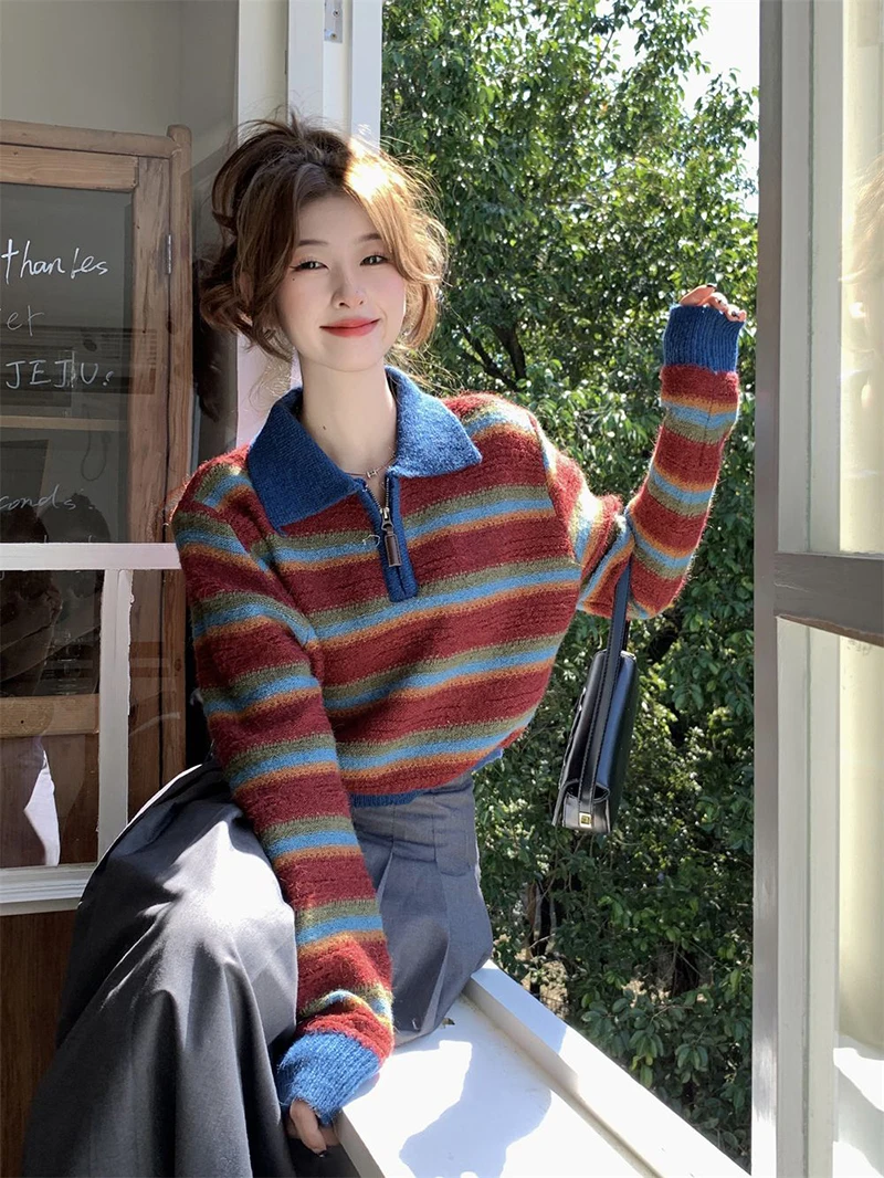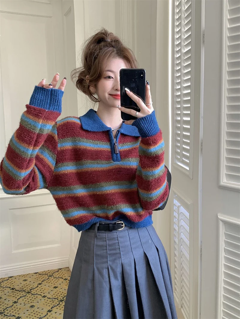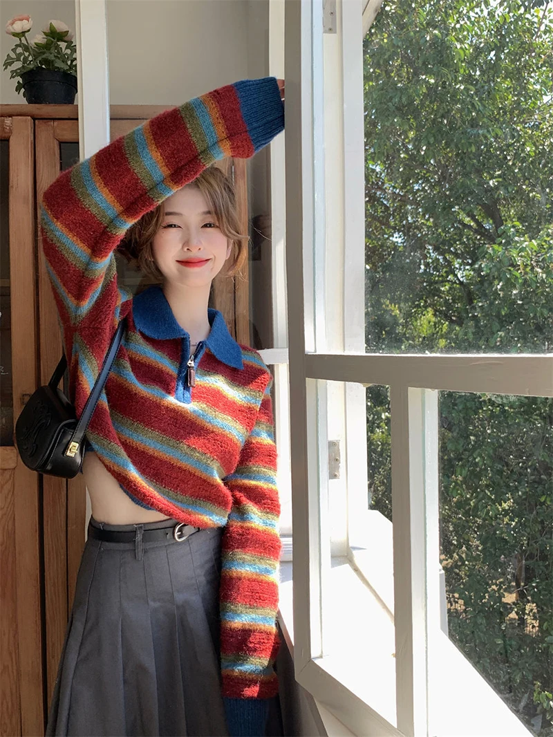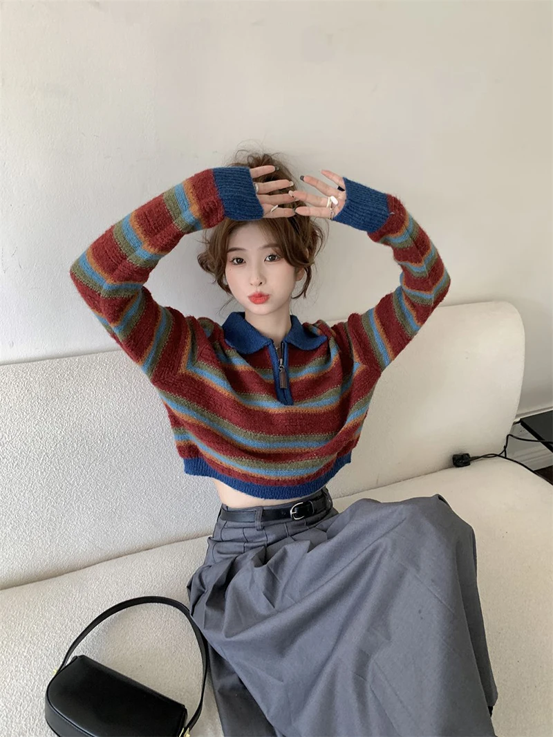 Voguable Vintage Harajuku Striped Sweater Women Sexy Cropped Knitted Pullover American Retro Turn Down Collar Design Casual Tops