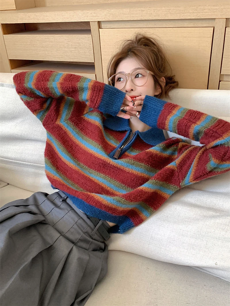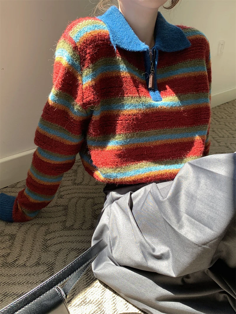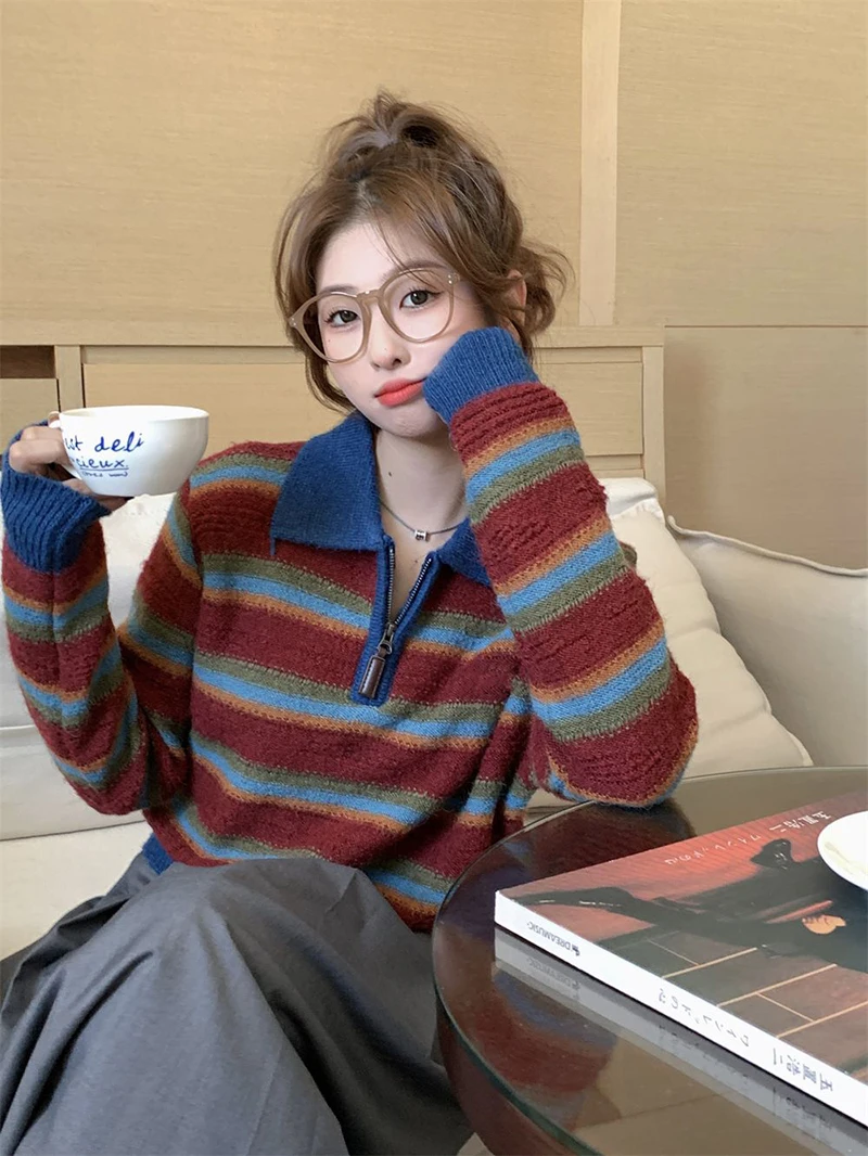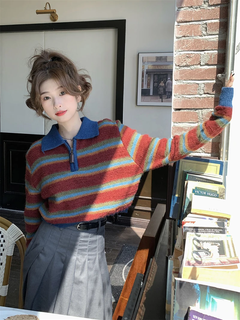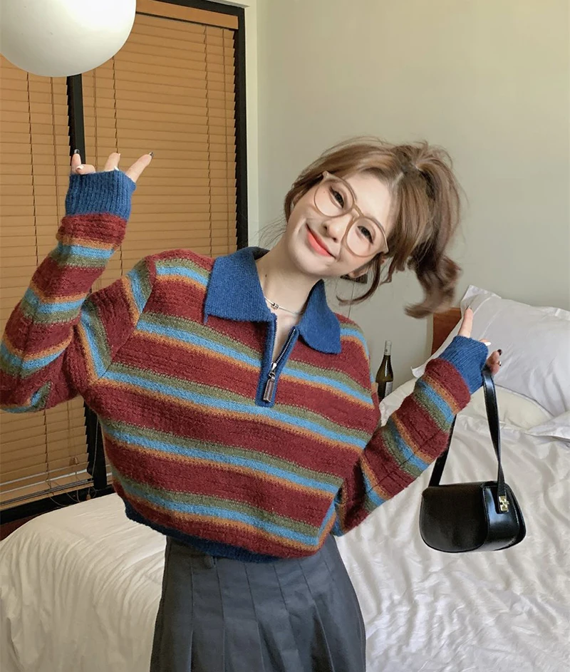 Voguable Vintage Harajuku Striped Sweater Women Sexy Cropped Knitted Pullover American Retro Turn Down Collar Design Casual Tops