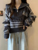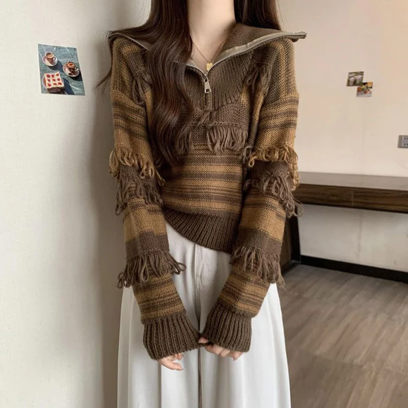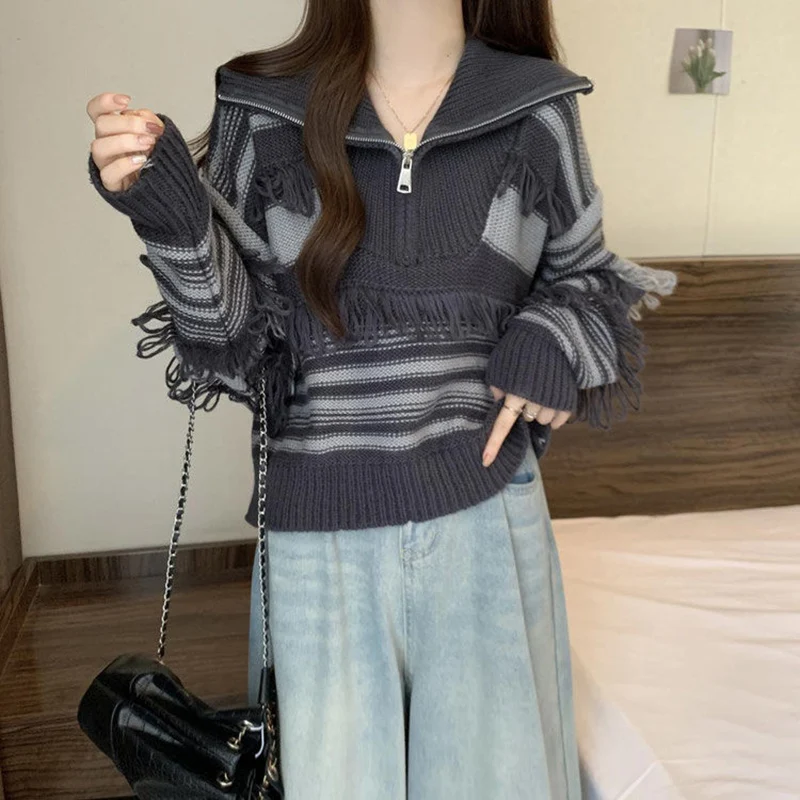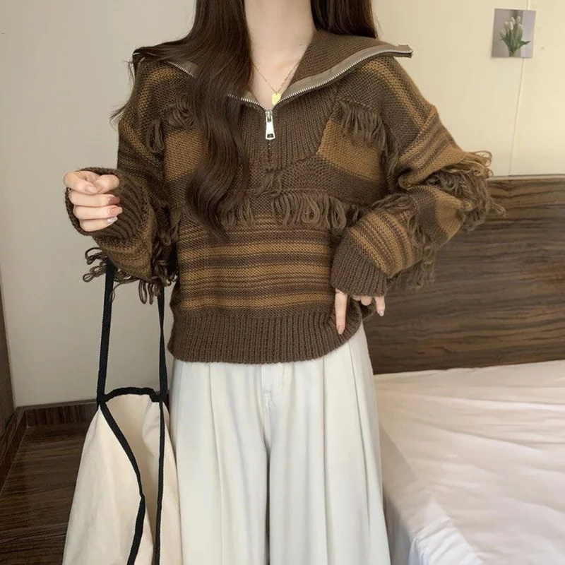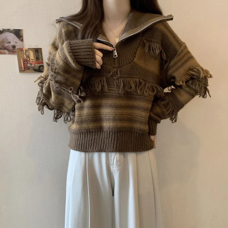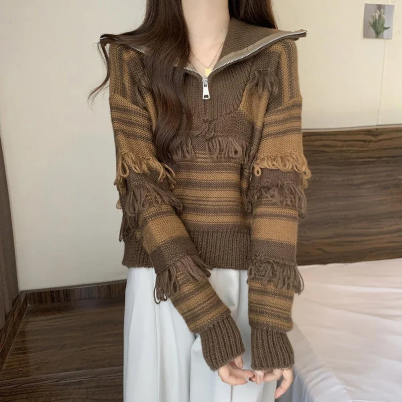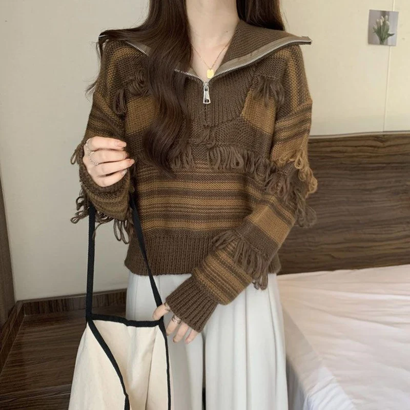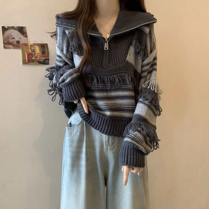 Voguable Vintage Tassel Striped Knitted Sweater Women Harajuku Casual Loose Jumper Korean Retro Long Sleeve Zipper All Match Tops