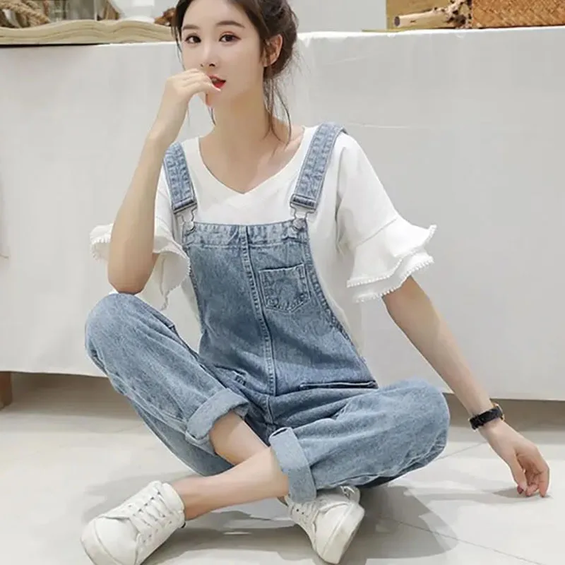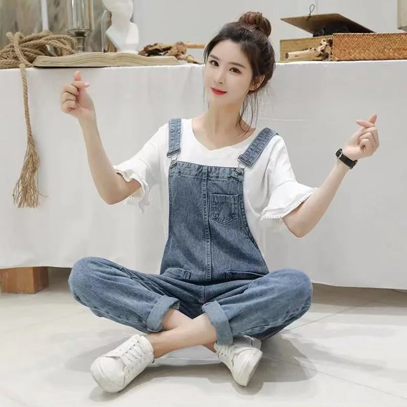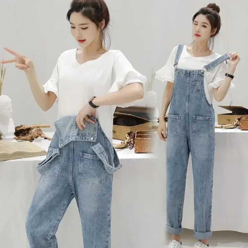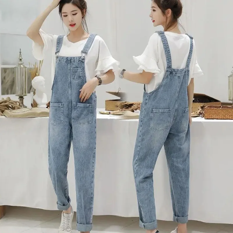Washed Denim Jumpsuit Women Casual High Waist Blue Wide Leg Pants Female 2024 Spring Korean Loose Pockets Jean Overalls