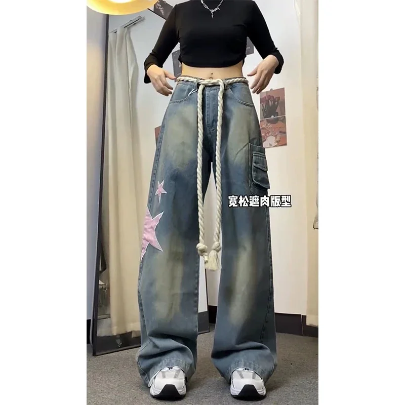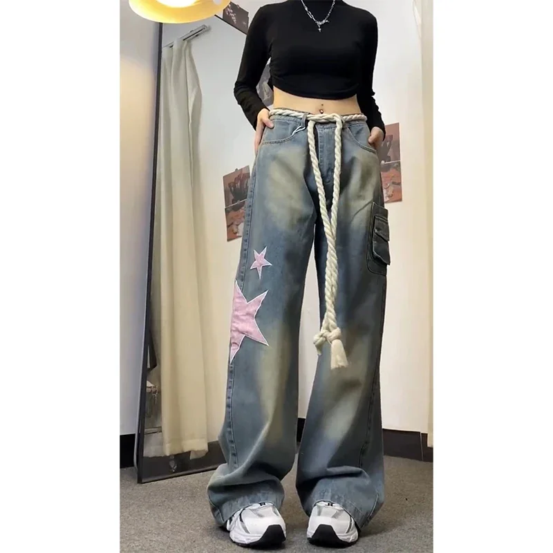 Women Baggy Star Jeans Vintage Harajuku Oversize High Waist Denim Trouser Emo 2000s Y2k 90s Aesthetic Wide Pants Trashy Clothes